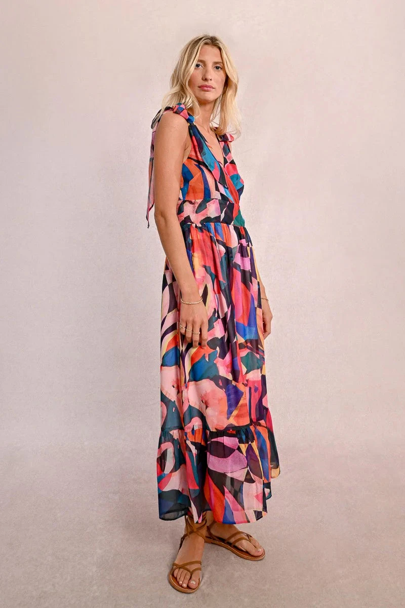 A sleeveless abstract print maxi dress with ties at the shoulders. This dress has a v-neck, a banded waistline, and a long gathered skirt with a ruffle at the bottom. There is a side zip closure, is lined, and does not have pockets.