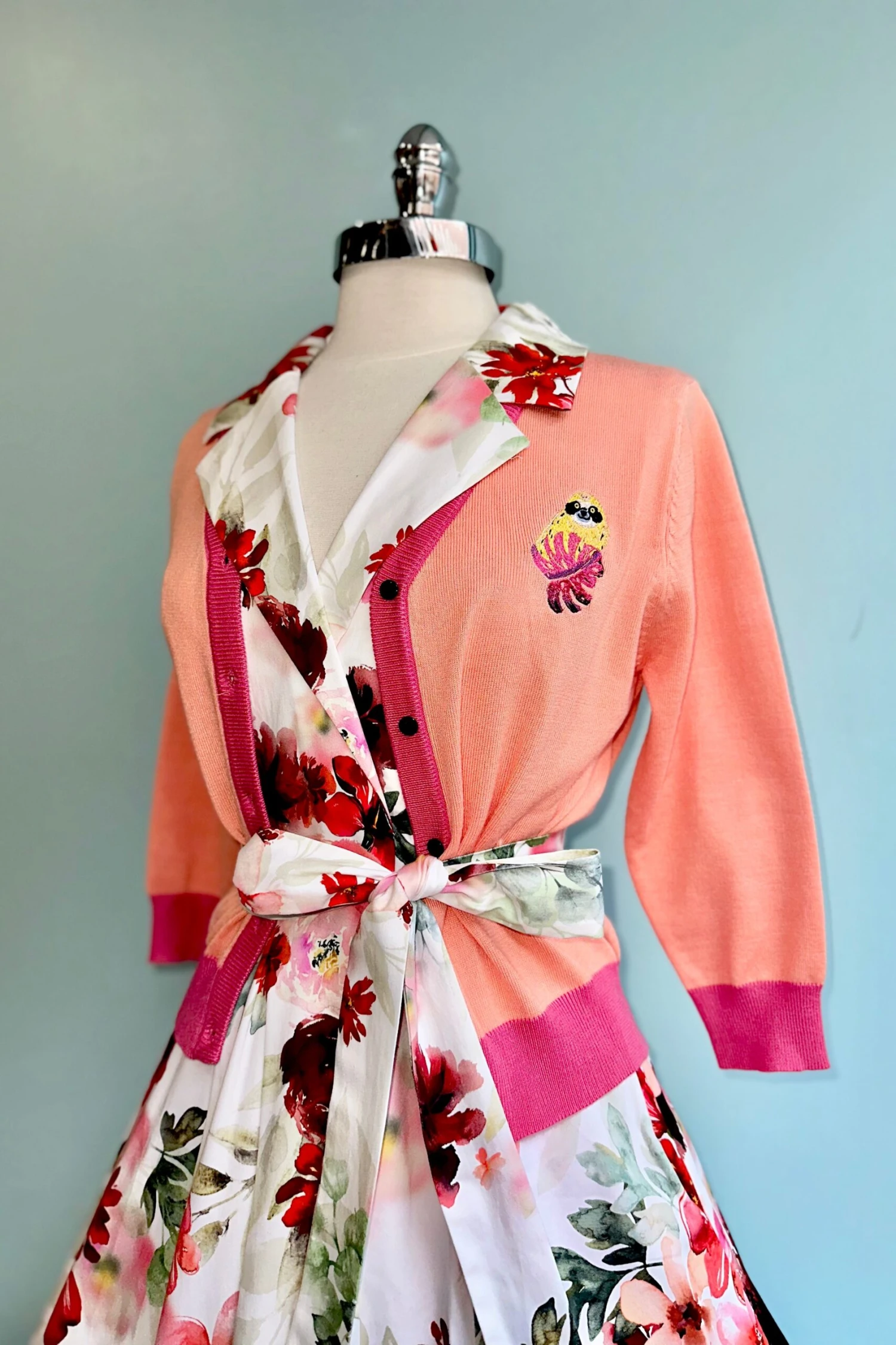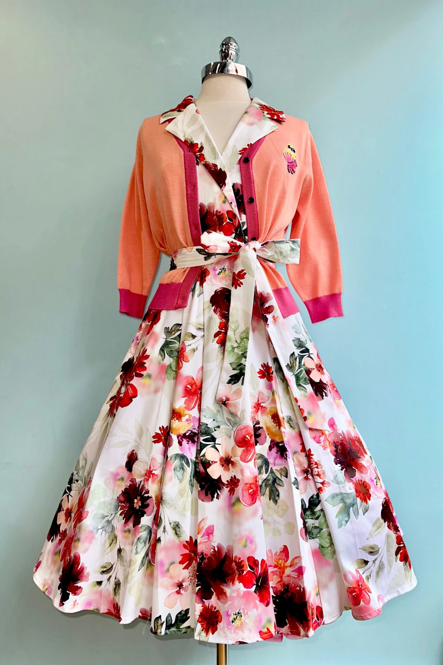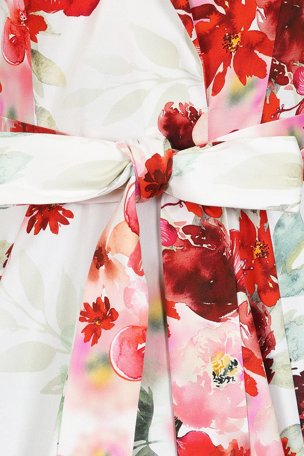 A sleeveless dress featuring a lapel collar and an overlapped front with a secure snap closure. Designed with hidden side pockets, a removable tie sash belt, and side zipper. The fabric has a floral print, with a white base adorned with red and pink florals, and beige and green leaves.