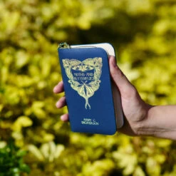 Vinyl wallet made to look like the book Alice in Wonderland. The print is in gold and is printed on the front and back. There is a snap closure and opens up to a cloth and vinyl lining. There are 10 card slots, a zip coin section and 2 open pockets. The wristlet strap measures 6″ and is removable.