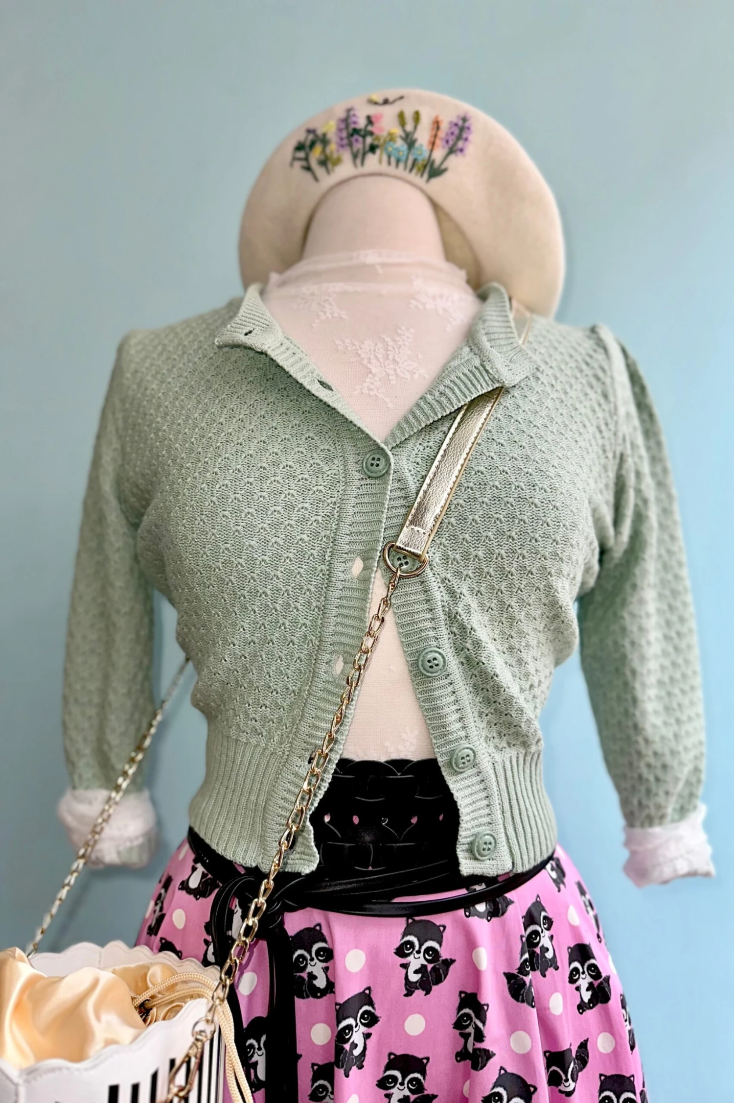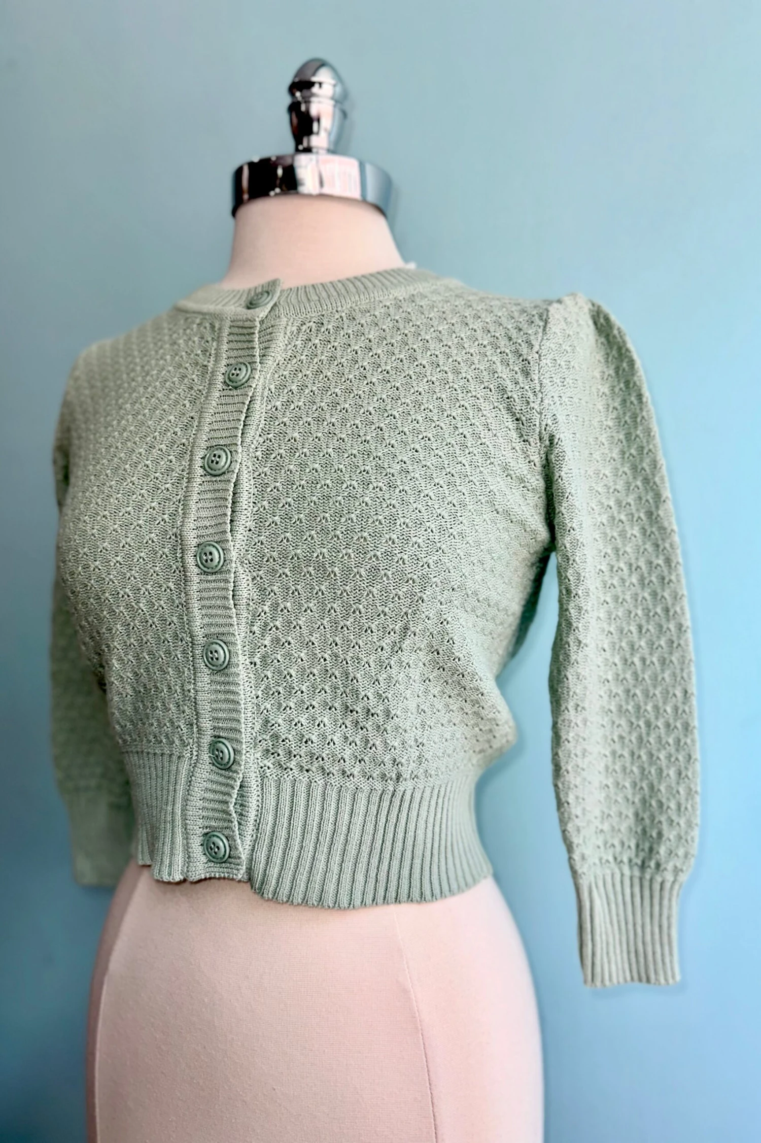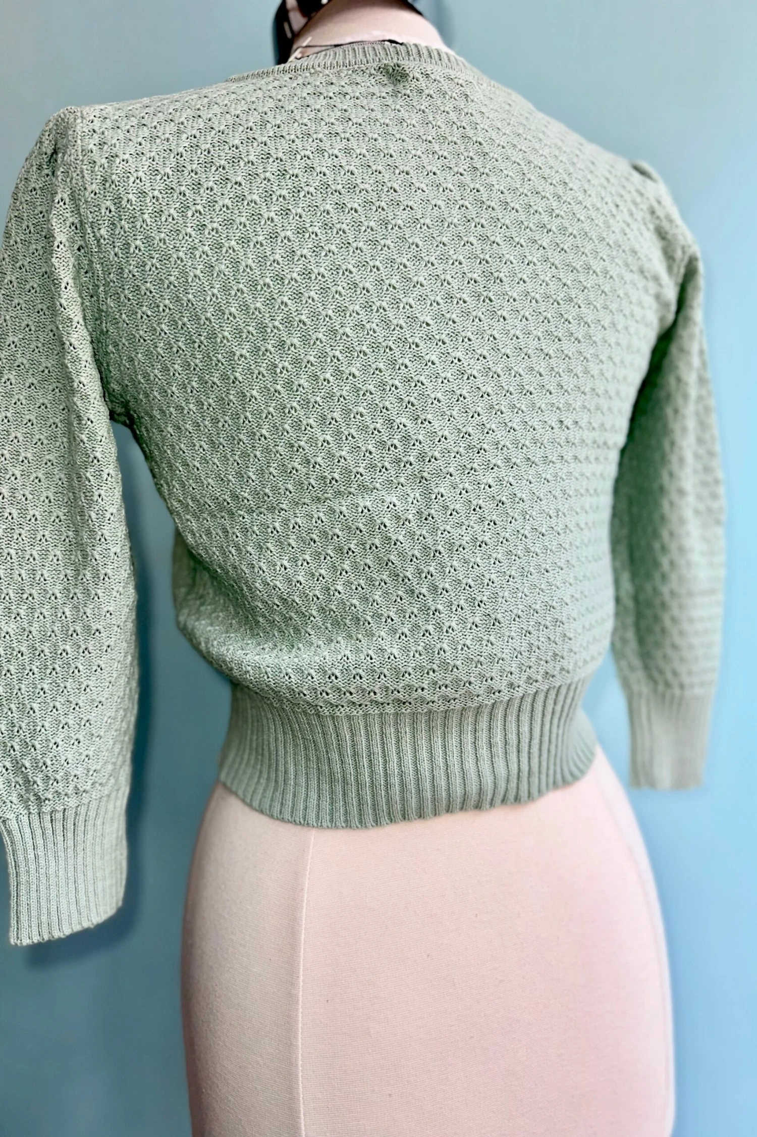 Aqua 100% Cotton Knit Cardigan. This sweater is super cozy and a great alternative to the perfect cropped cardi! We like to belt these over dresses. The sleeve has a little puff and is slightly longer than a 3/4. There is stretch but we recommend getting your normal size.