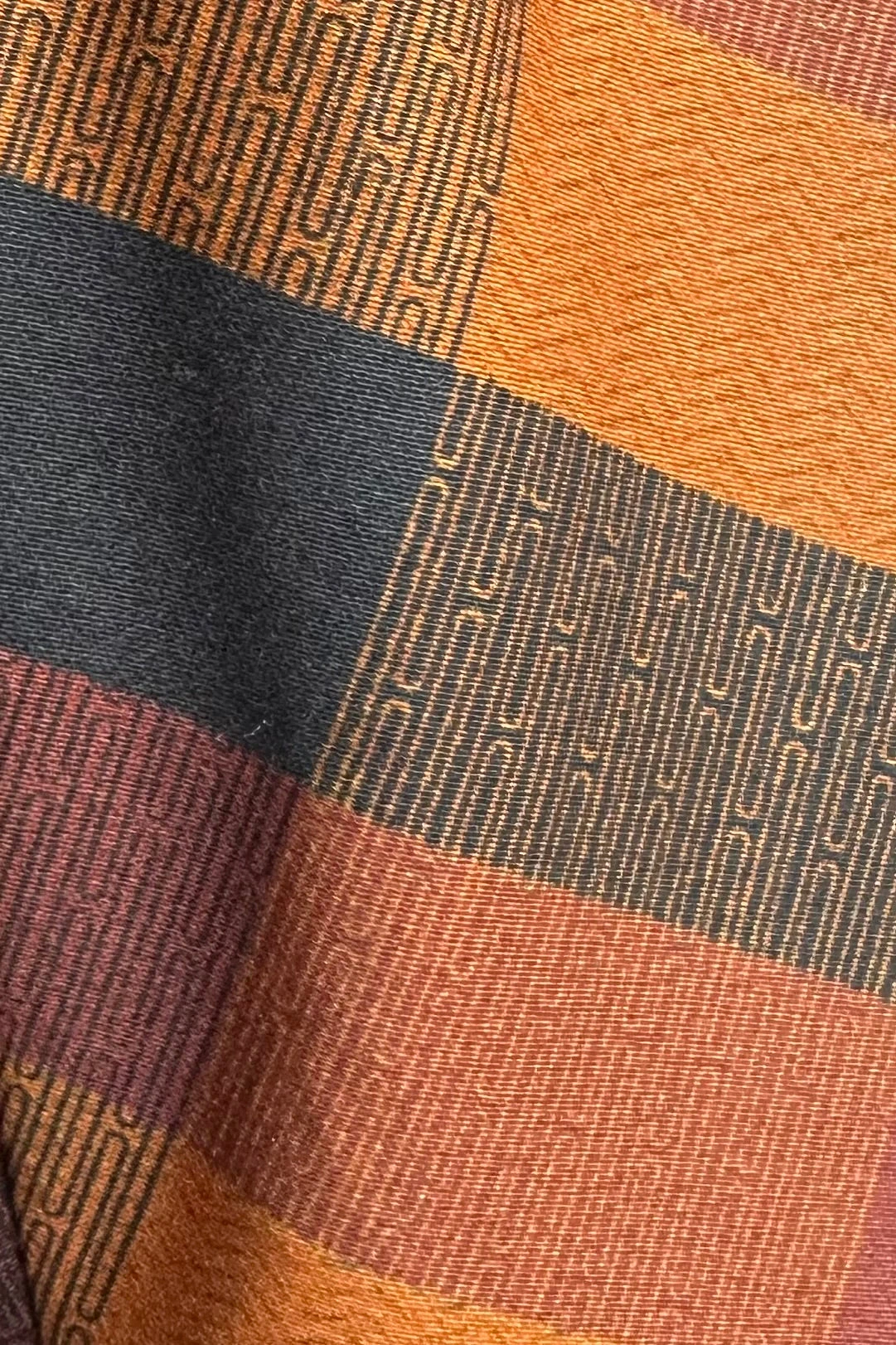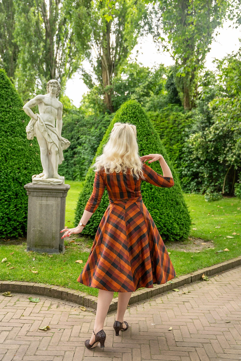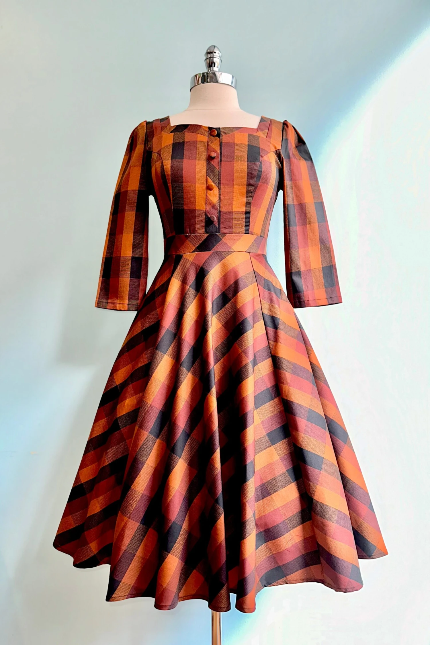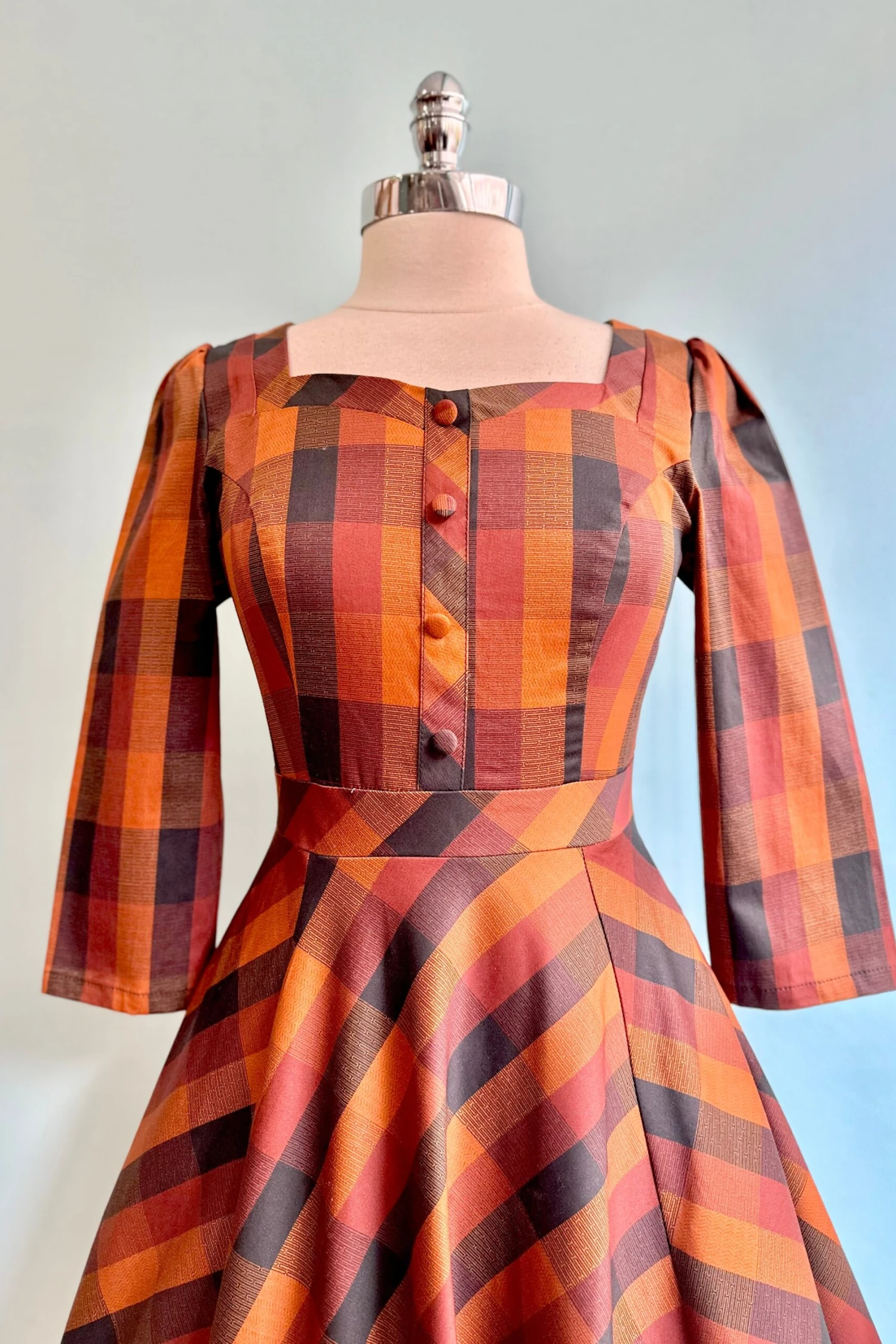 Plaid dress in rust orange, browns and black with a sweetheart neckline. This dress has 3/4 sleeves, decorative front summarys and a full skirt with side pockets. The sleeves have a little puff at the shoulder. Perfect fall dress!