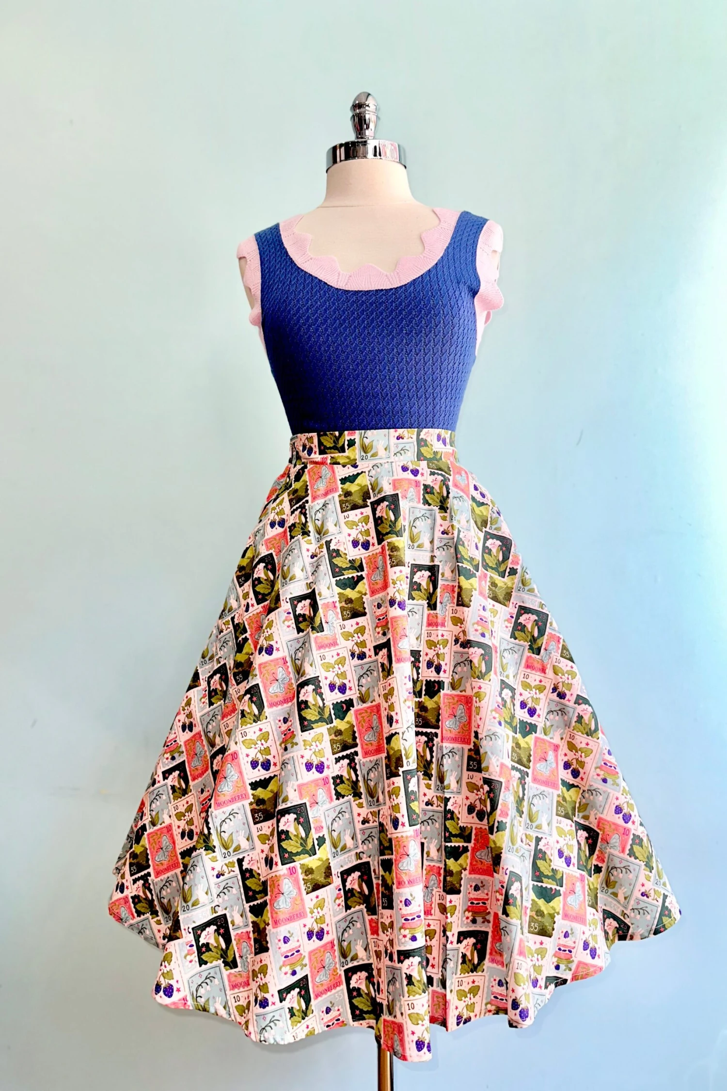 Tank top with scalloped trim at the shoulder straps, neckline and hem. This sleeveless sweater is made of a pointelle knit and has a azure blue body with lilac contrast.