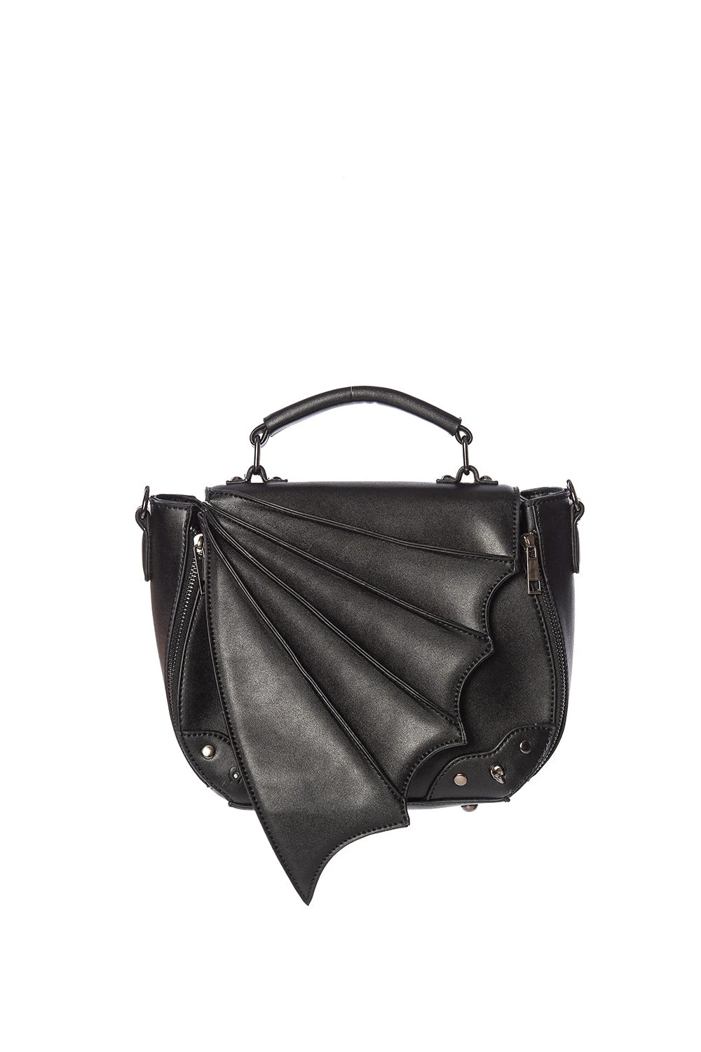 Bat wing bag made of polyurethane. Has a little handle strap and a messenger! Has one big zip section and a pocket zip.