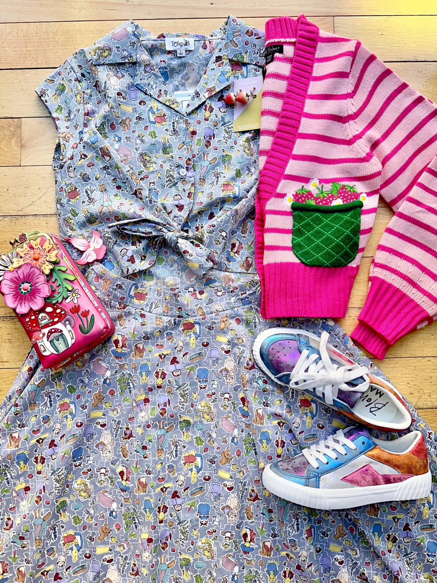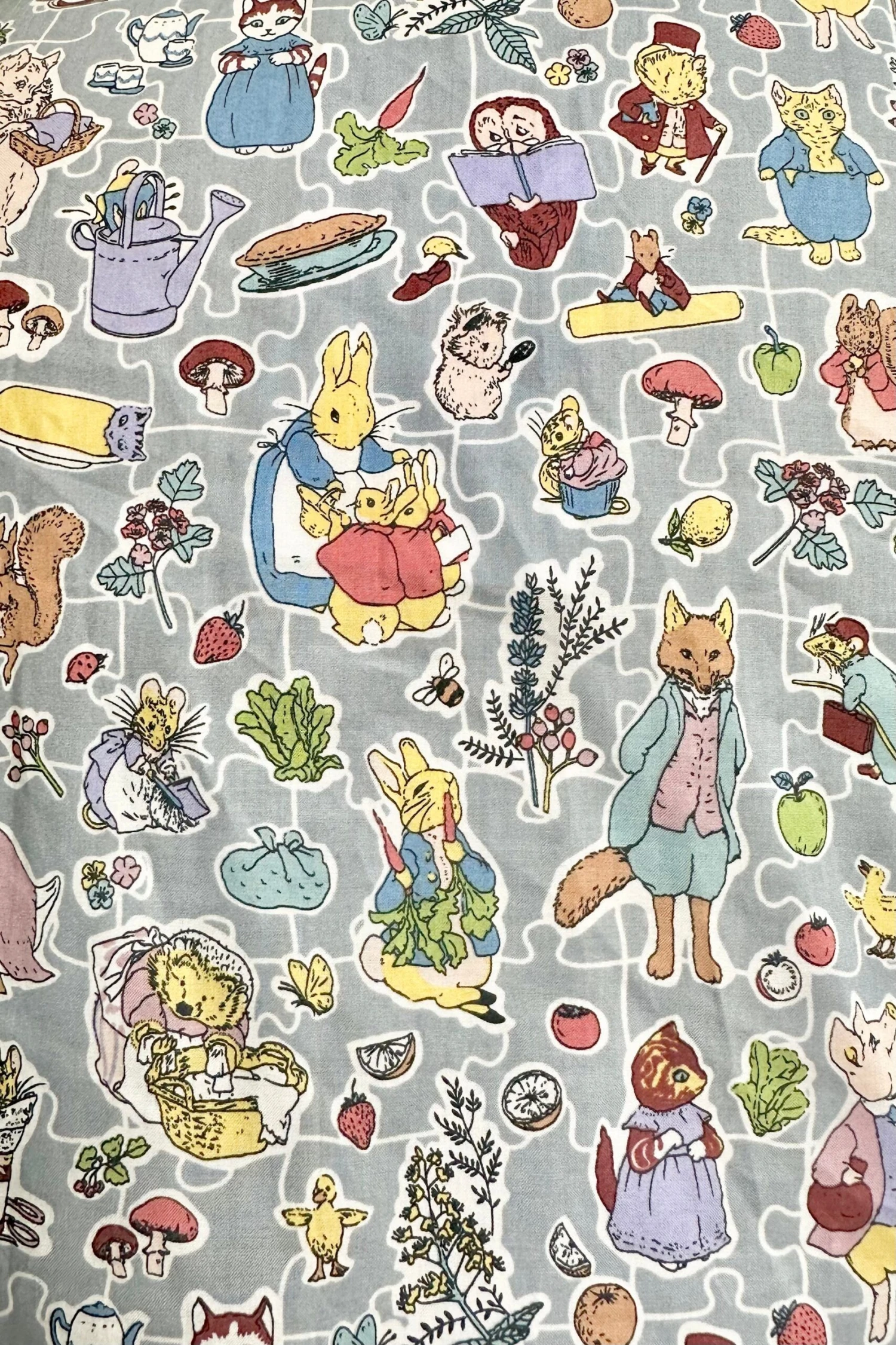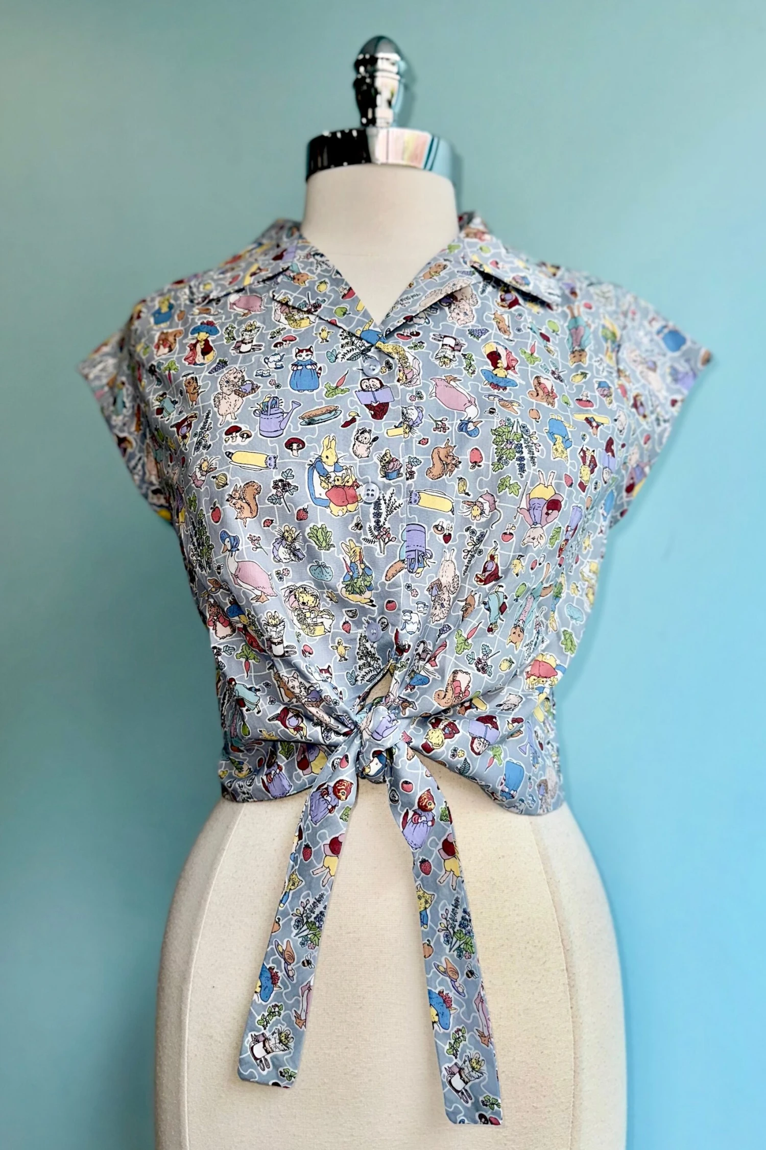 Blue summary down top with a print of all our favorite Beatrix Potter characters! The fabric is laid out like a puzzle with white outlines of puzzle pieces. This top has a summary front, fold over collar and a tie at the waist to fasten. This is a cropped length and has capped sleeves.
