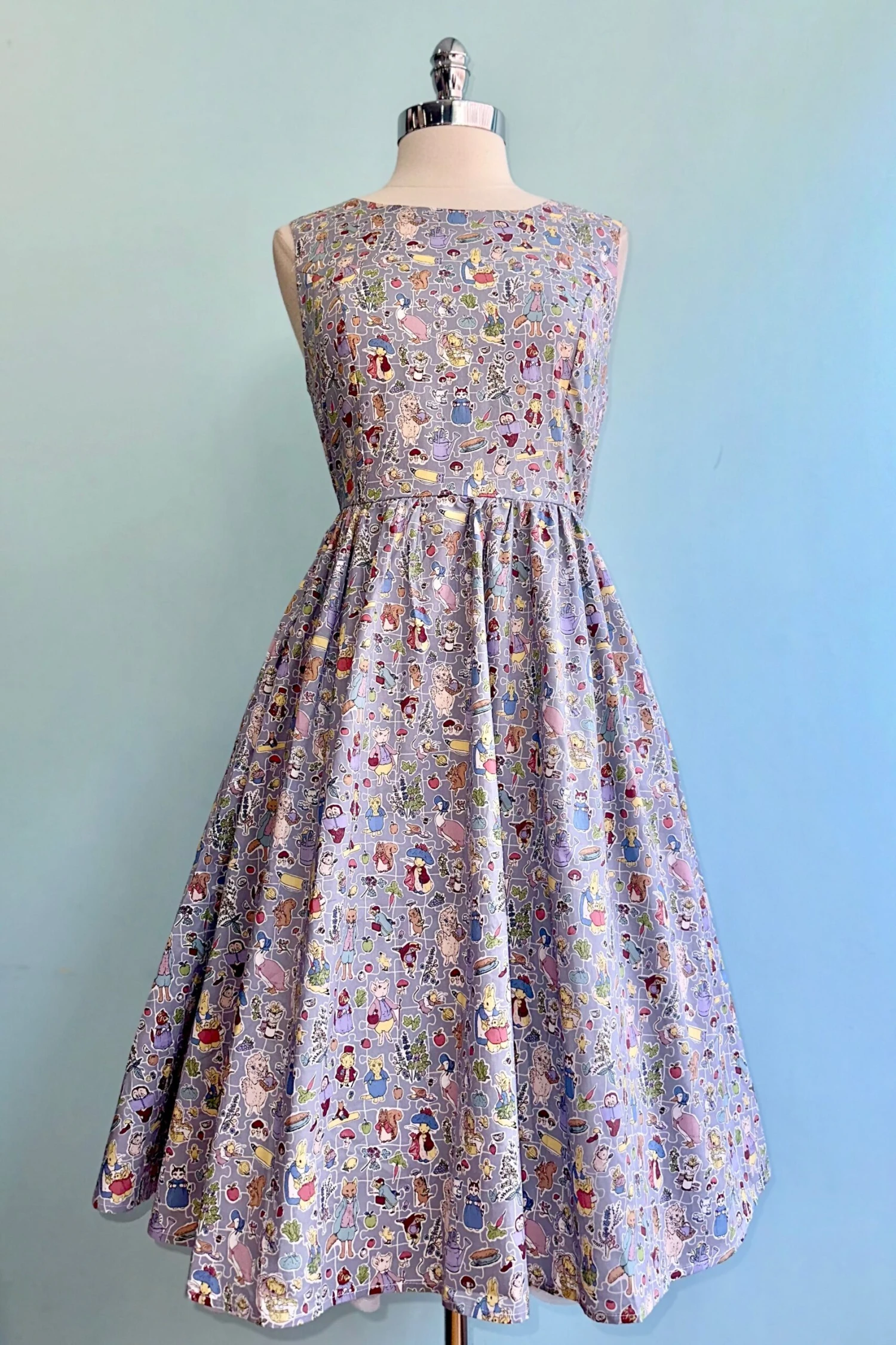 Blue dress with a print of all our favorite Beatrix Potter characters! The fabric is laid out like a puzzle with white outlines of puzzle pieces. This is a simple tank style with a gathered waist with elastic at the back and a back zip. The fabric is a soft brushed cotton and is fully lined. The skirt is nice and full and has hidden side pockets.