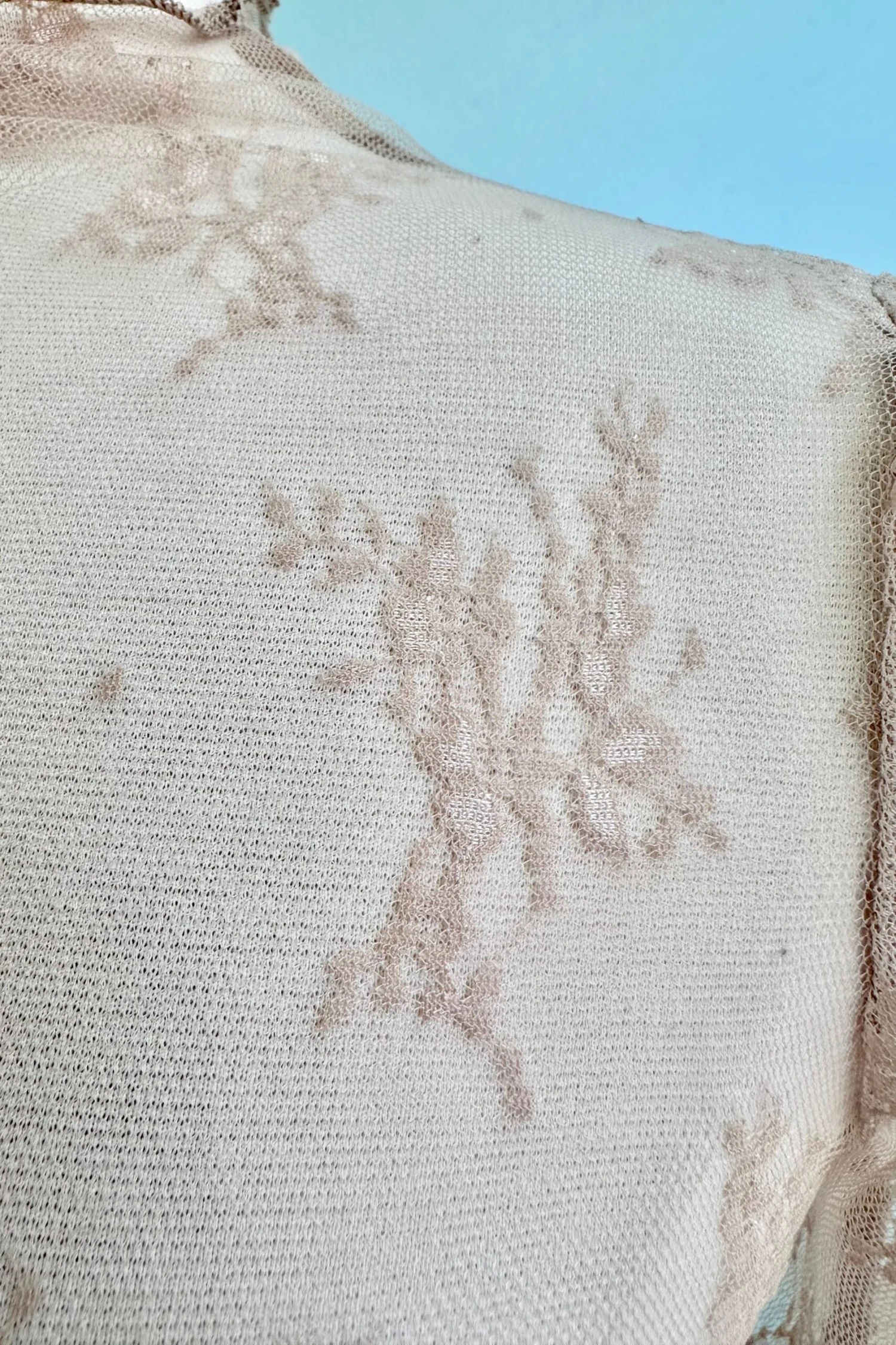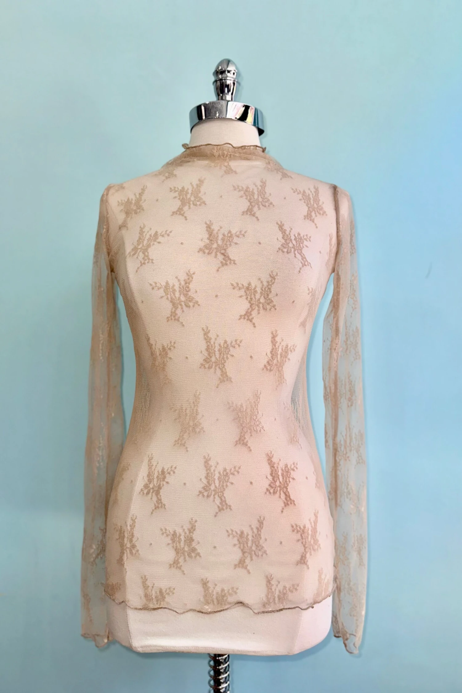 Sheer top in beige mesh with flowers throughout. This top has a mock neck and long sleeves with thumb holes! This is a great layering top! Not lined.