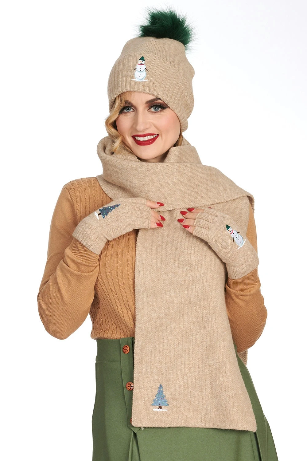Knit scarf in beige with an embroidered blue tree on the front.