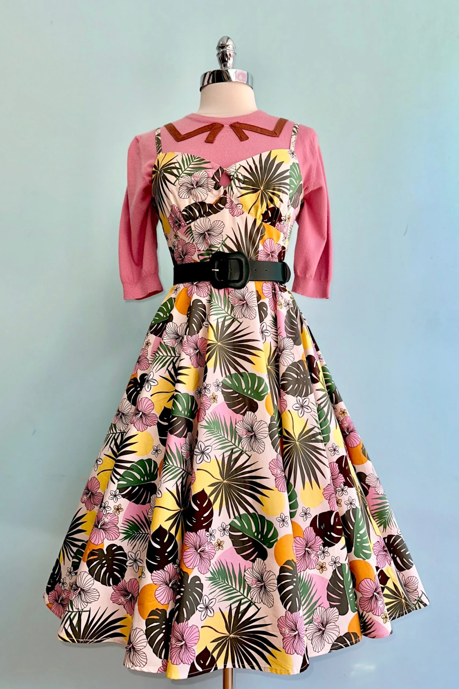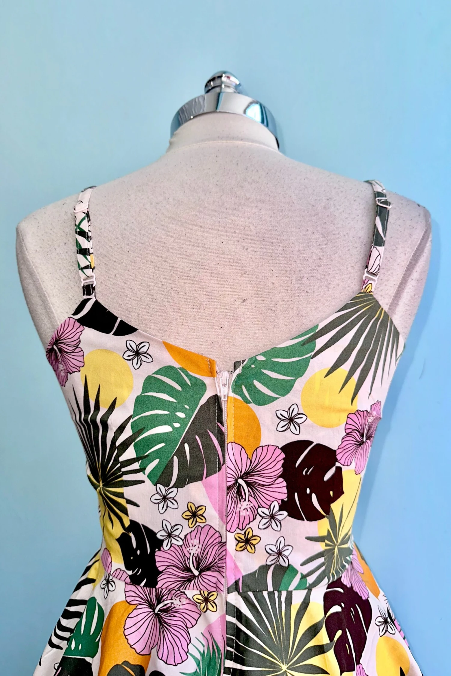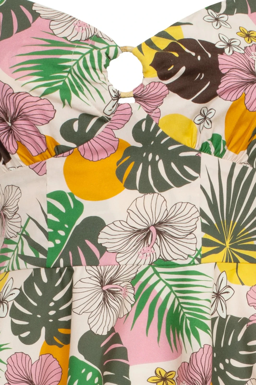Made from printed cotton, this 50s style dress features an ivory base with big pink tropical flowers, yellow and orange dots and green leaves The sweetheart neckline with ring keyhole and adjustable spaghetti straps add a touch of elegance, while the fitted bodice and flared skirt create a flattering silhouette. With pockets in the side seams and a zip fastening on the center back, this dress combines practicality and style.