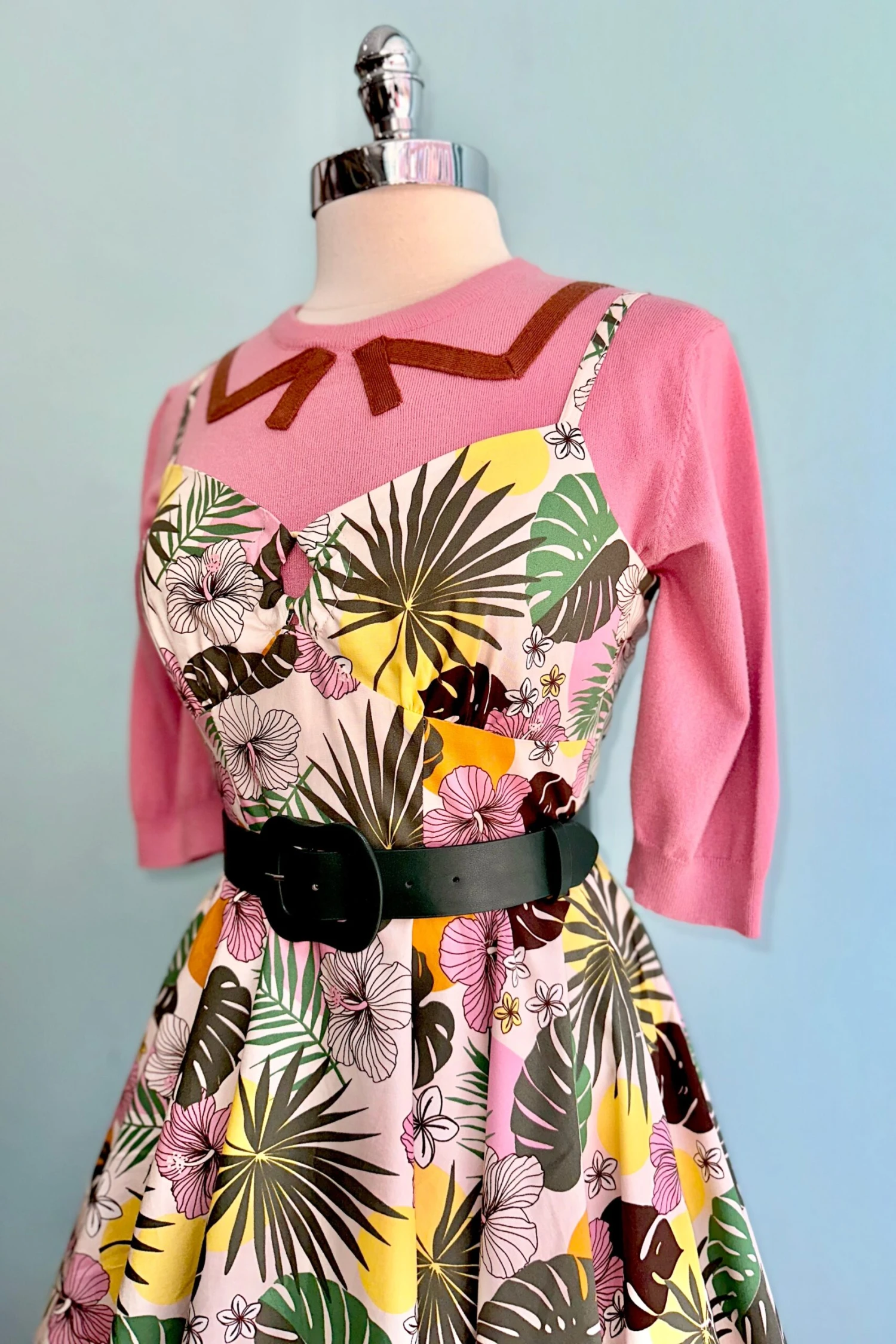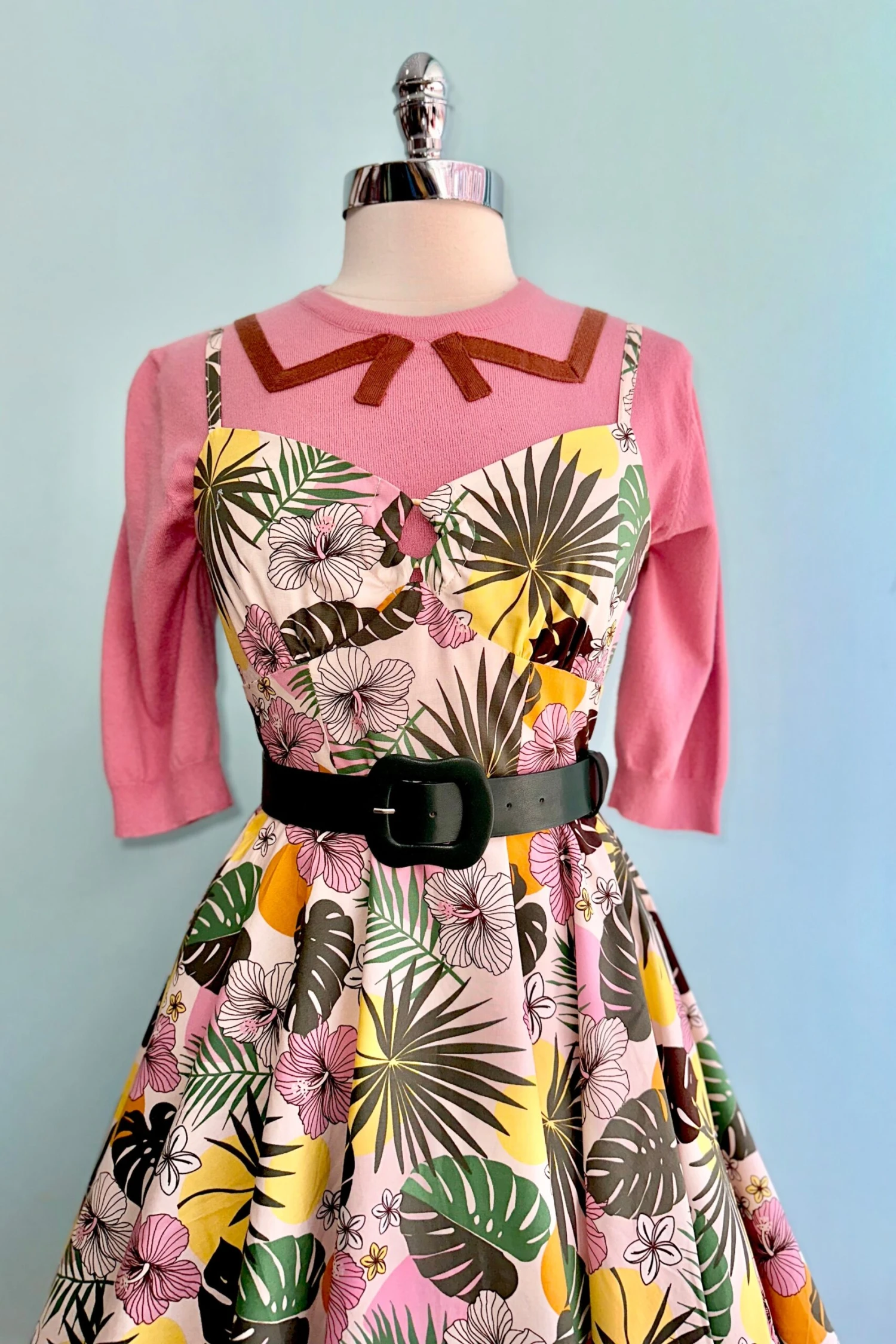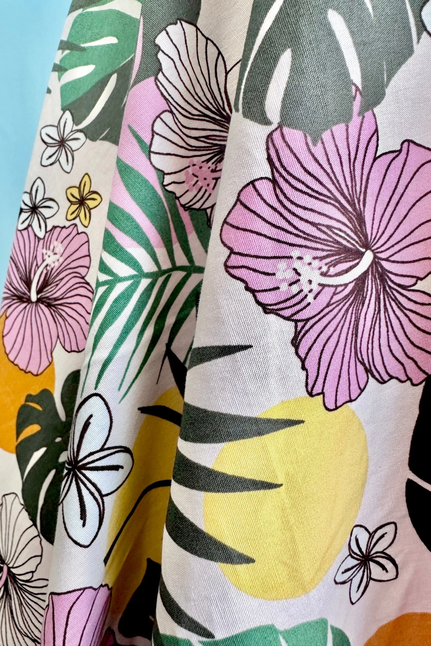 Made from printed cotton, this 50s style dress features an ivory base with big pink tropical flowers, yellow and orange dots and green leaves The sweetheart neckline with ring keyhole and adjustable spaghetti straps add a touch of elegance, while the fitted bodice and flared skirt create a flattering silhouette. With pockets in the side seams and a zip fastening on the center back, this dress combines practicality and style.