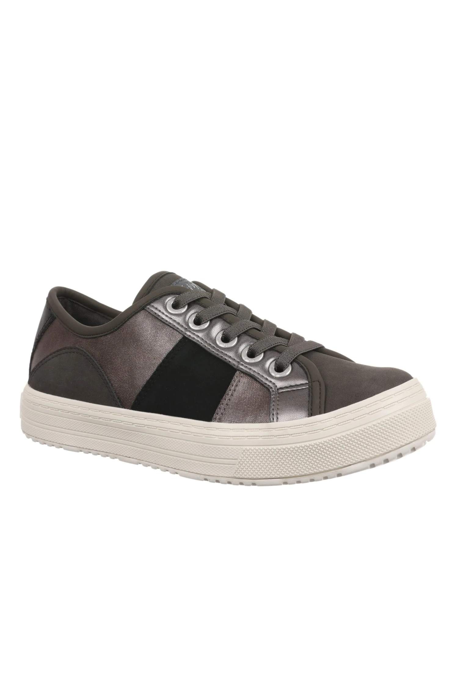 Lace up sneaker in canvas and vegan leather in gunmetal and black. The polyester lining and foam EVA insole provide all-day comfort.