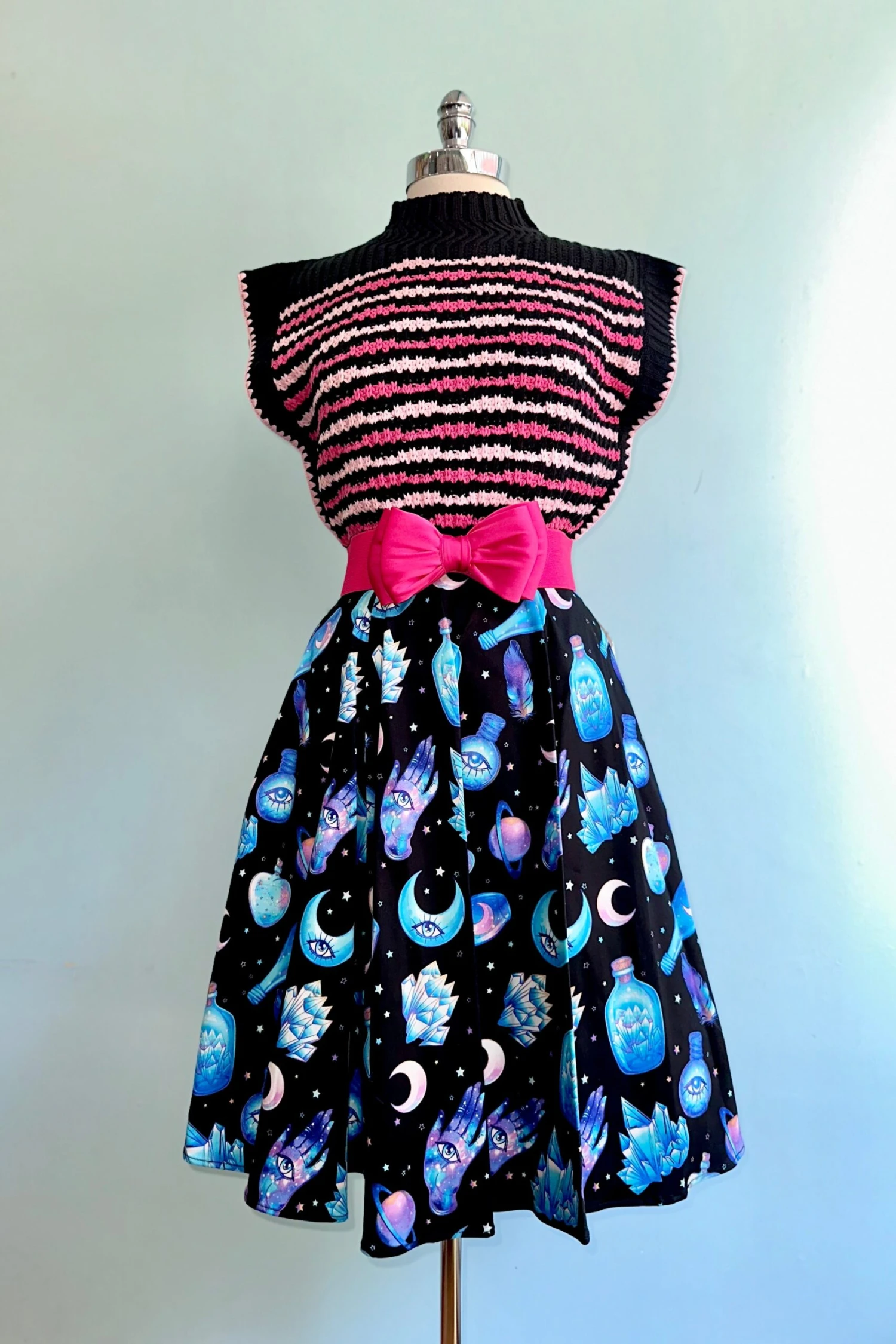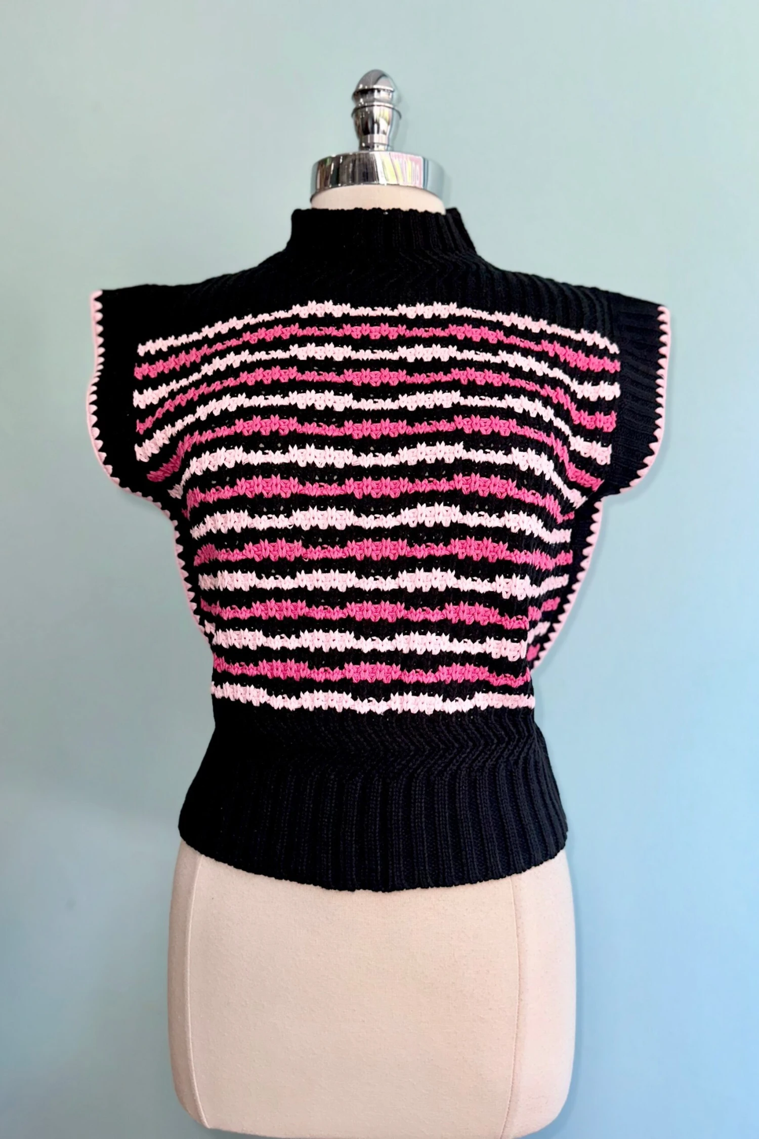 Mock neck sweater vest in black with light pink and magenta contrast stitching. This sweater has a mock neck and ribbed hem reaching just below the waist.