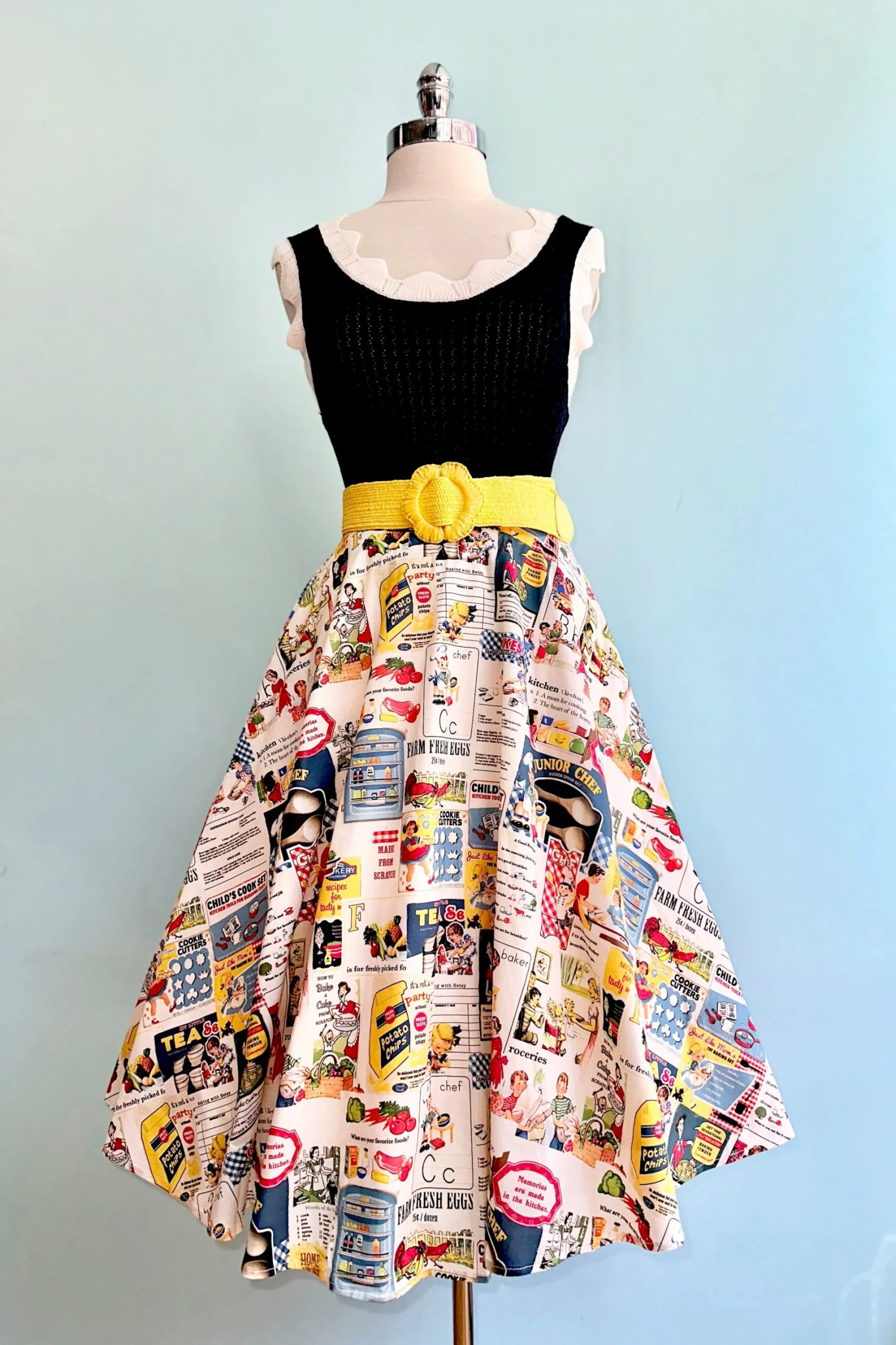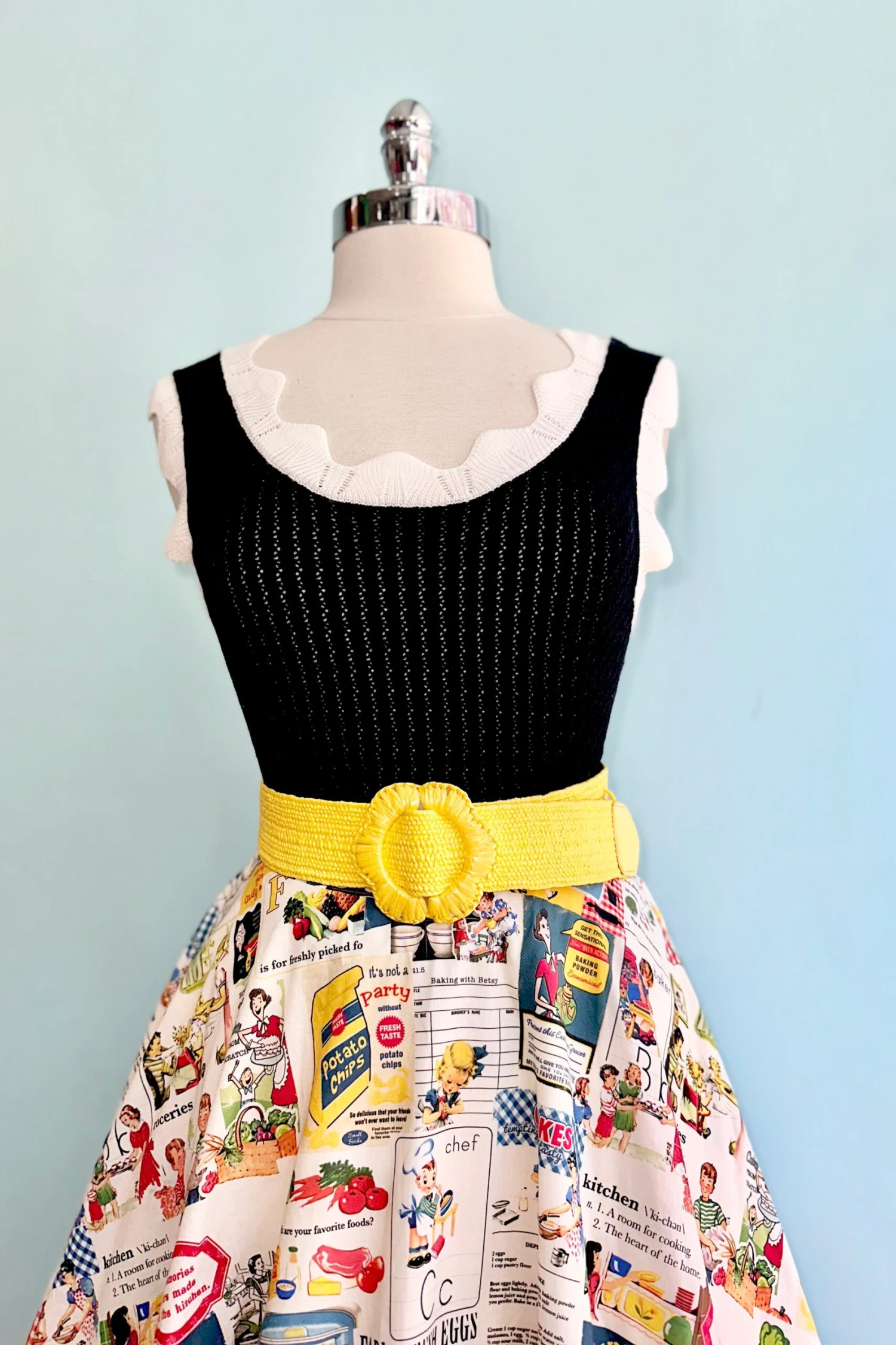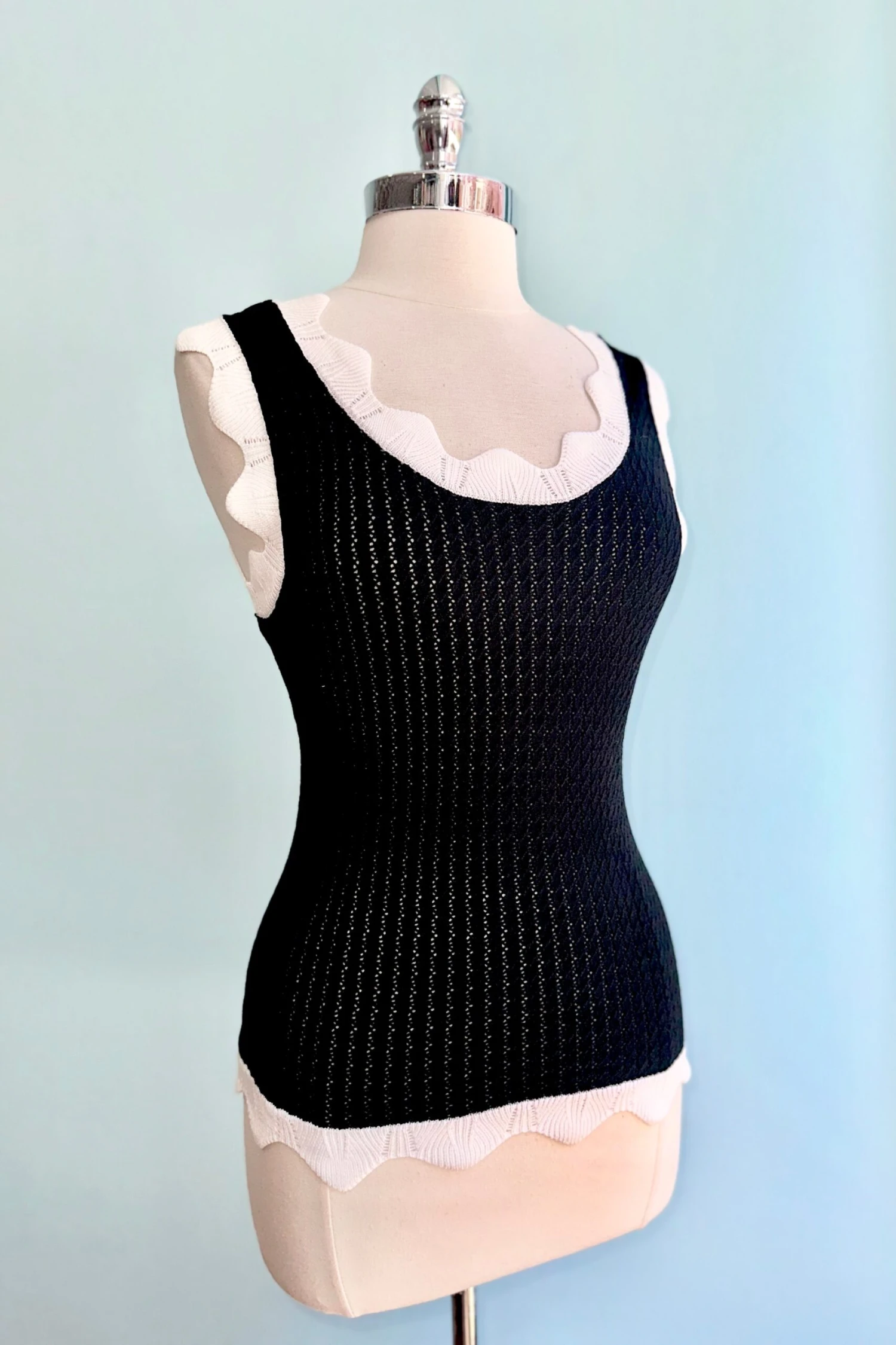 Tank top with scalloped trim at the shoulder straps, neckline and hem. This sleeveless sweater is made of a pointelle knit and has a black body with white contrast.