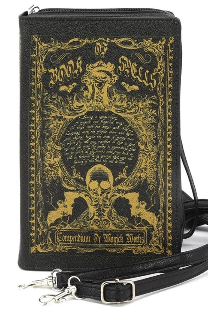Black bag made to look like a book. This bag comes with a short wrist strap and a long adjustable cross body strap. The bag zips closed. Lined interior has dual compartments and zippered pocket.