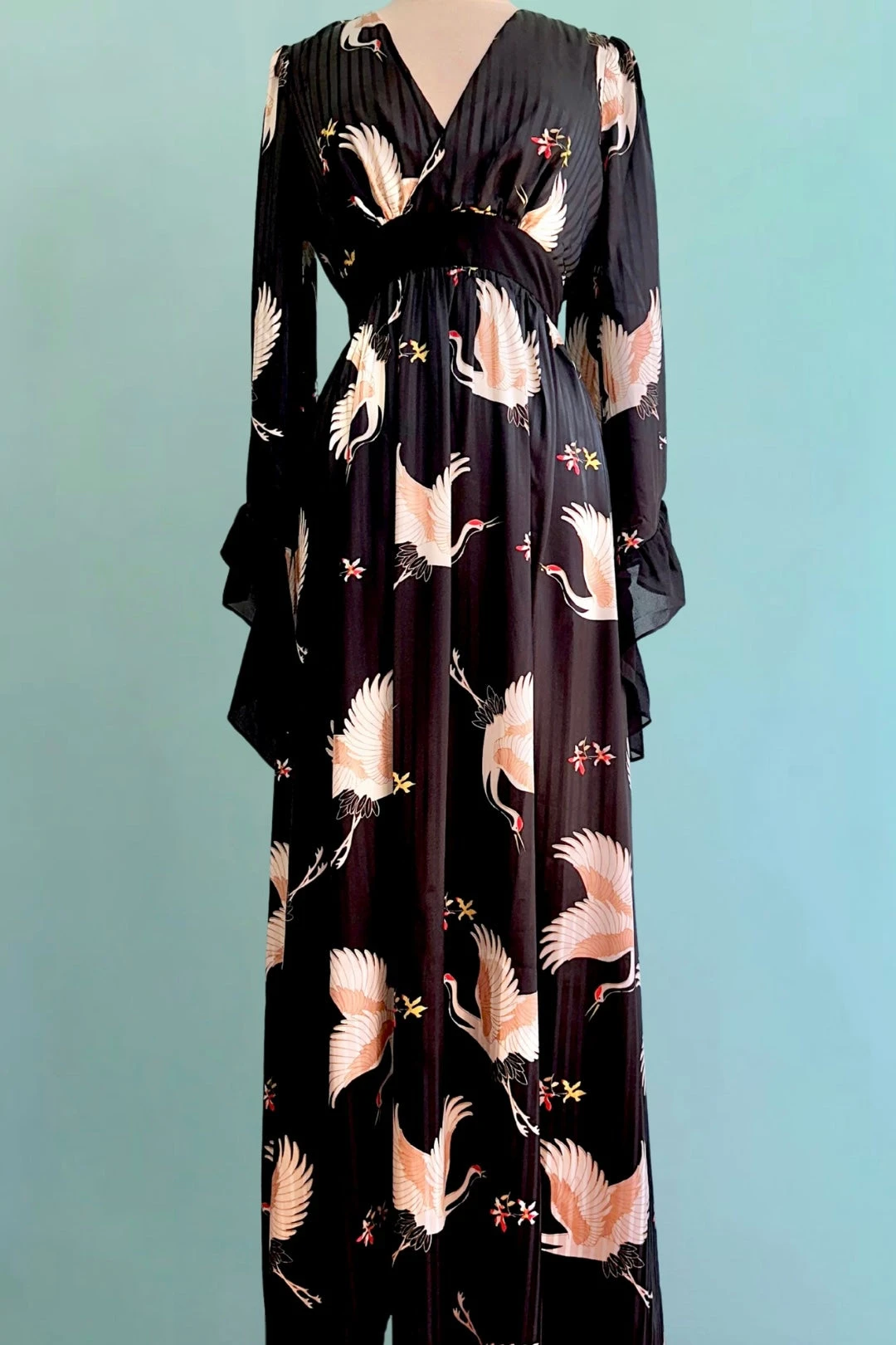 A black dress with a print of ivory and beige cranes as well as yellow and red flowers. This dress is made of a silky satiny material, has a v-neck, bell sleeves, and the bodice is lined. It zips up the back and does not have pockets.