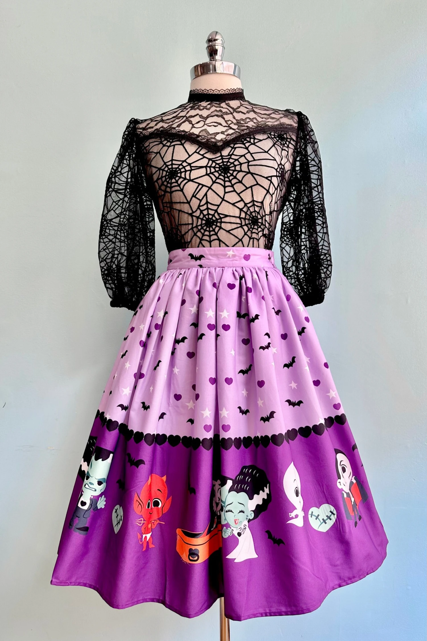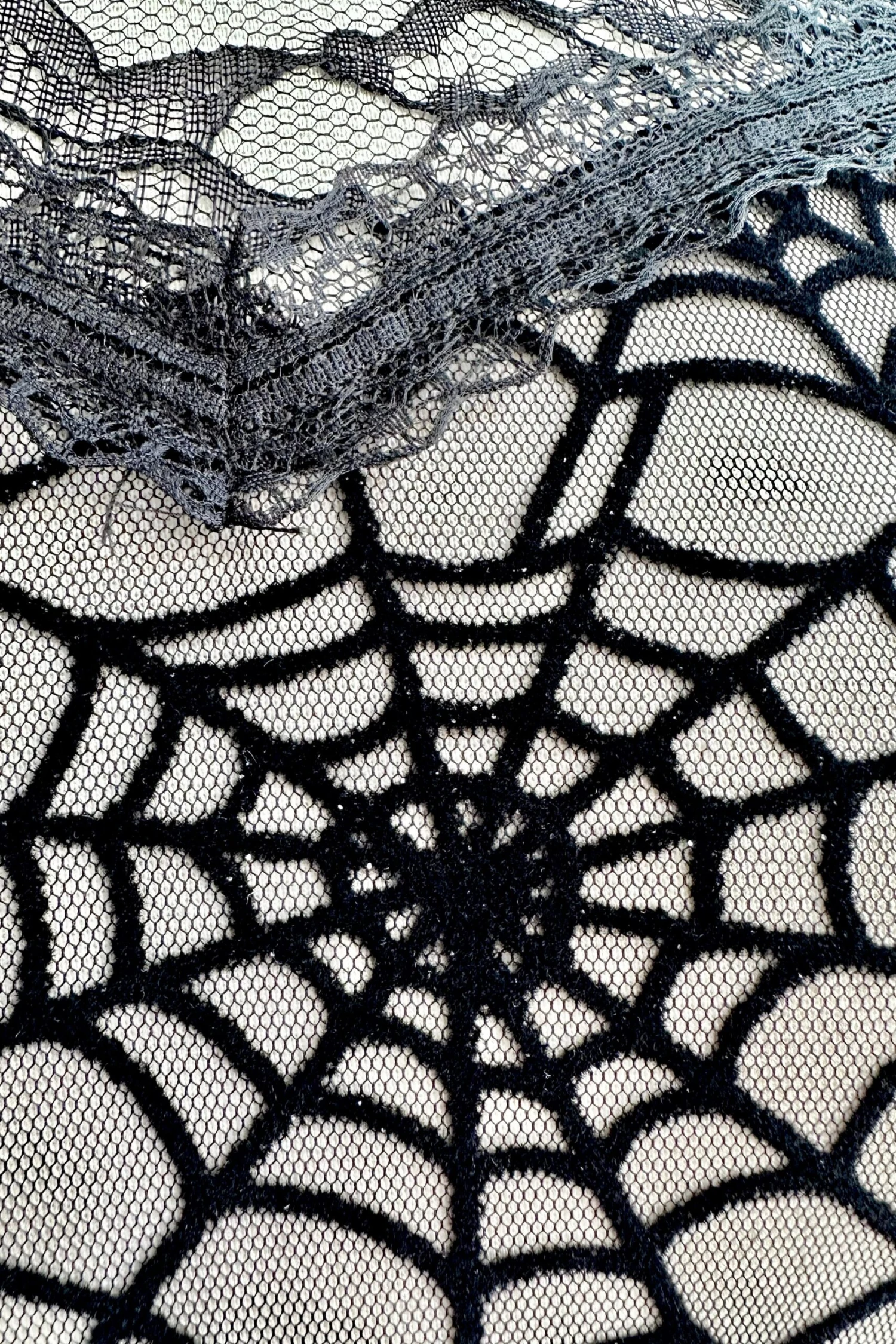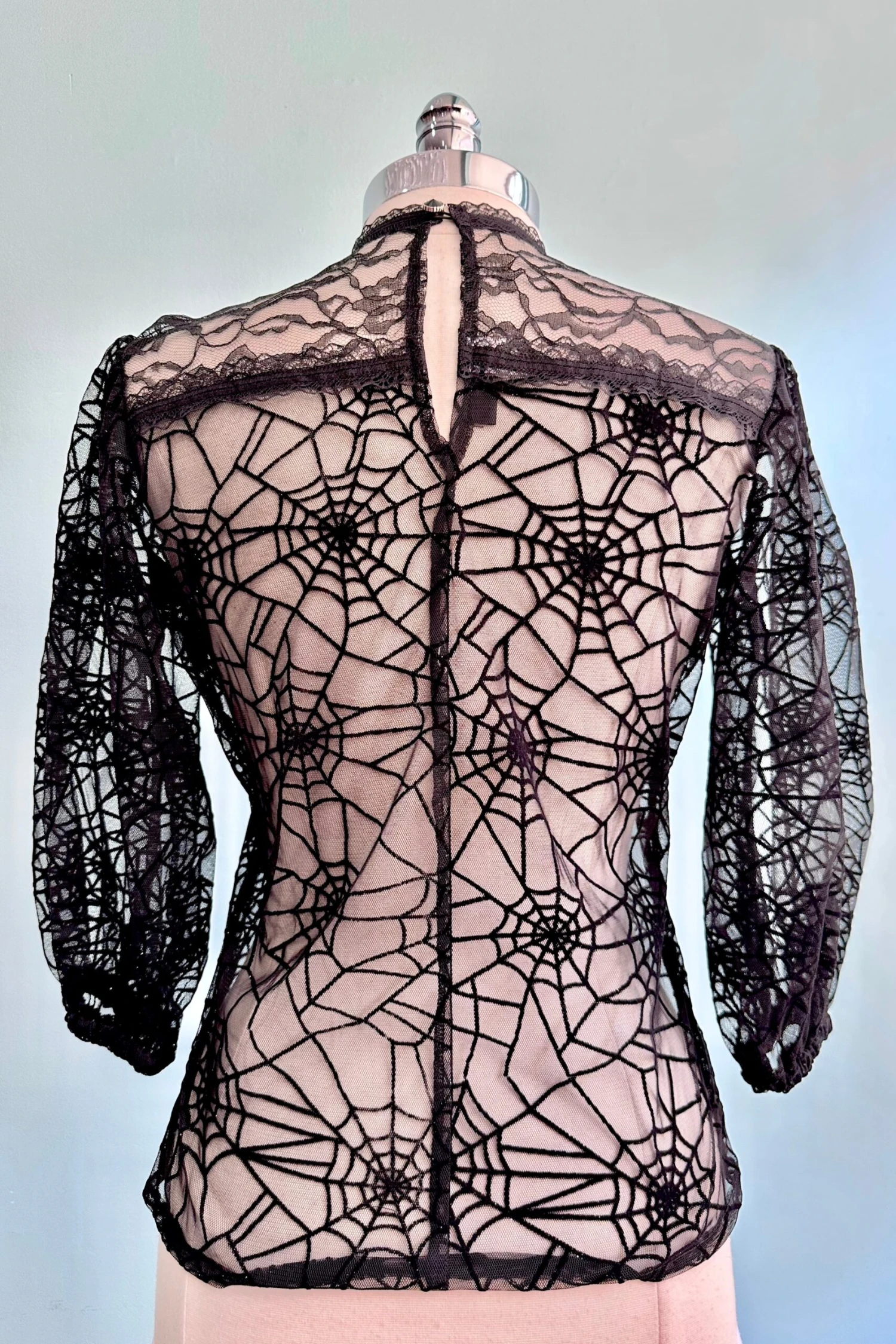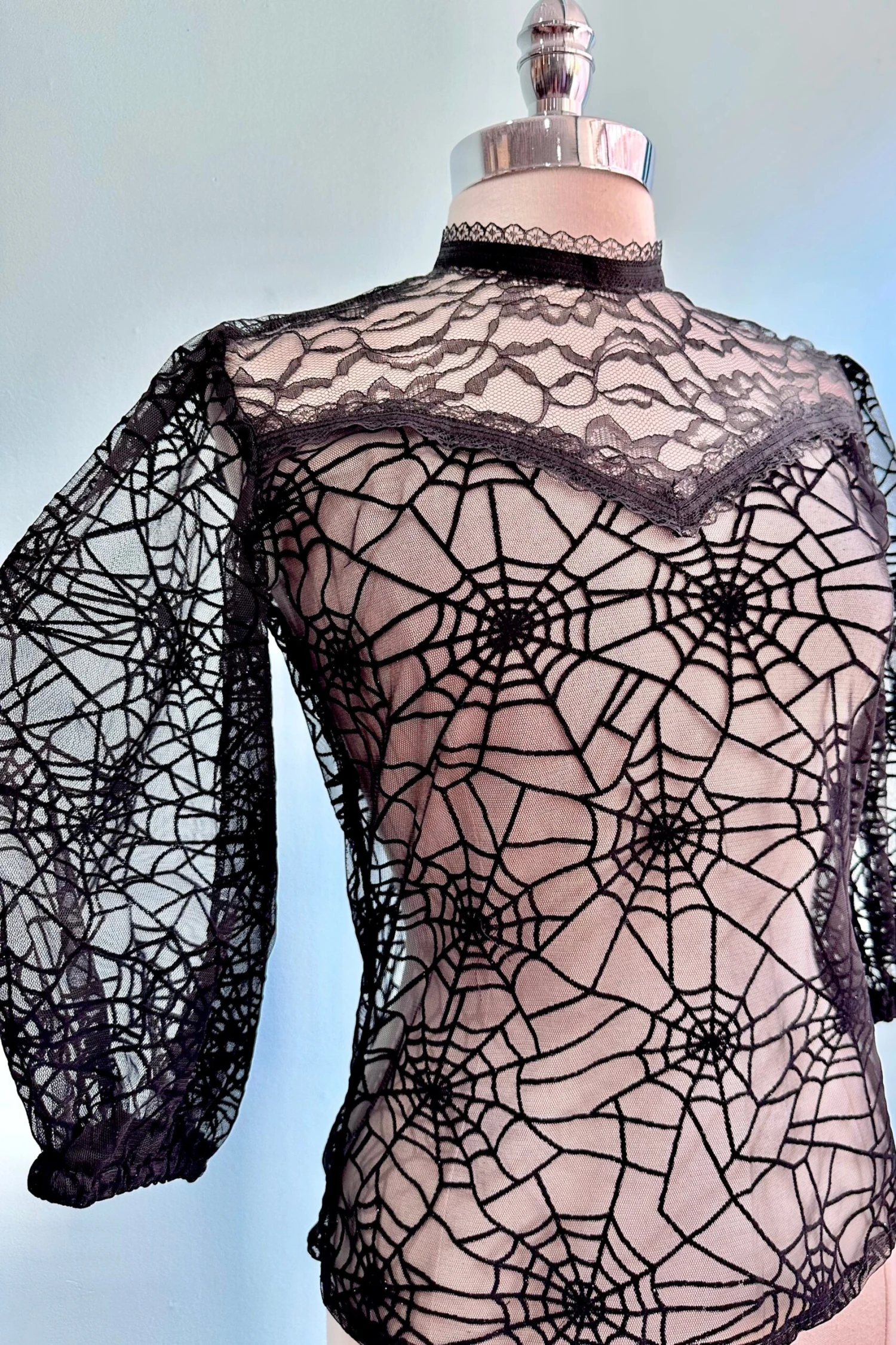 Gorgeous black spiderweb mesh lace top with glitter throughout. Features a 3/4 sleeve balloon sleeve with elasticized cuffs and a high neck that fastens with a summary at the back of the neck.
