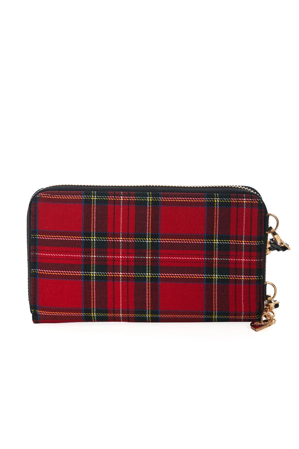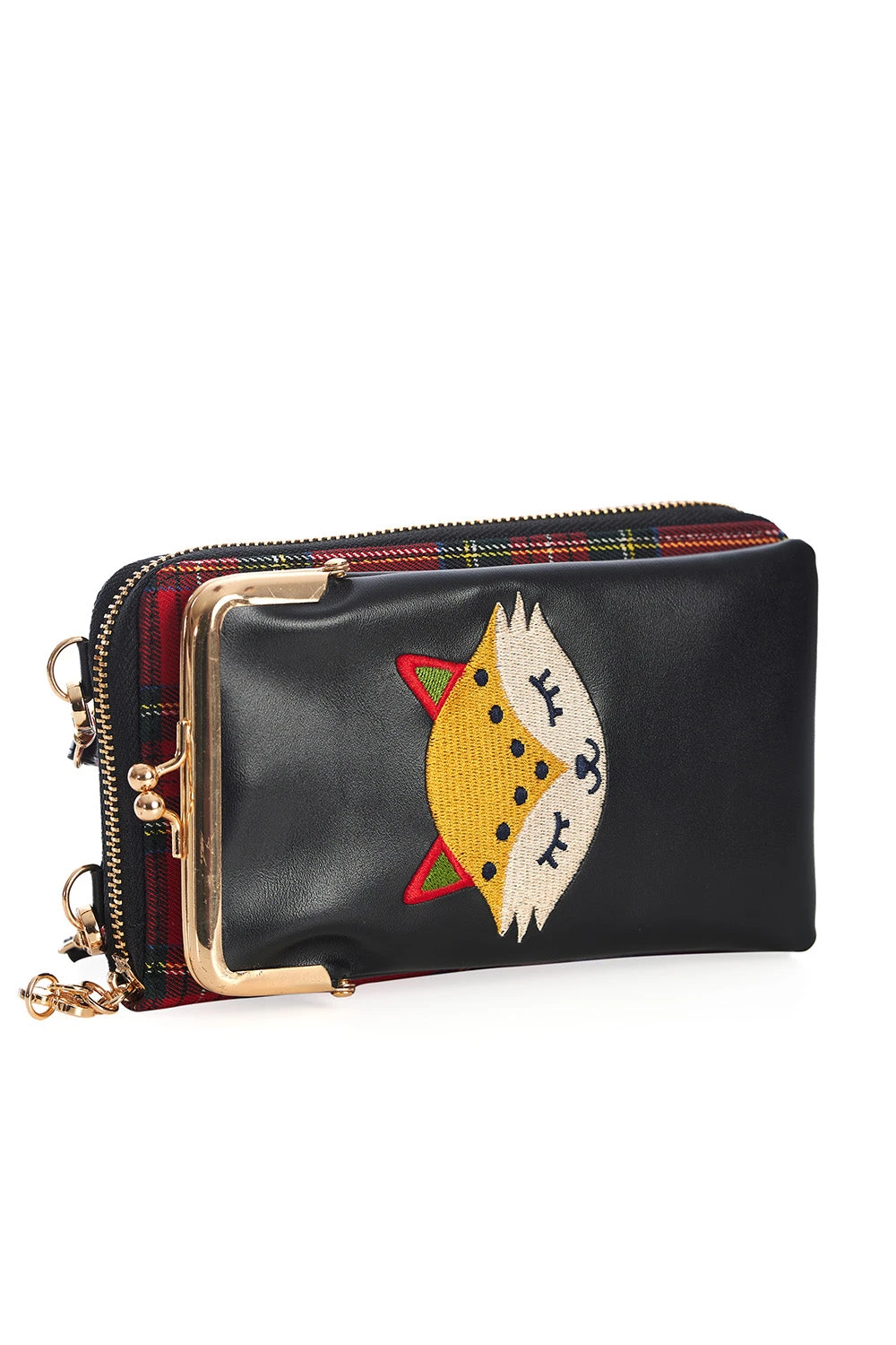 Cute crossbody with an embroidered fox face on the front. The body of the wallet is red plaid and the front is faux black leather with a kiss lock. Comes with an adjustable crossbody strap.