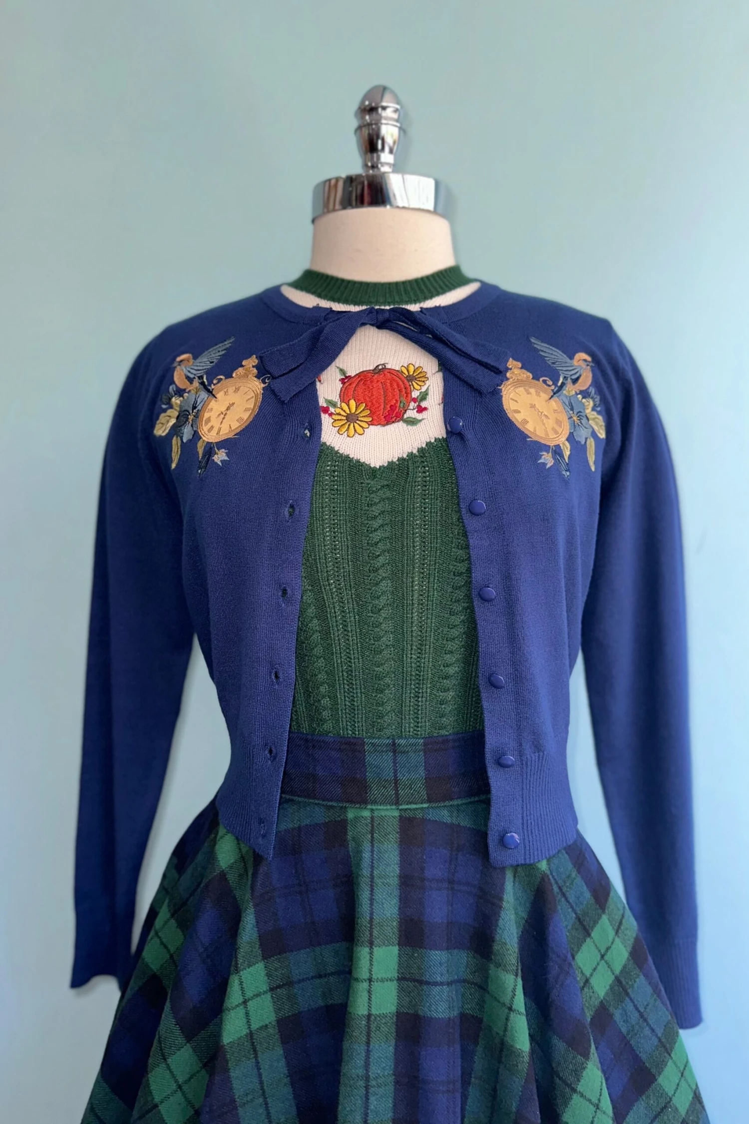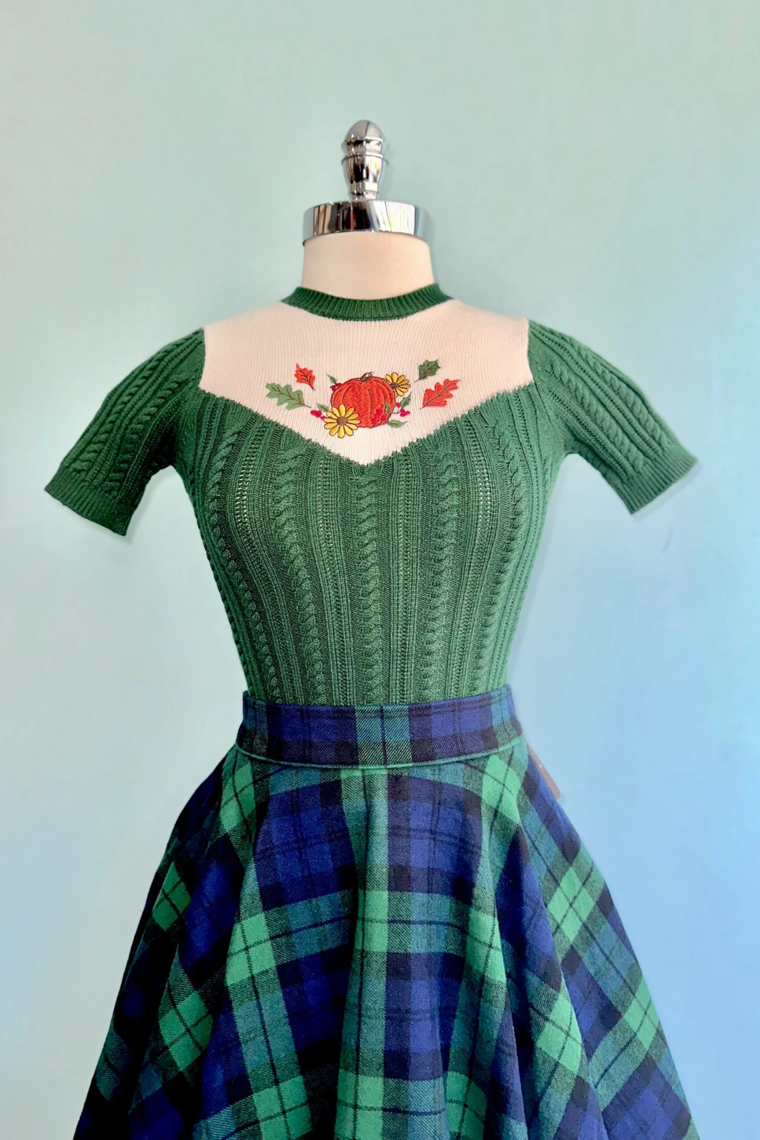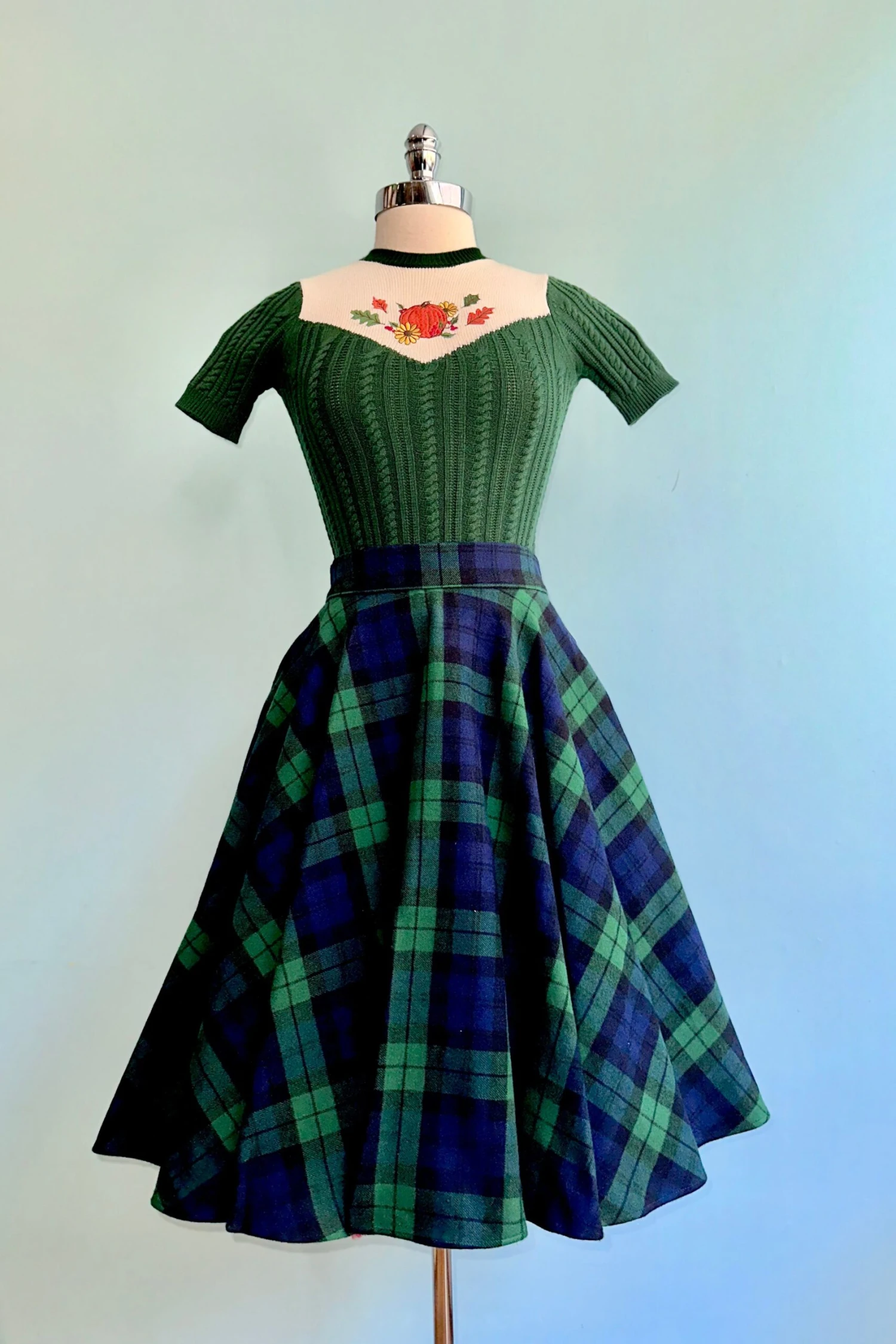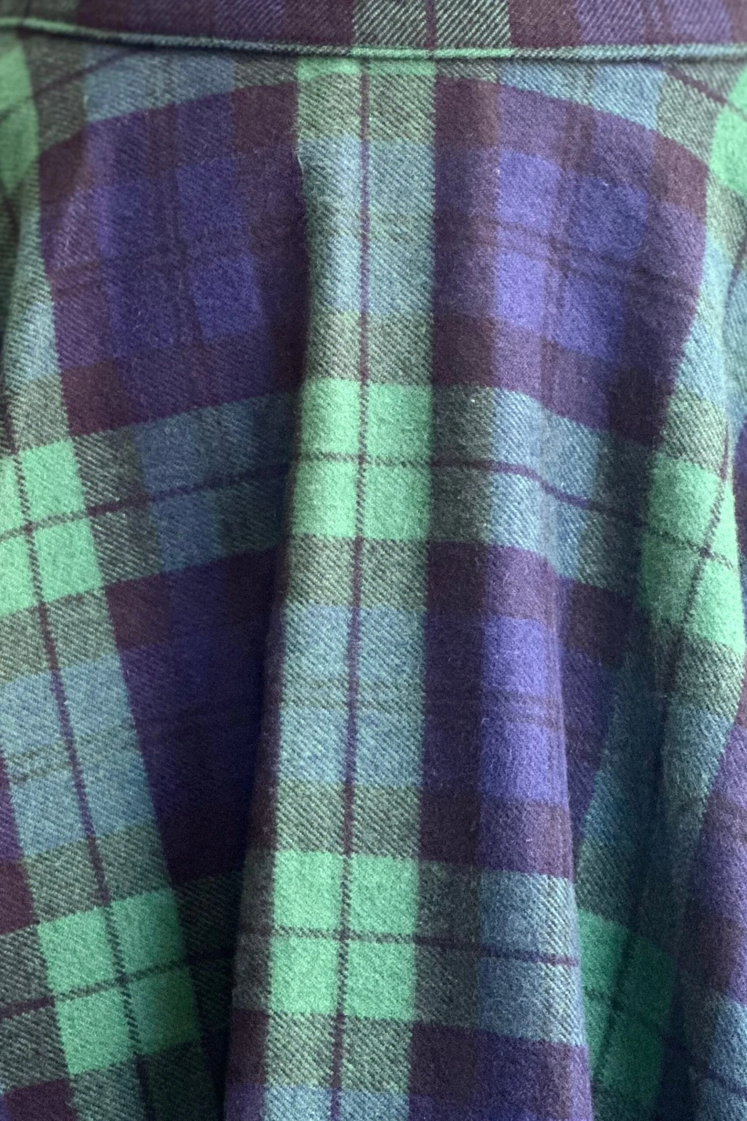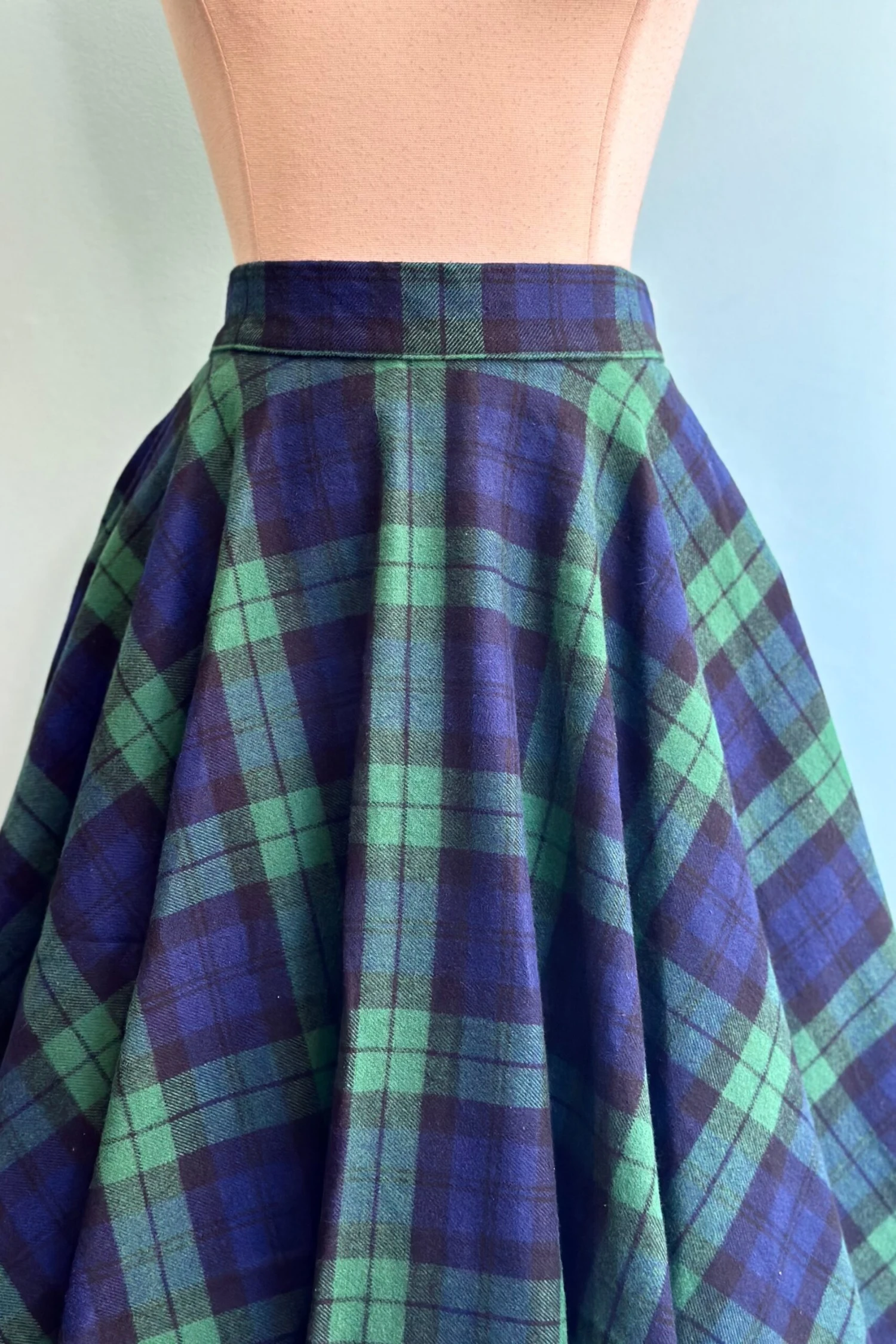 Navy, green and black plaid circle skirt in a soft yet sturdy flannel fabric. There are side pockets and zips up the back! Unlined.