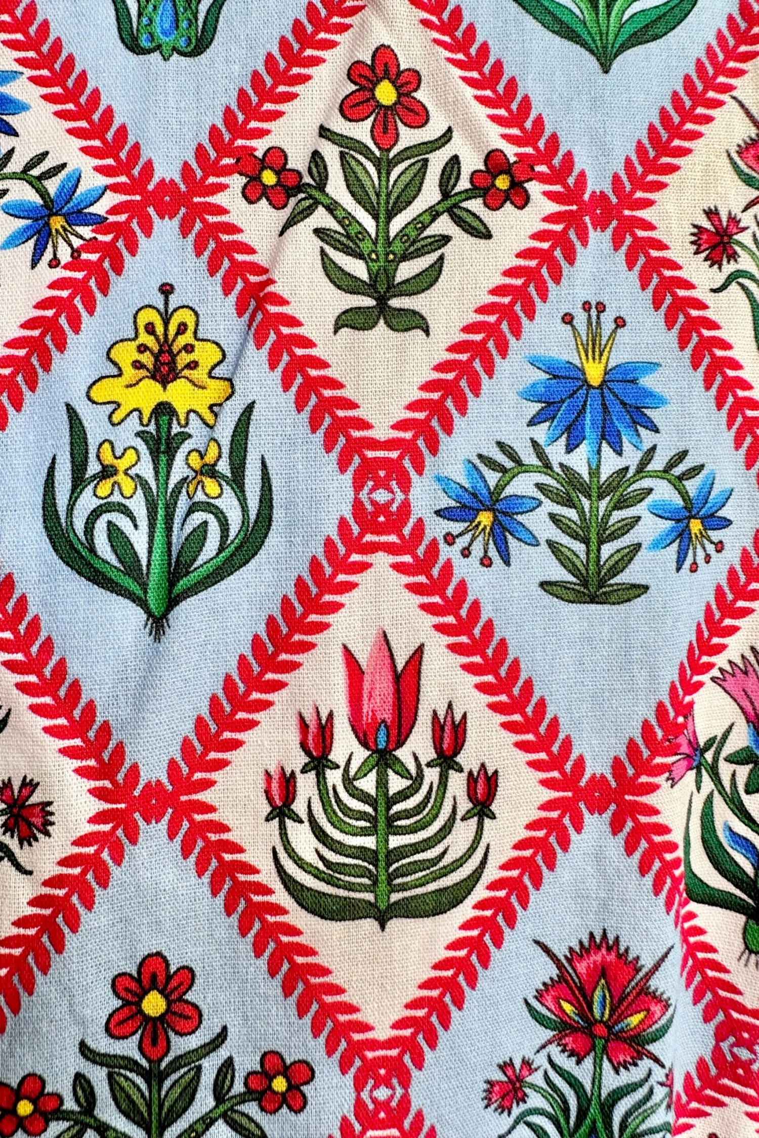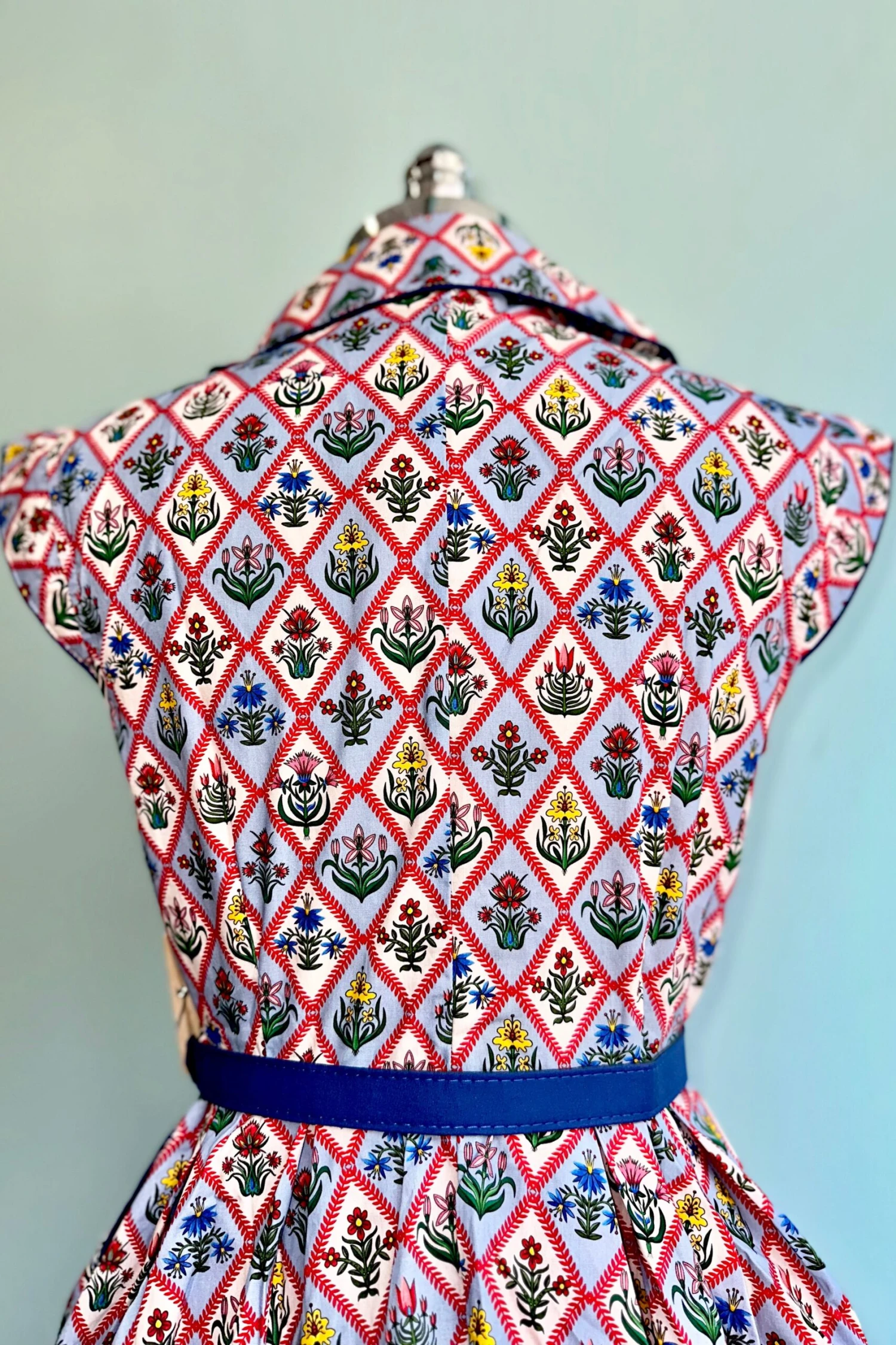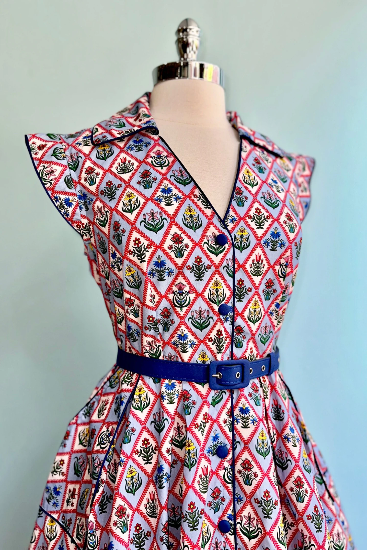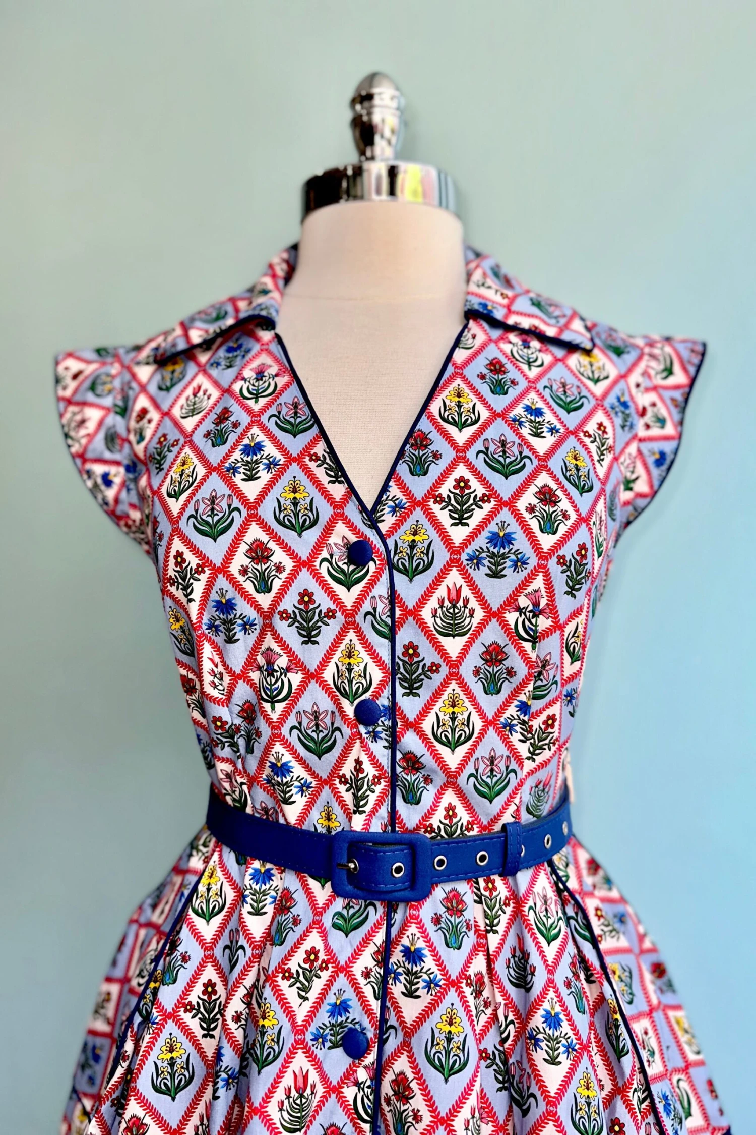 Blue shirt dress with a floral diamond print and a fold over collar. The print is little flowers in a diamond trimmed in red. The flowers are pink, green, red and yellow. The skirt is fill and has fold over pockets. Unlined and comes with a coordinating blue belt.