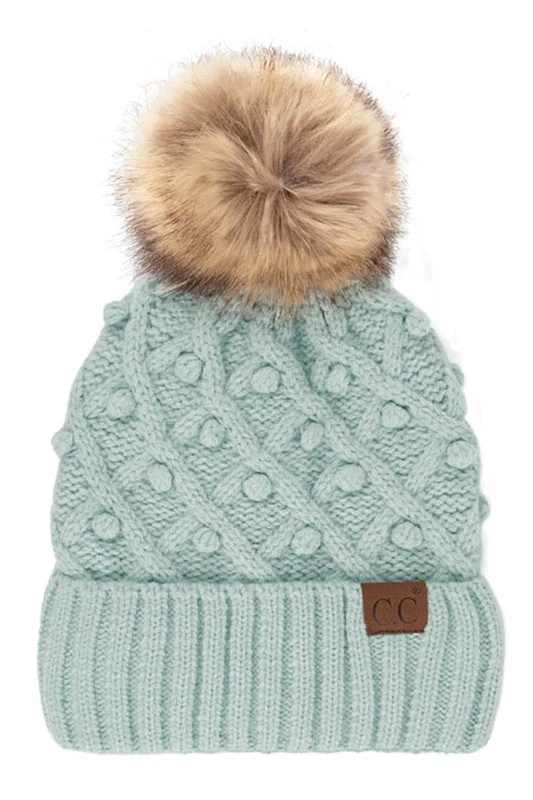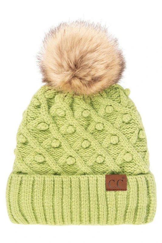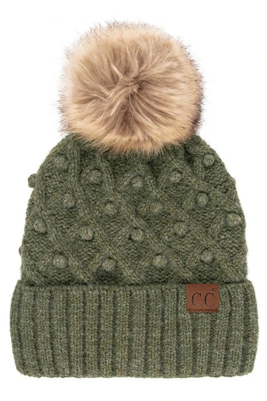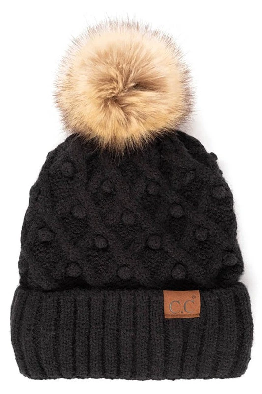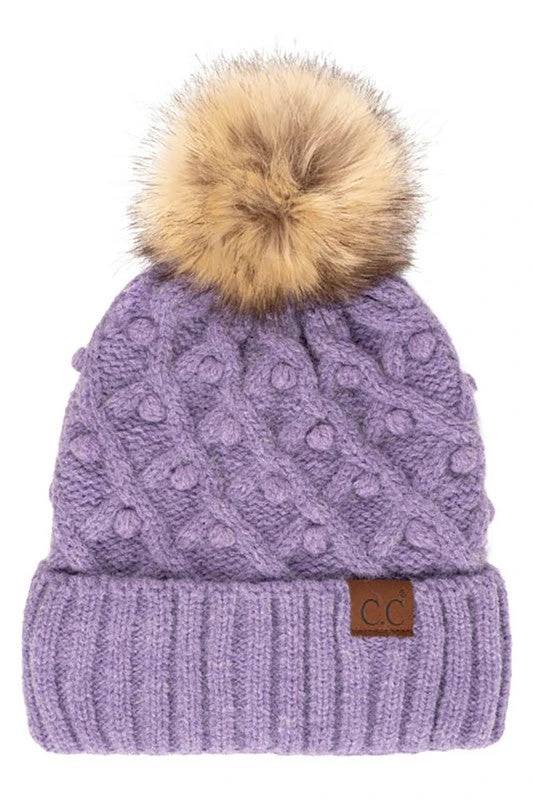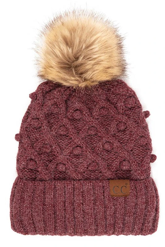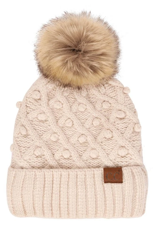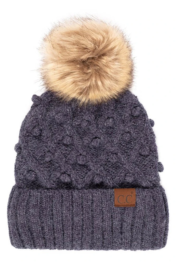 Warm bobble knit beanie hat with a tan faux fure pom pom. 100% Acrylic, lined in fleece!