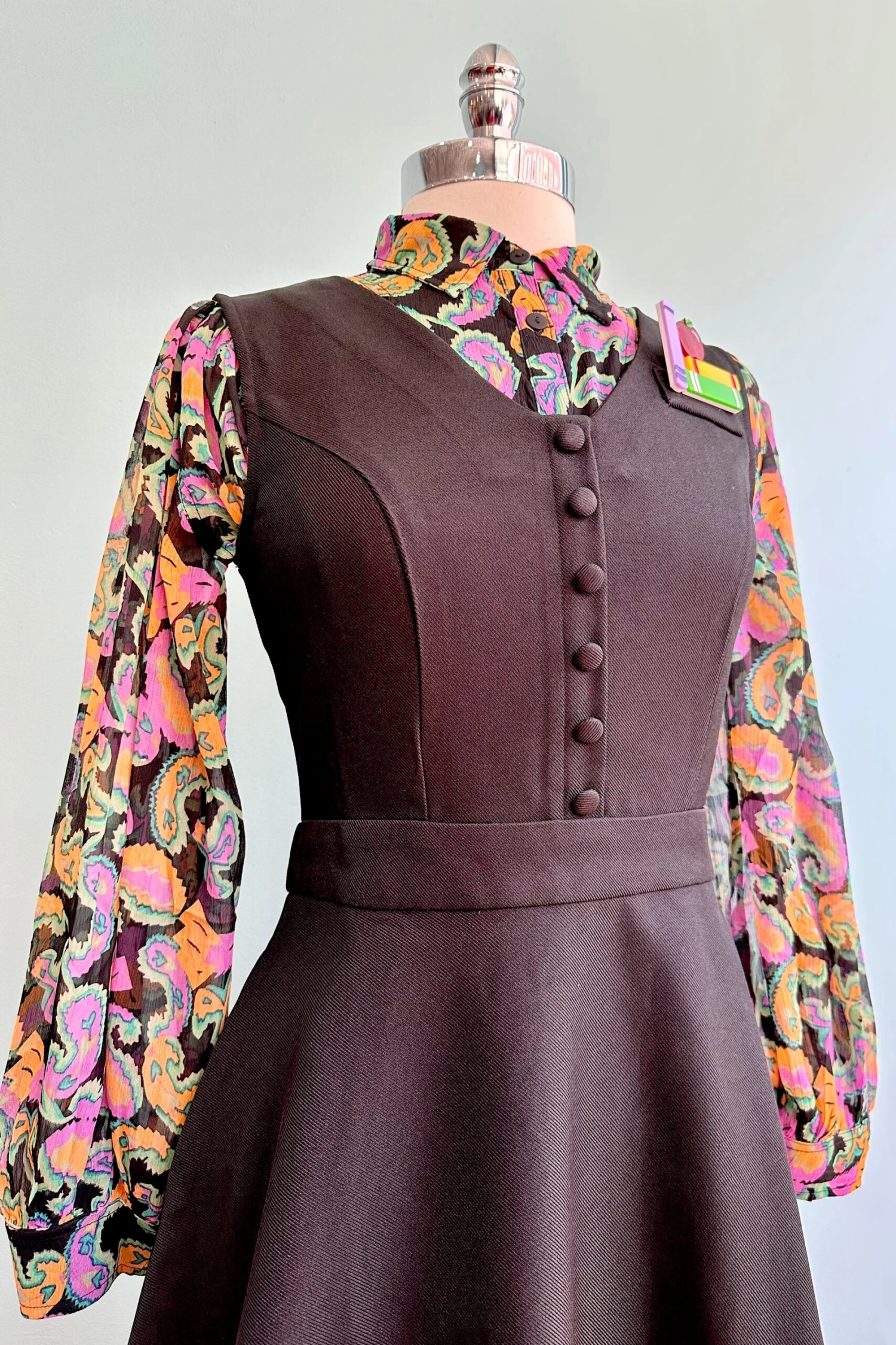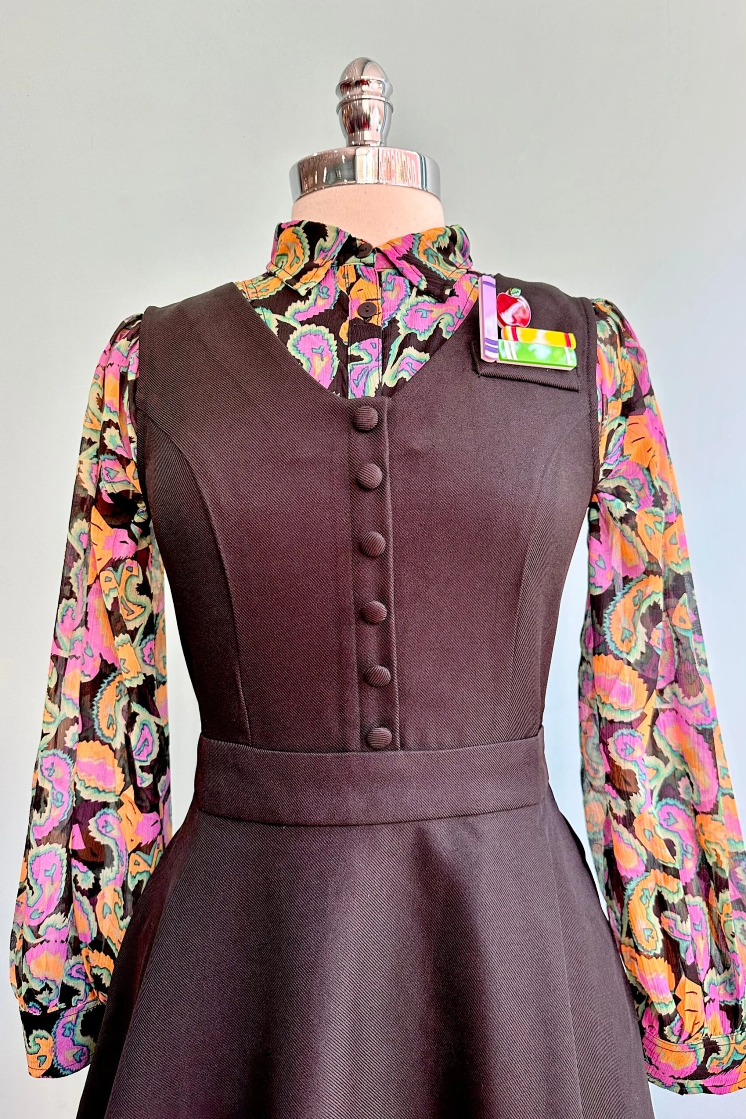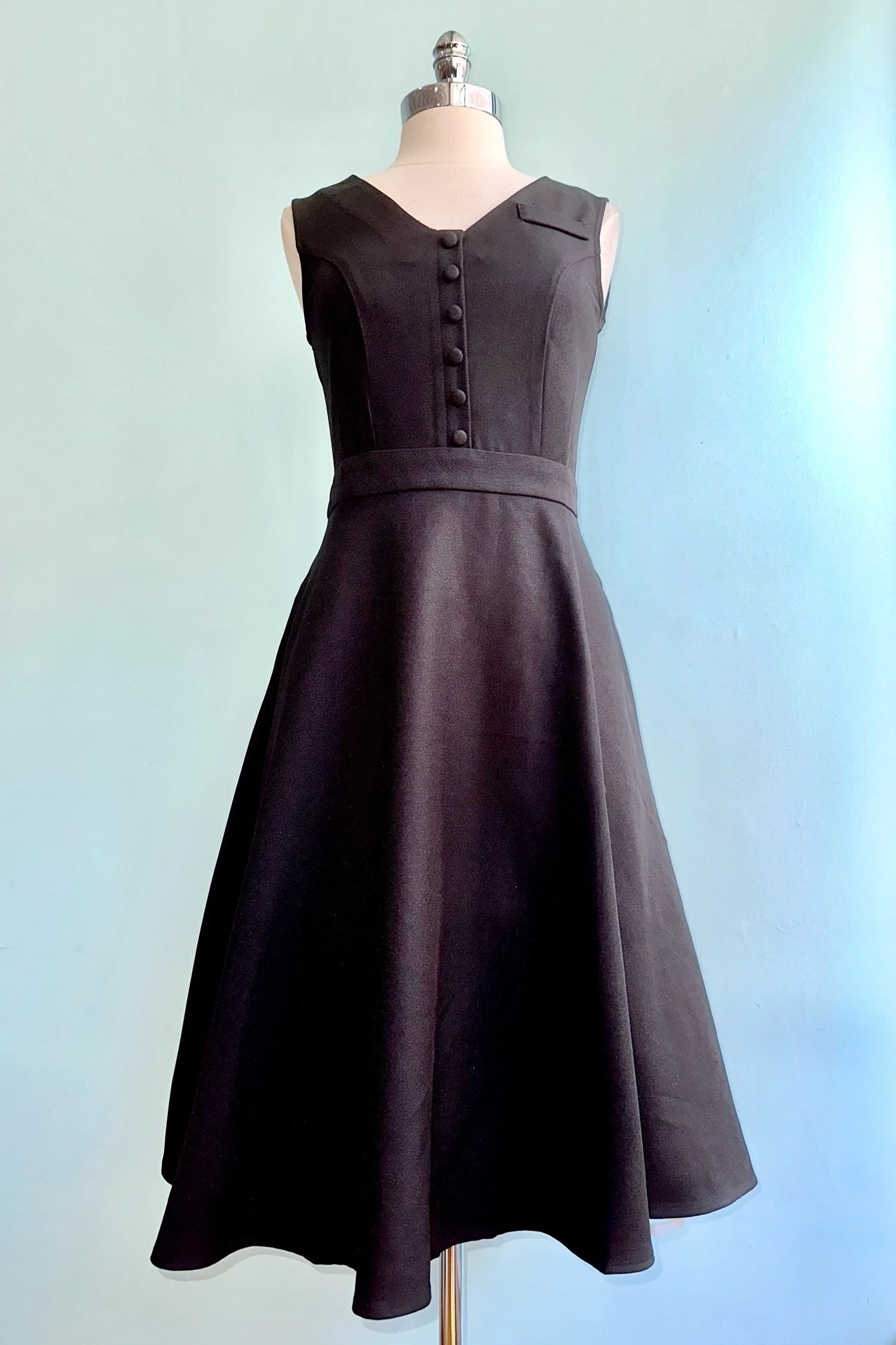 Black dress with a vest-like bodice and an A-line skirt. There is a back zip closure and side pockets in the skirt.
