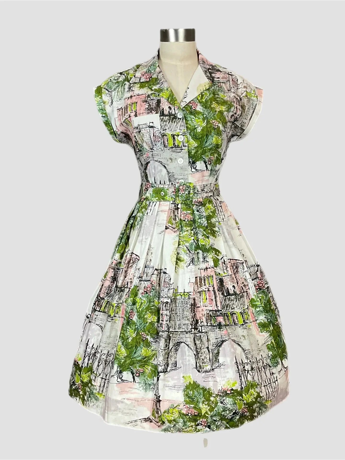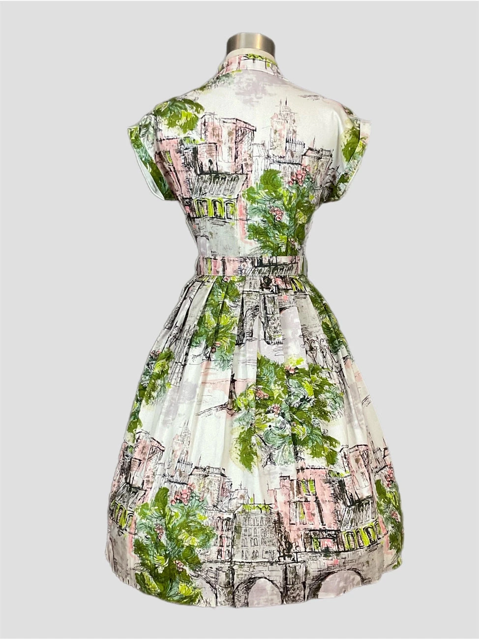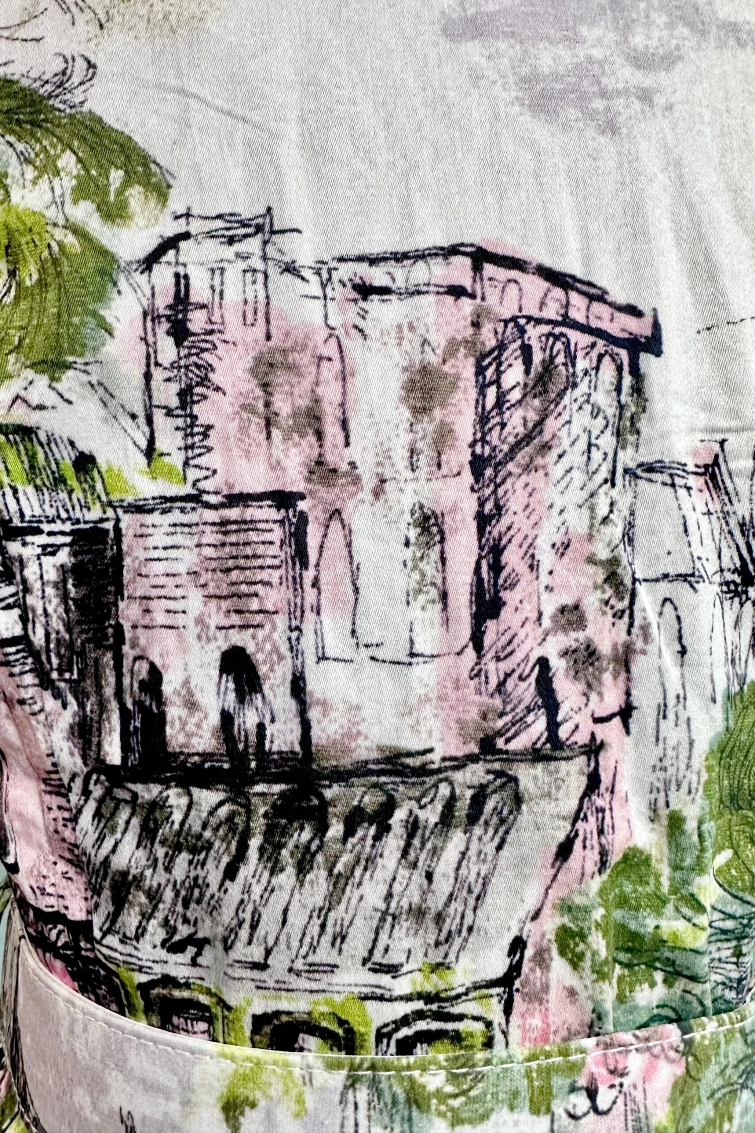 Gorgeous dress with a white and grey background and a city scene in pink and sage green with black outlines, looks like a painting! The Connie is a must have classic shirt style dress, comfortable to wear all day, a perfect work dress and looks great dressed up or with sandals. It comes with a matching belt, has a side seam zipper and pockets in the skirt.