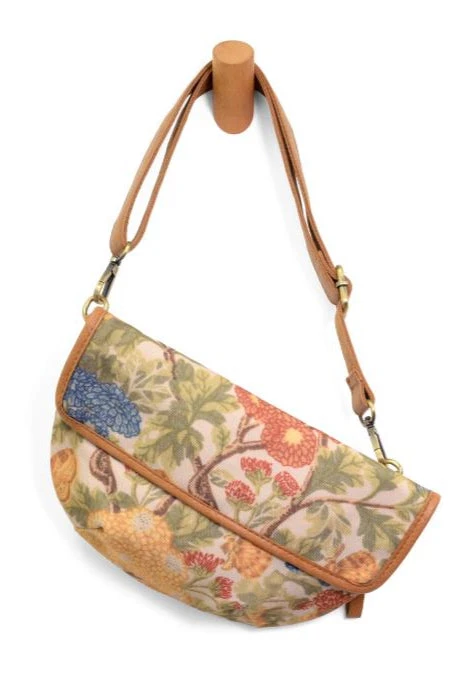 Dimensions: 5.5 in. H x 9.75 in. W x 2 in. D Magnetic snap and top zip closure. Adjustable and removable shoulder strap: 14.5 in. – 27 in. drop. Brass plated hardware. Logo zip pull. Cotton canvas with exclusive vintage floral print100% Vegan leather trim (polyurethane)Lightweight canvas fabric lining. One interior zip closure pocket. One interior open pocket. Exterior back zip pocket