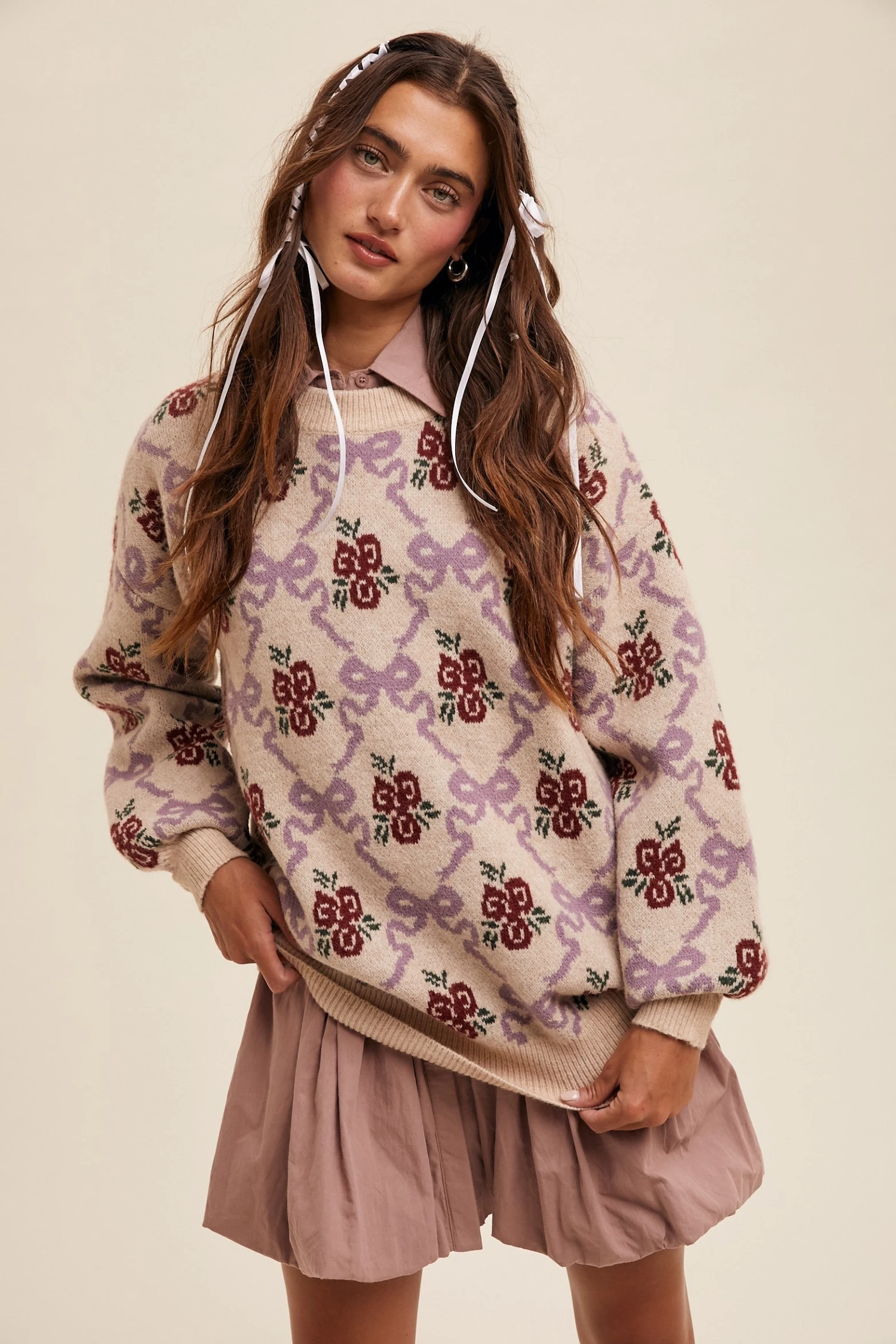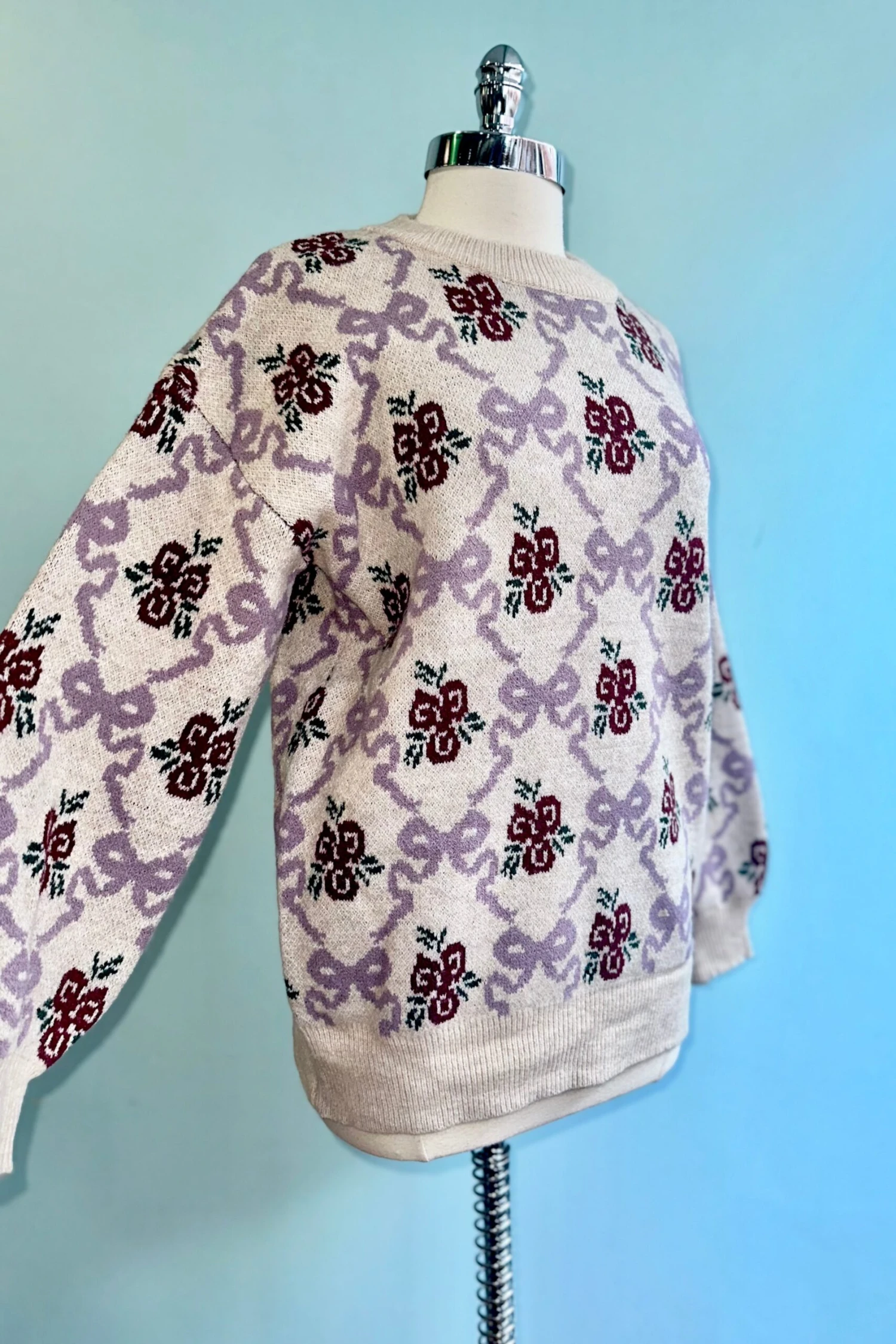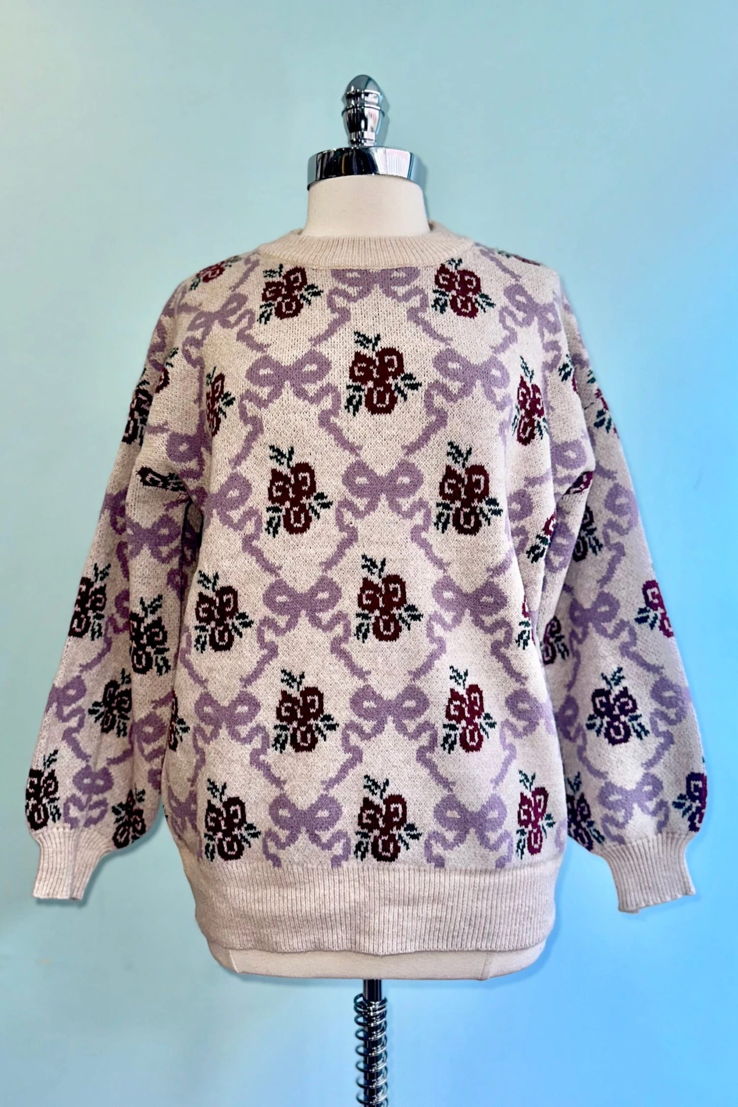 Rounded neck sweater in taupe with a purple bow and burgundy floral print. This sweater has long sleeves and is a relaxed fit. So so soft and cozy!