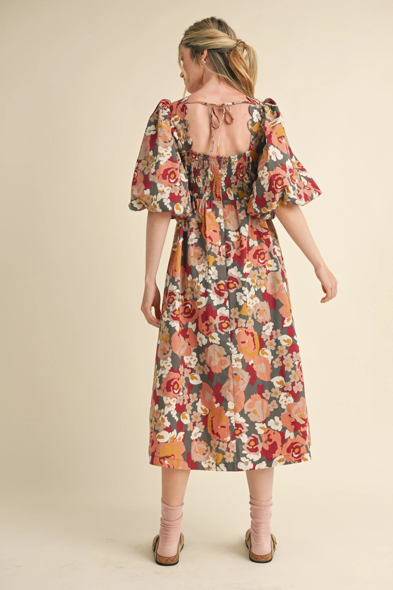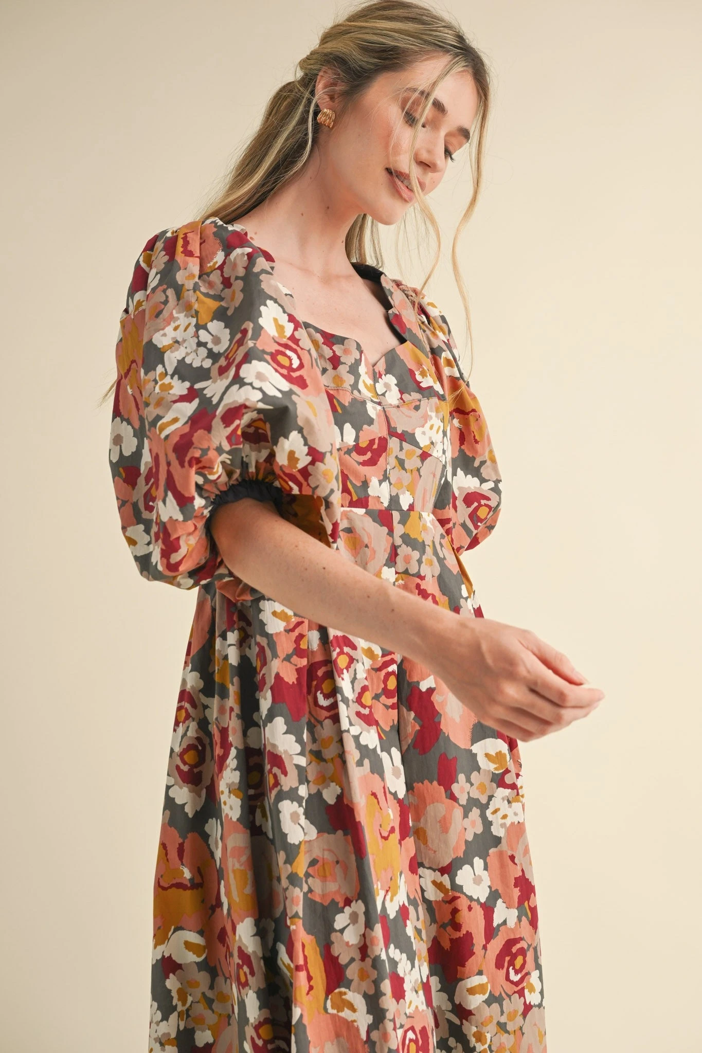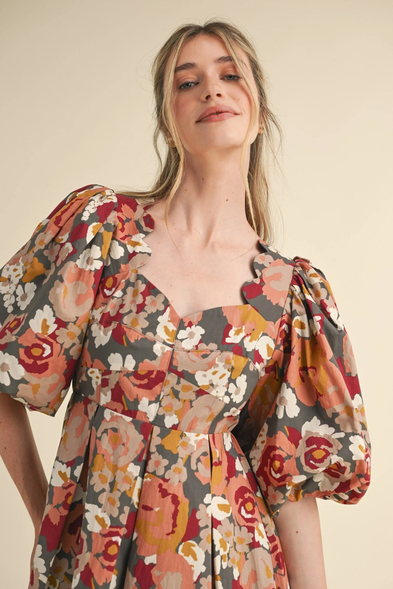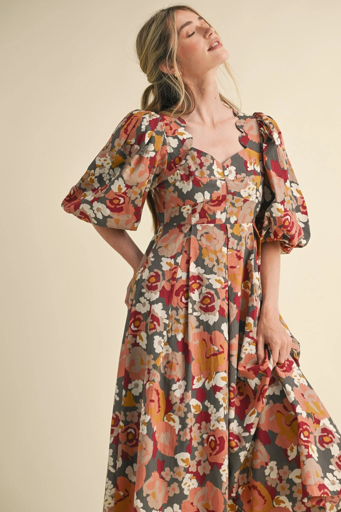 Charcoal dress with a print in burgundy, ivory, peach and mustard. This dress has amazing bubble sleeves and a sweetheart neckline with a scalloped edge. There is a back tie and the back shoulders and a back zip closure. The back bodice is smocked, the front bodice is fitted with seemed detail. The skirt has wide pleats that the waist and is full with side pockets.