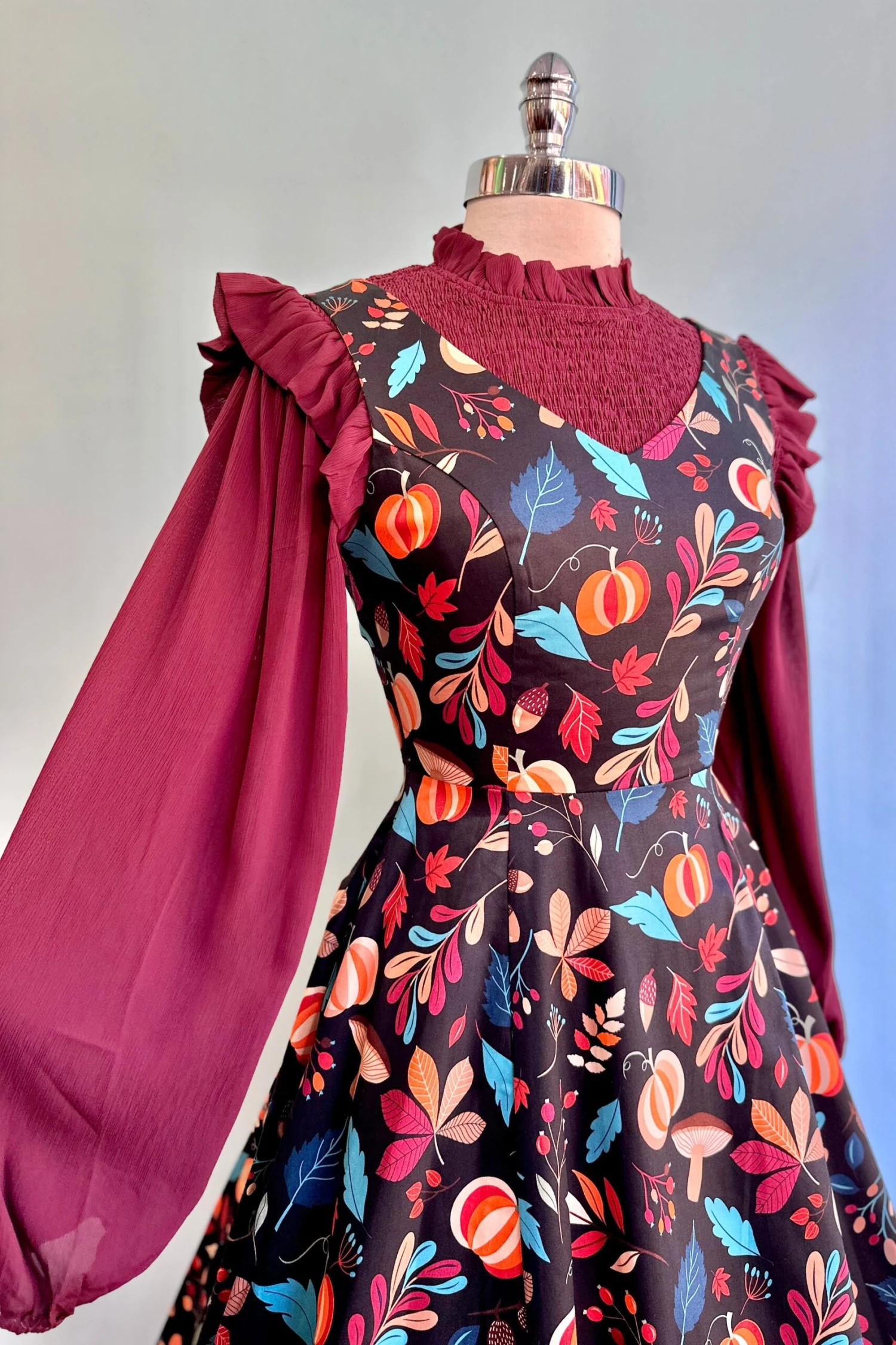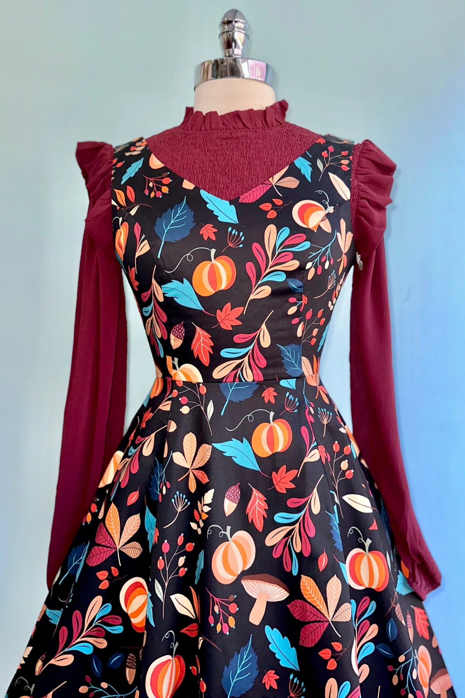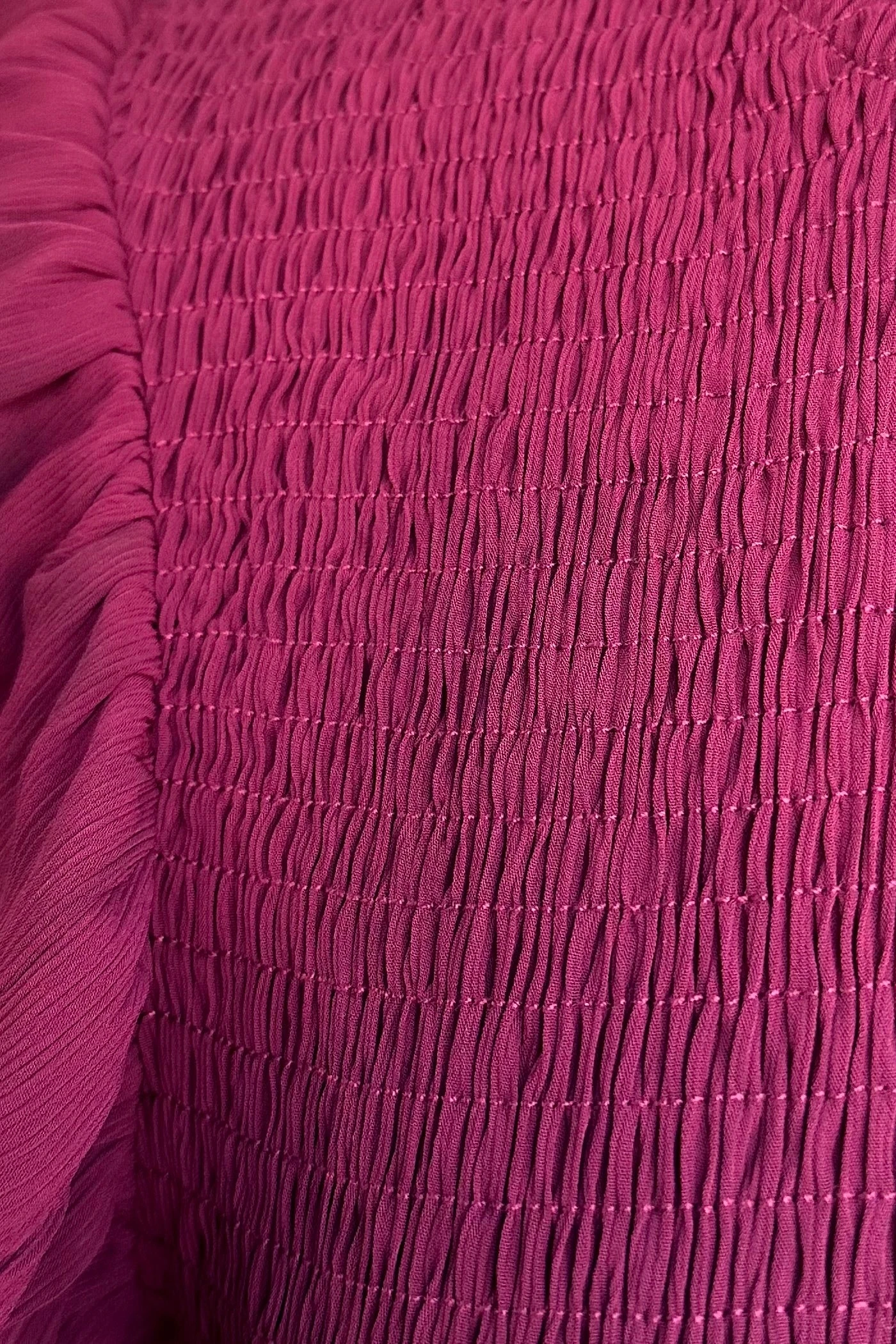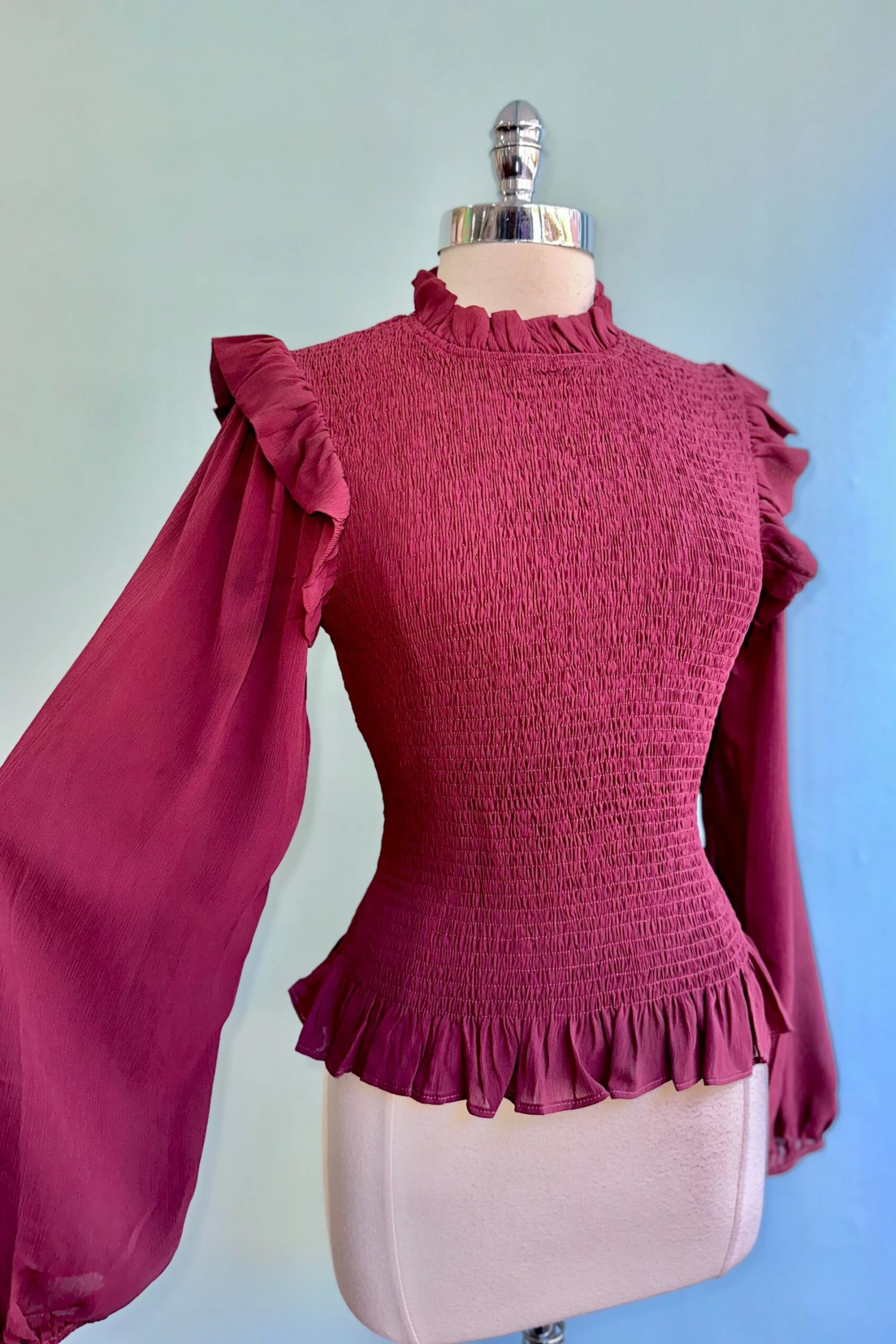Long sleeve top in brick red with a smocked bodice, shoulder ruffles and long billowy sleeves. Easy on and off due to the smocked bodice.