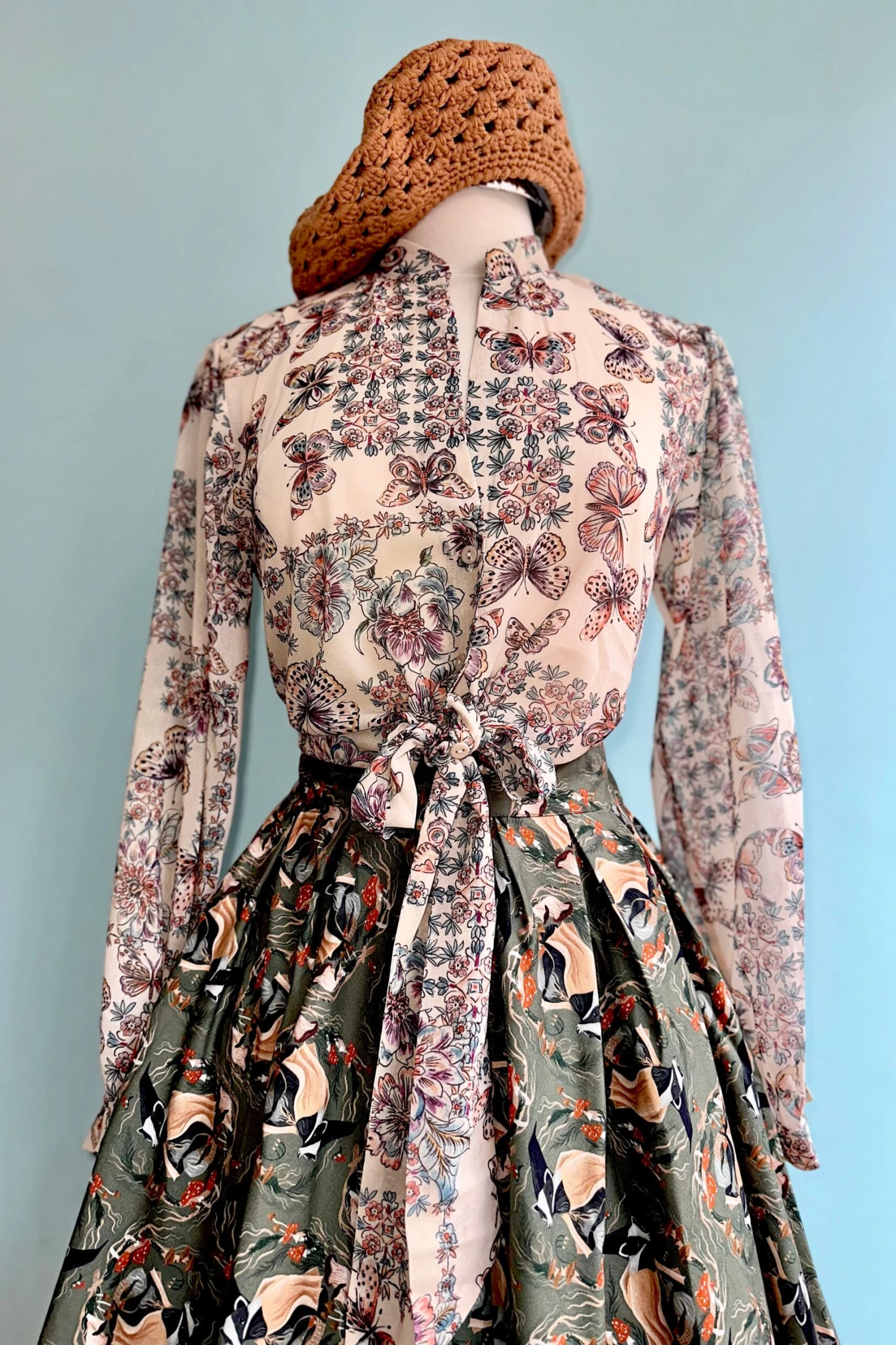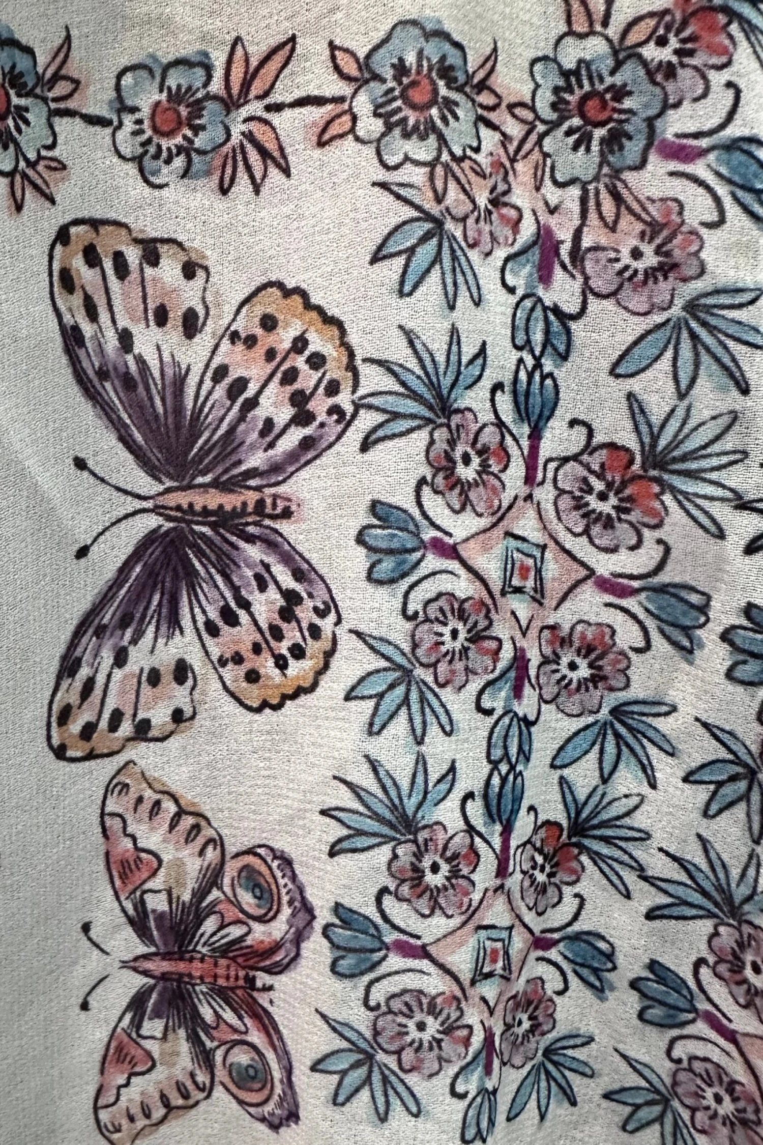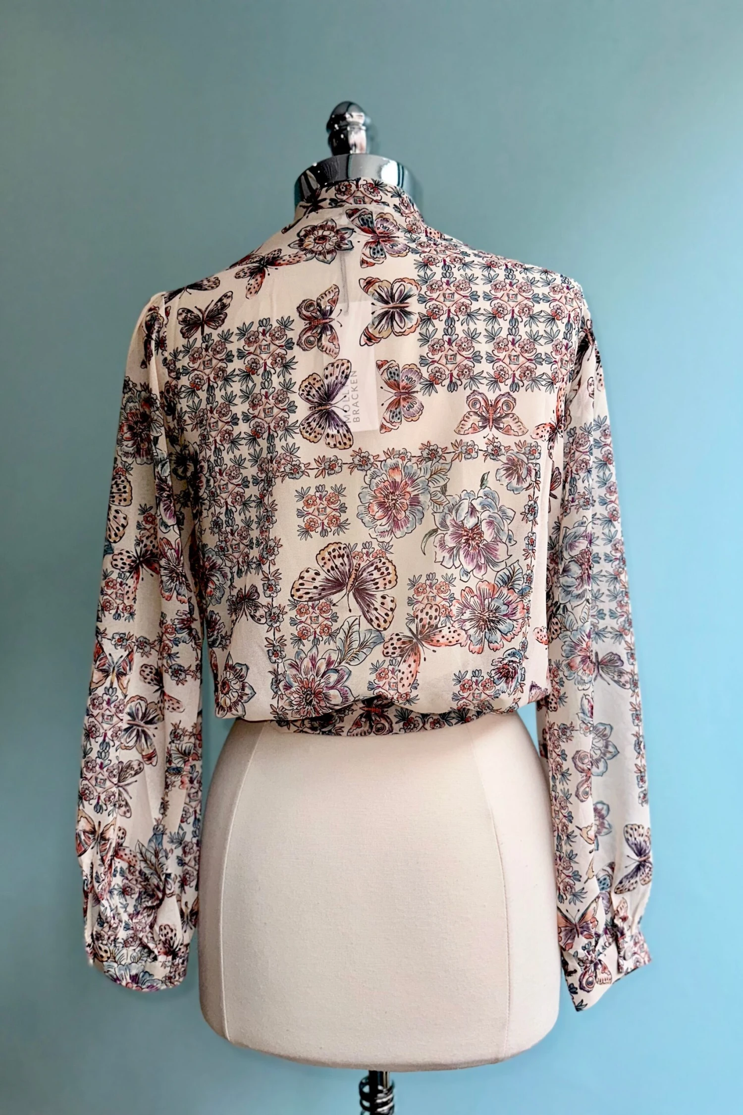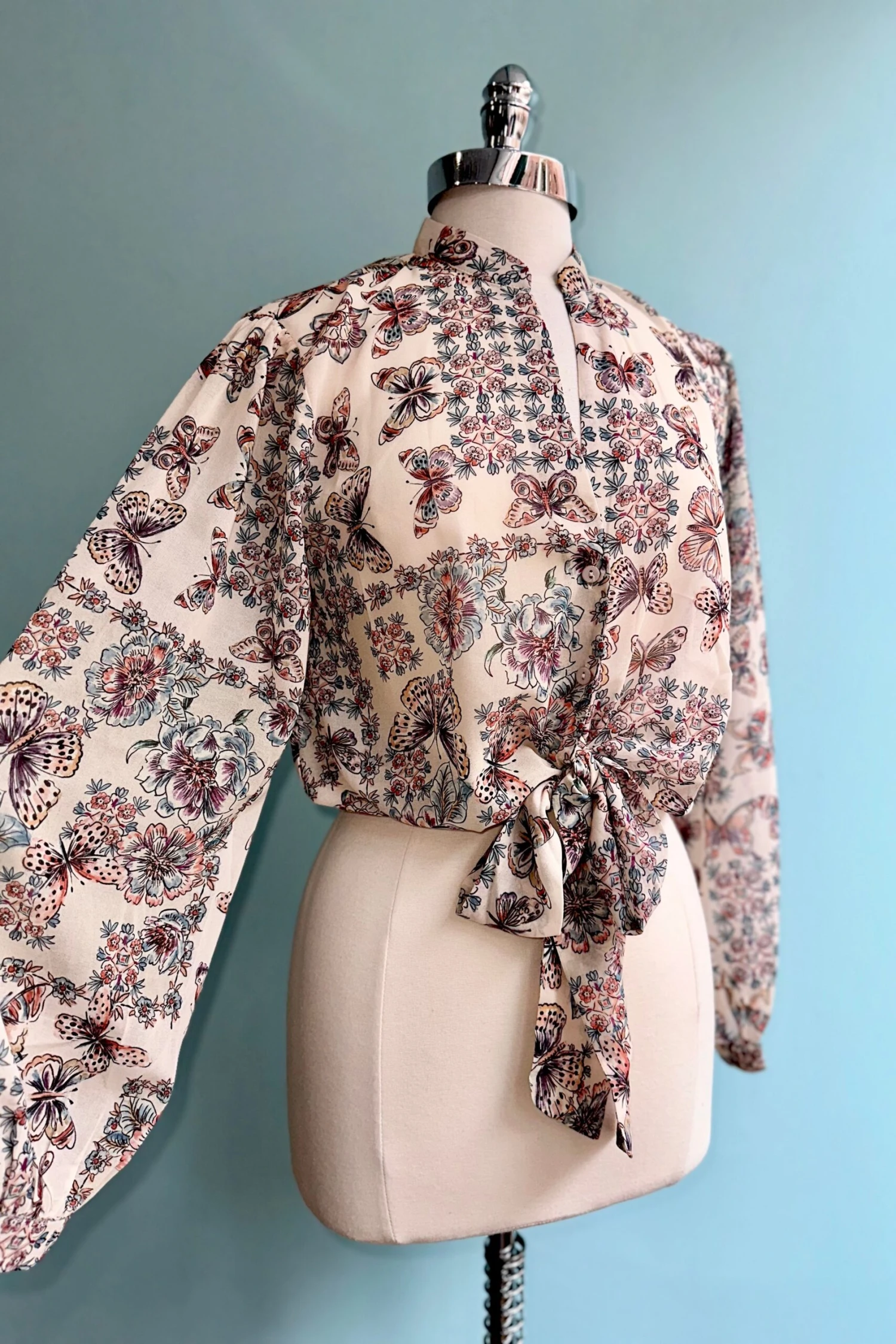 Cream colored top with a floral and butterfly print. The sleeves are full and billowy with a fastener at the wrist. The bodice has a summary front with a tie fastener at the waist. The fabric is lightweight, semi sheer and unlined.