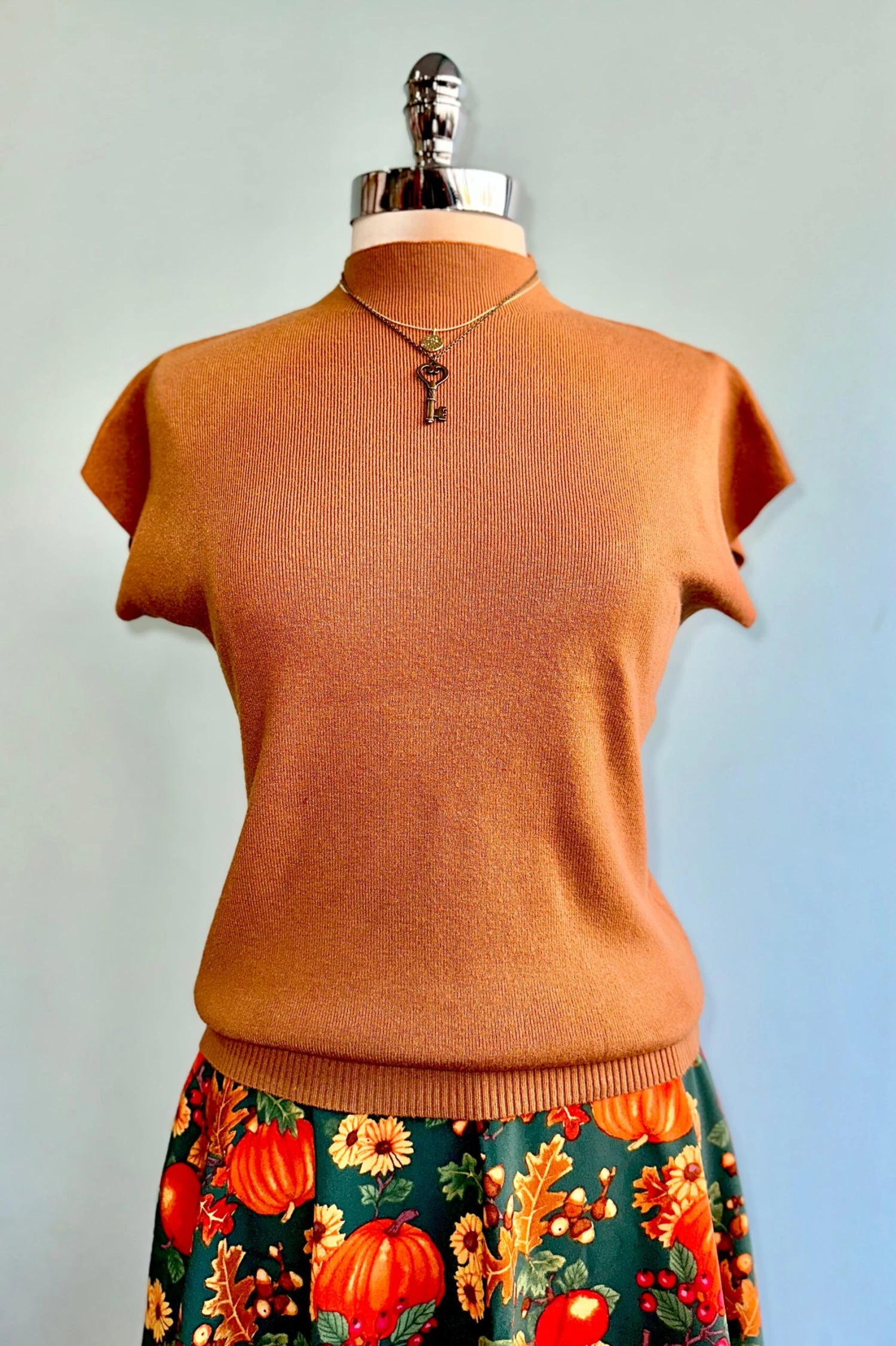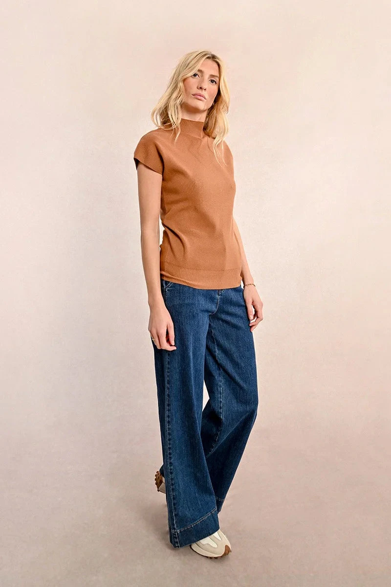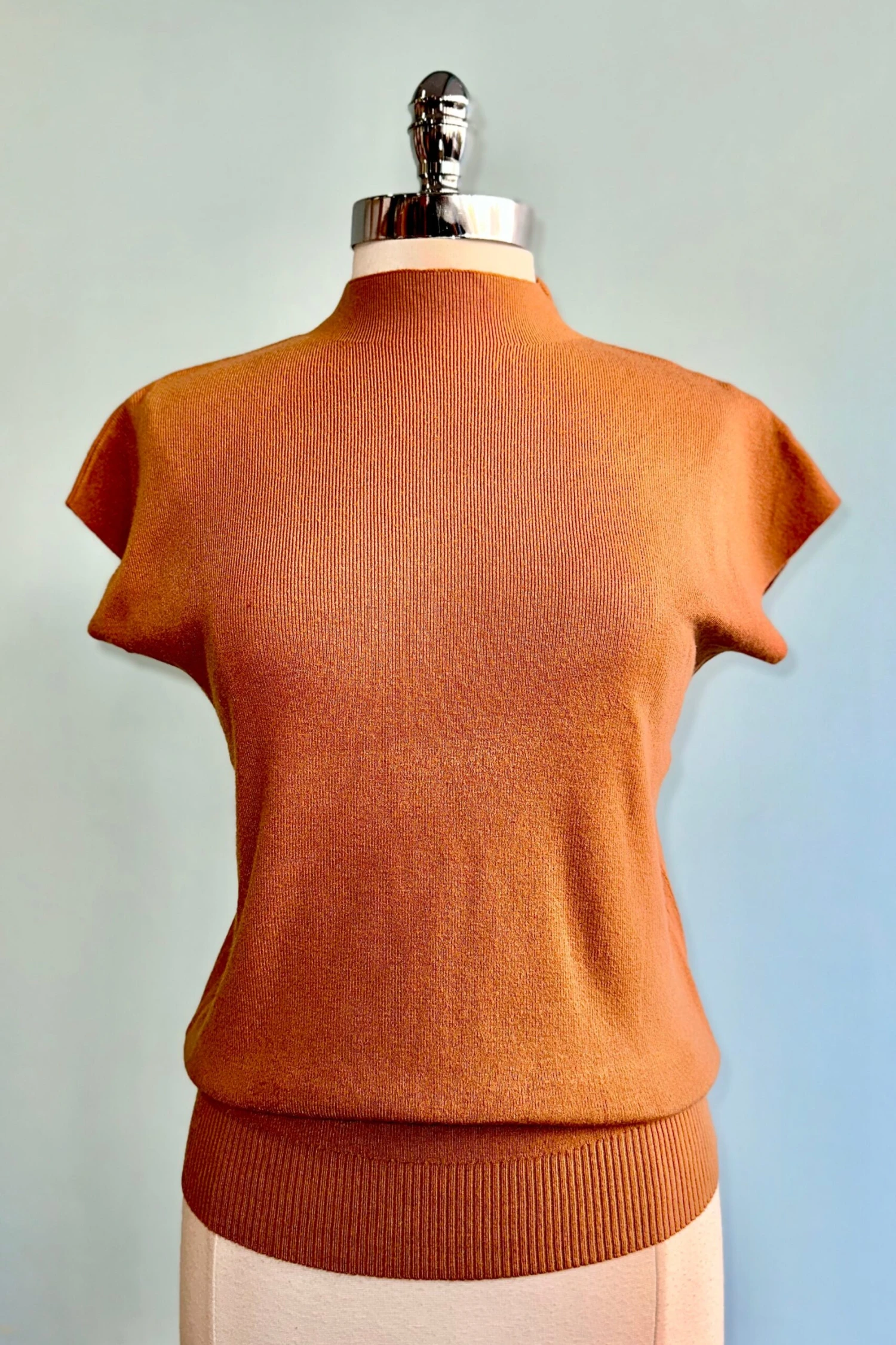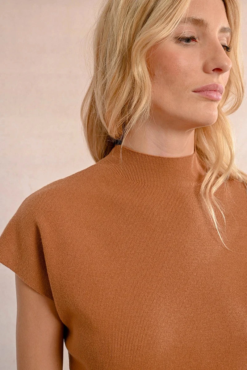 Capped sleeve, mock neck sweater in camel in a skinny rib knit.