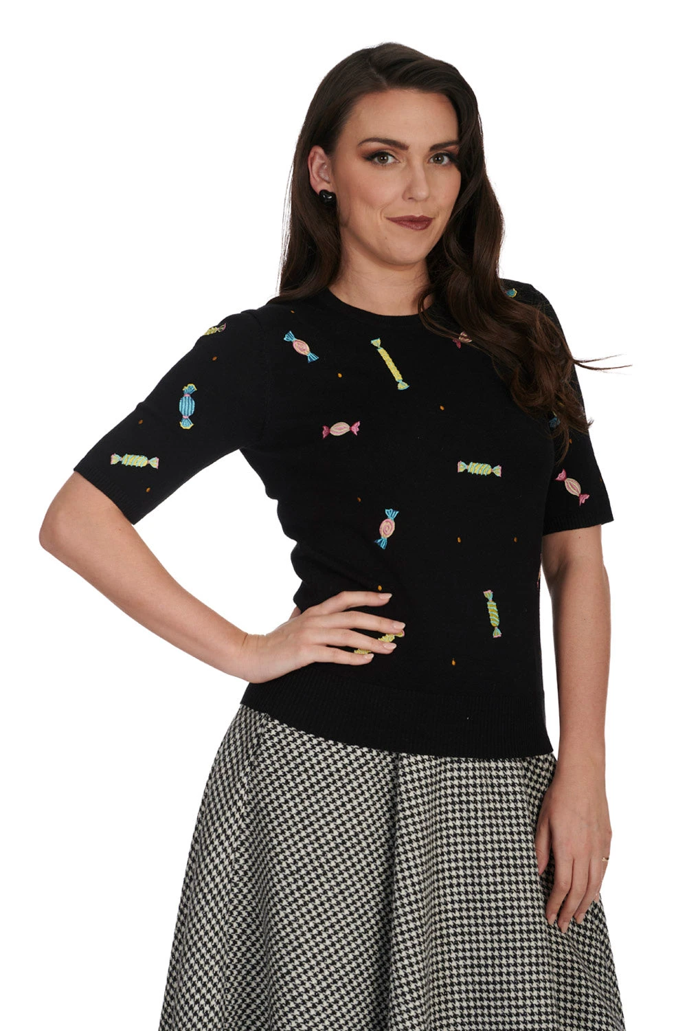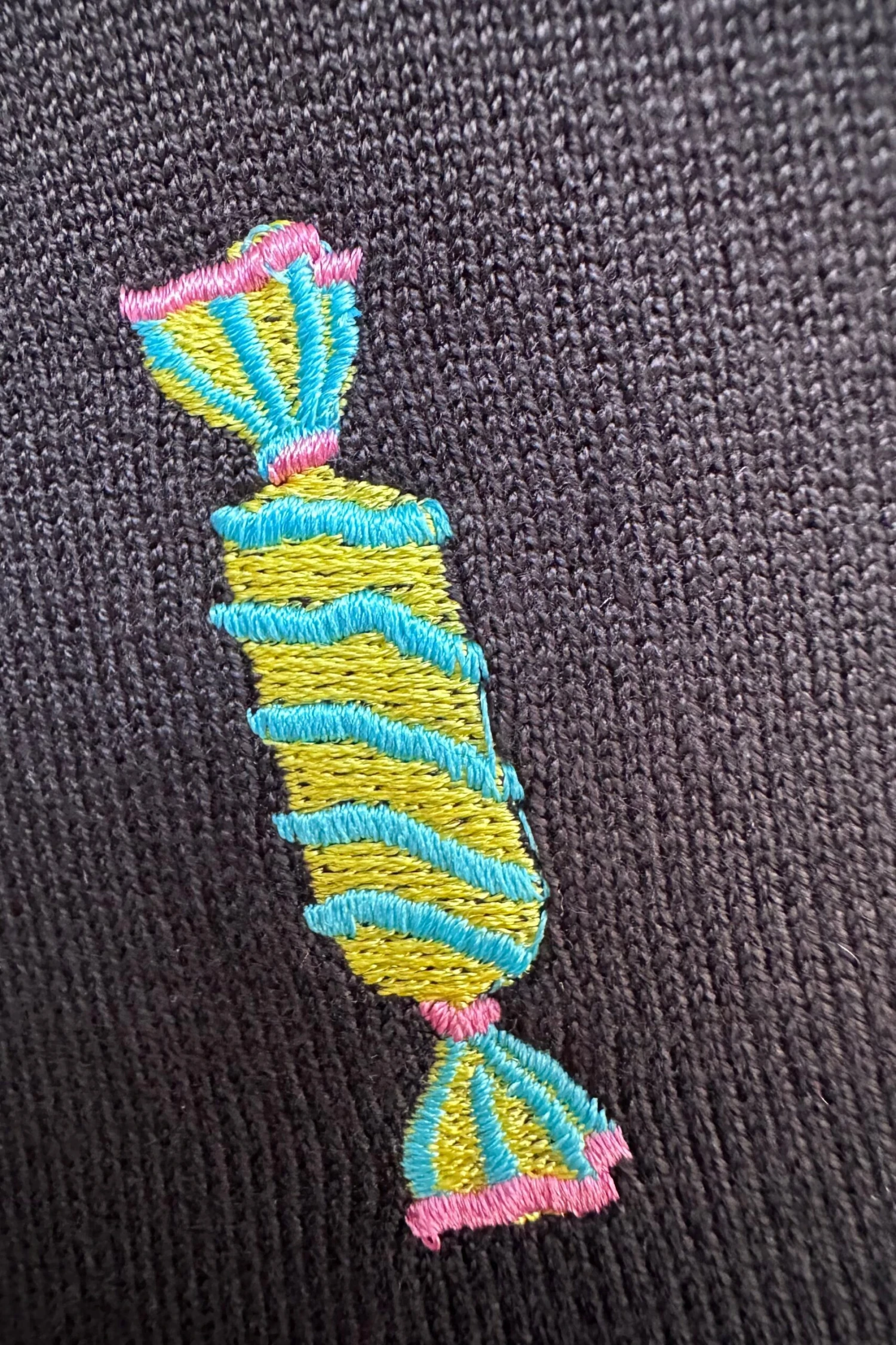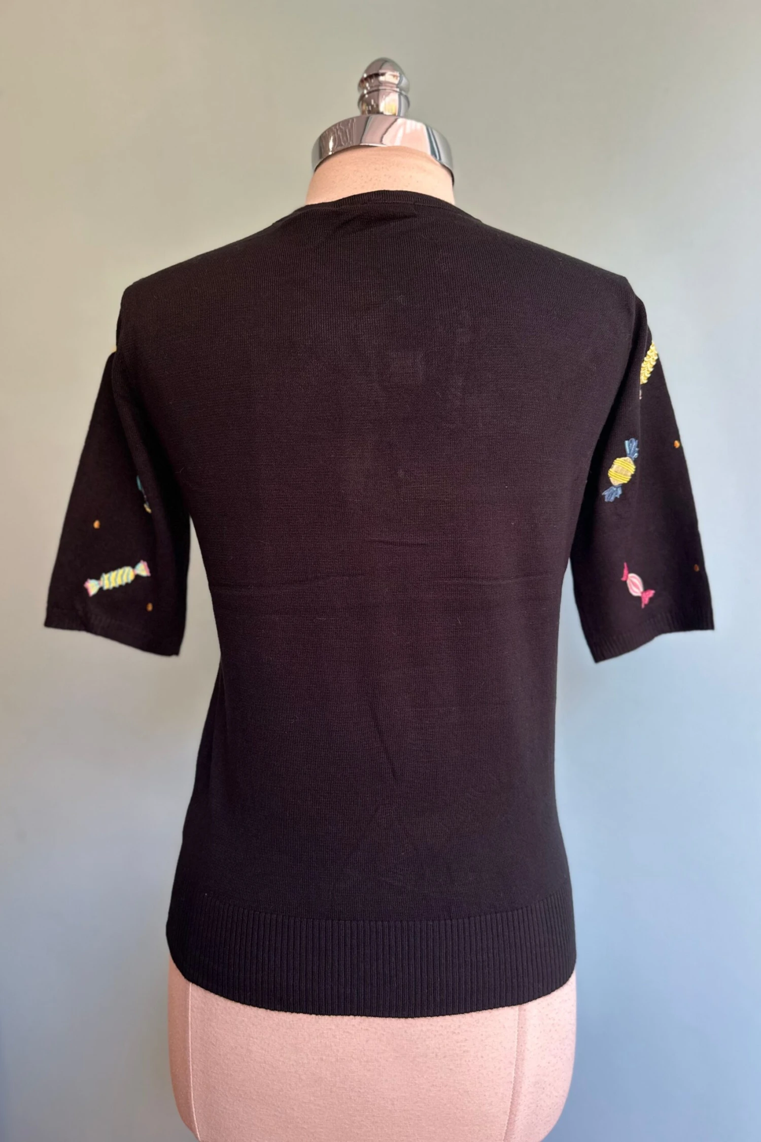 Black crewneck sweater with embroidered candy throughout. This sweater is elbow length and fitted through the body.