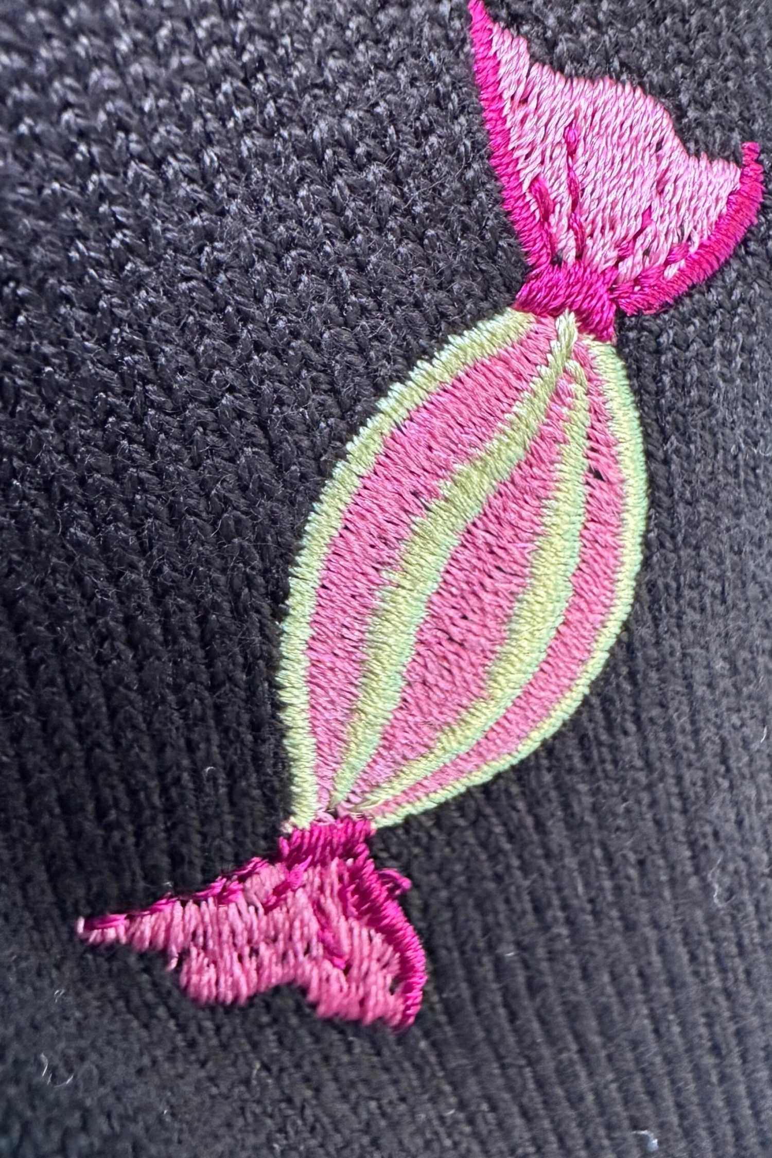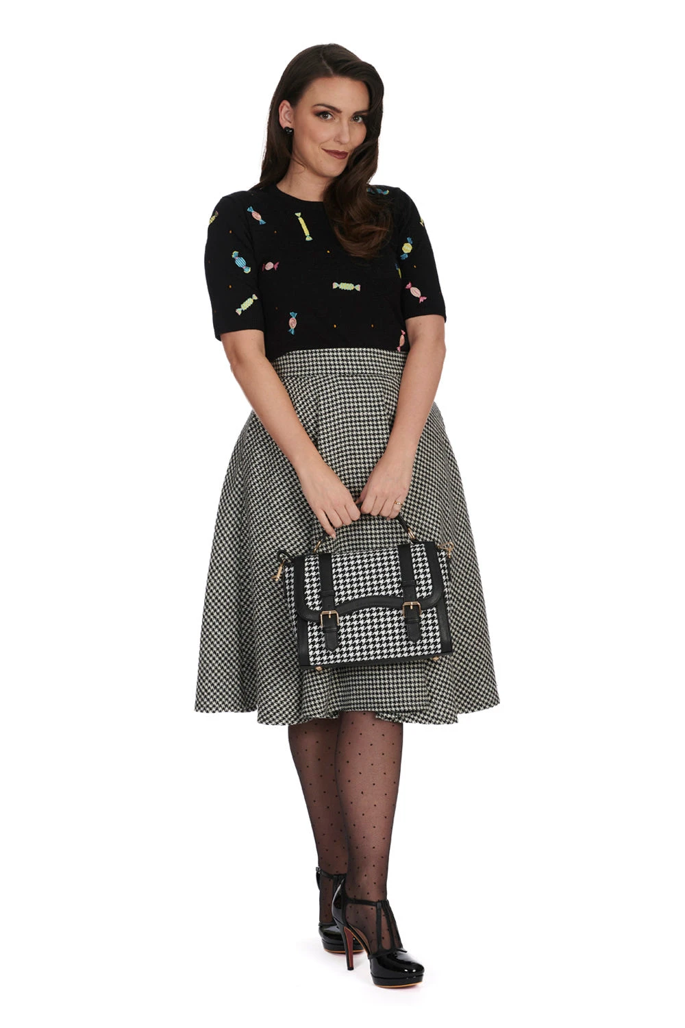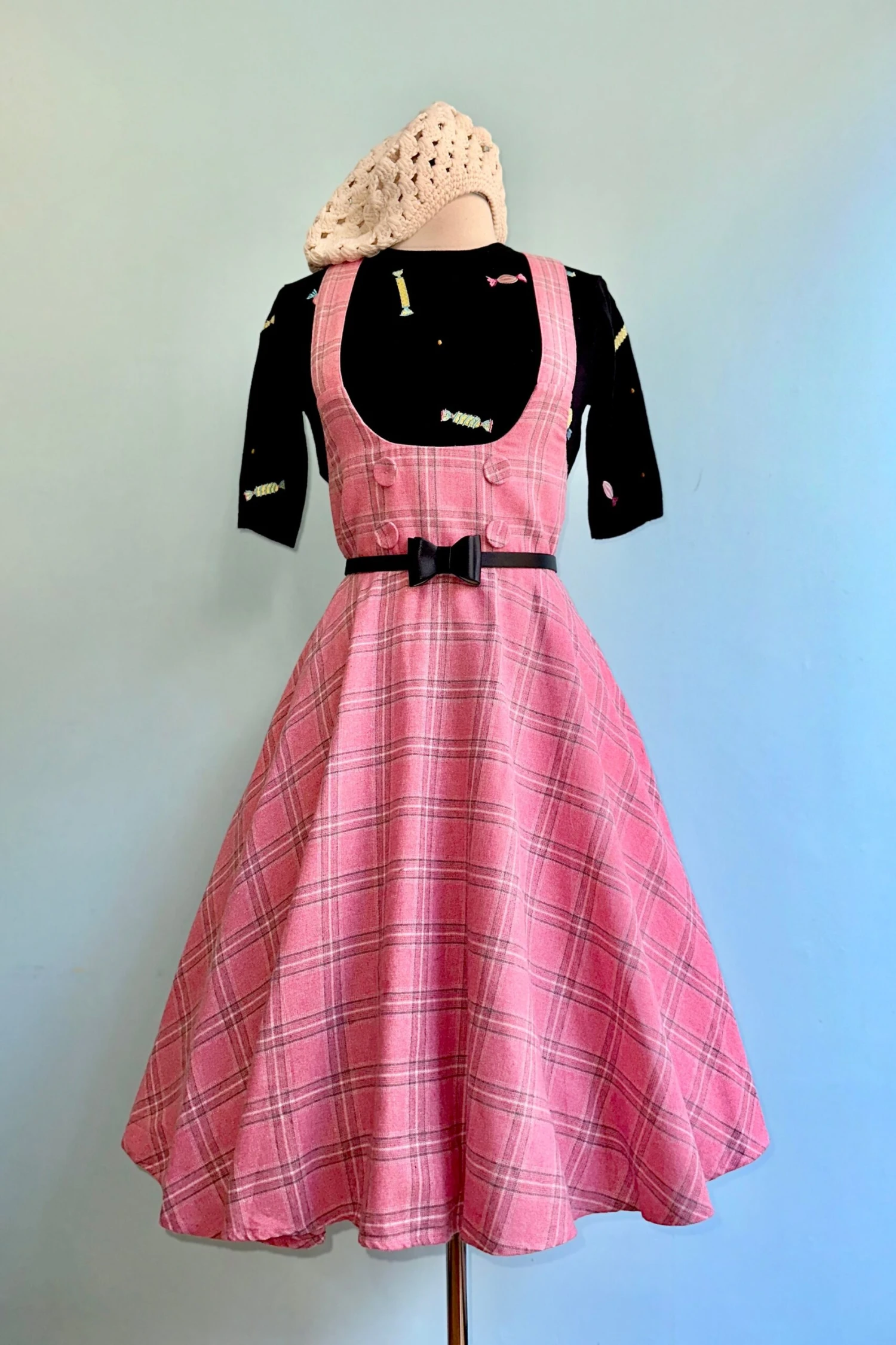 Black crewneck sweater with embroidered candy throughout. This sweater is elbow length and fitted through the body.