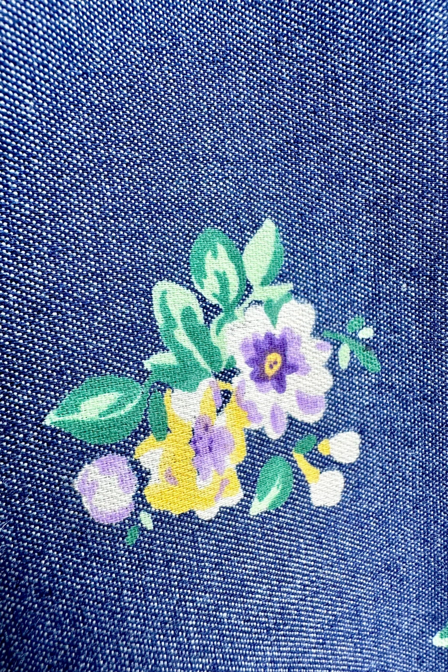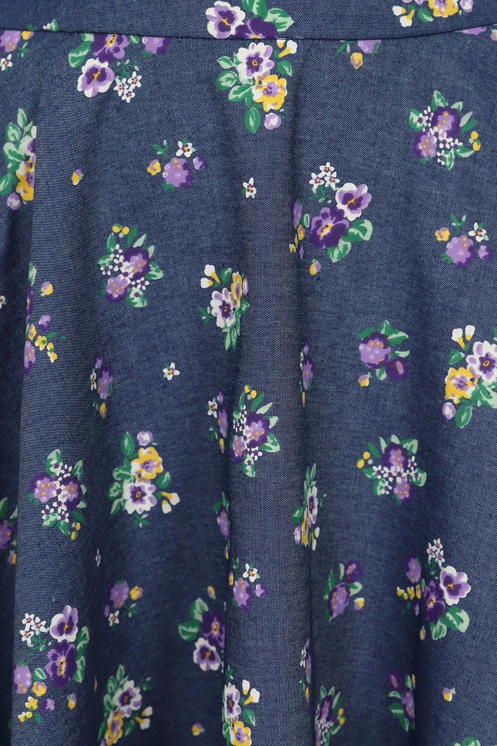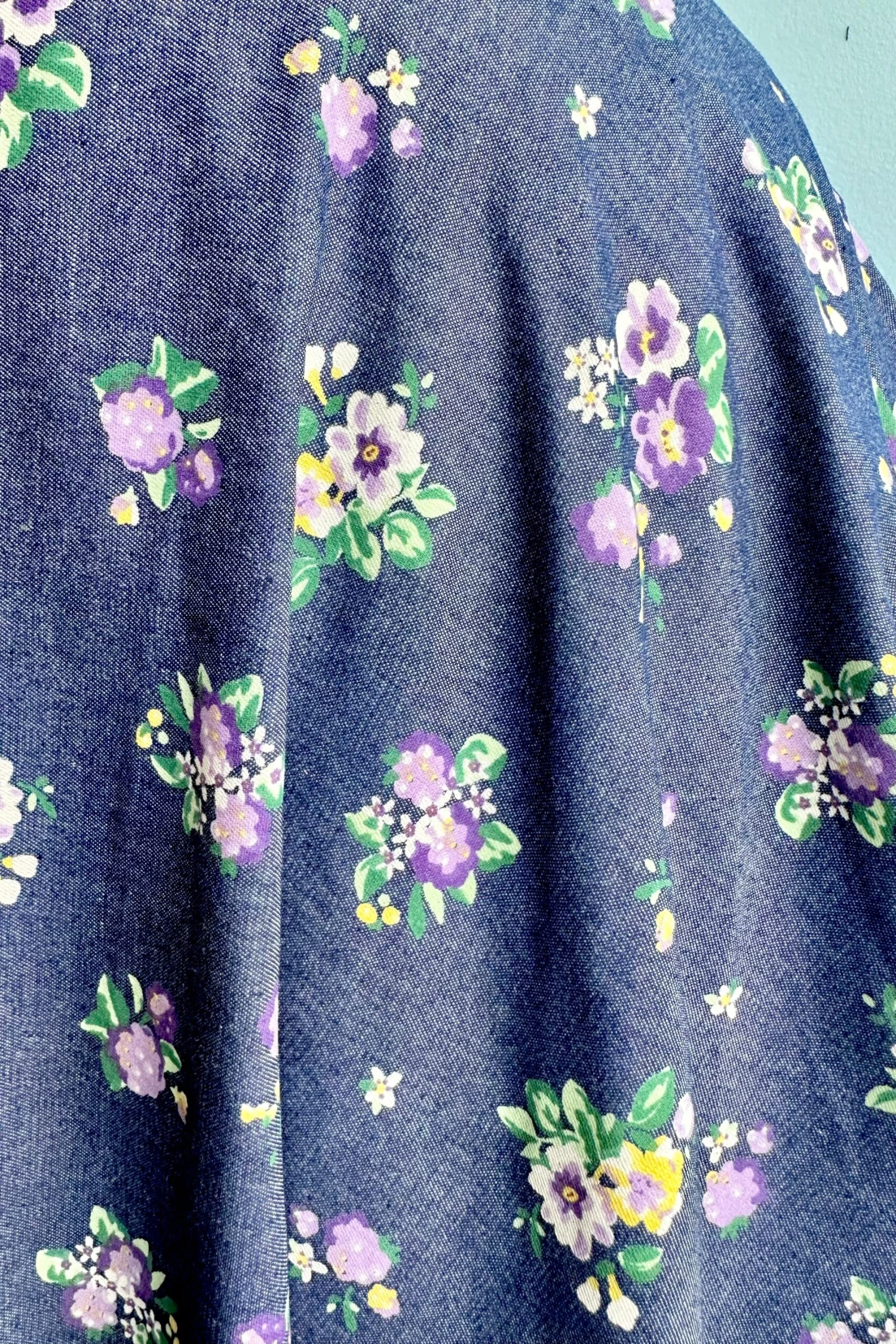 Floral circle skirt in denim blue with yellow, green and purple floral bouquets throughout. Great summer weight! This skirt zips up the back, has hidden side pockets and is not lined.
