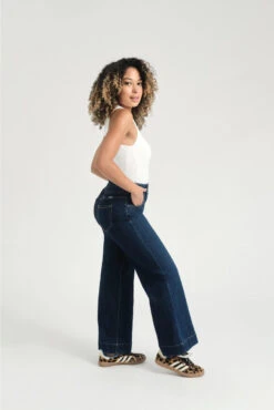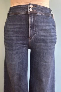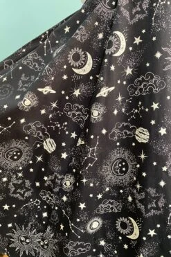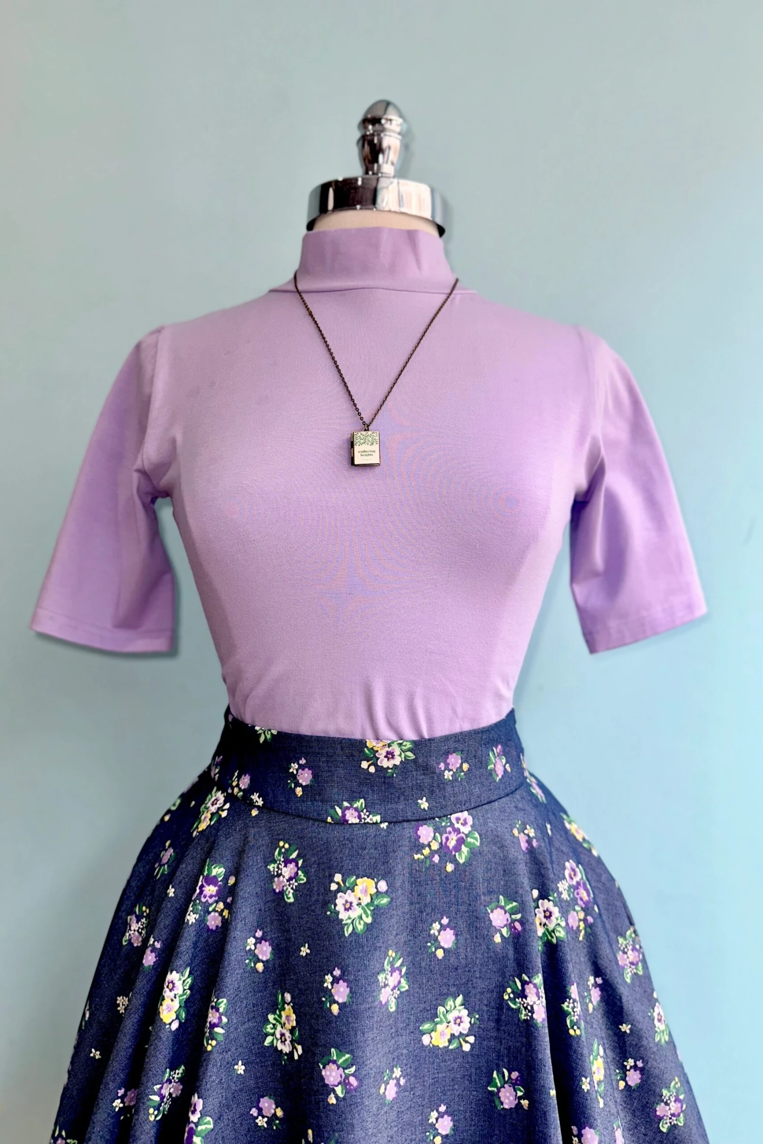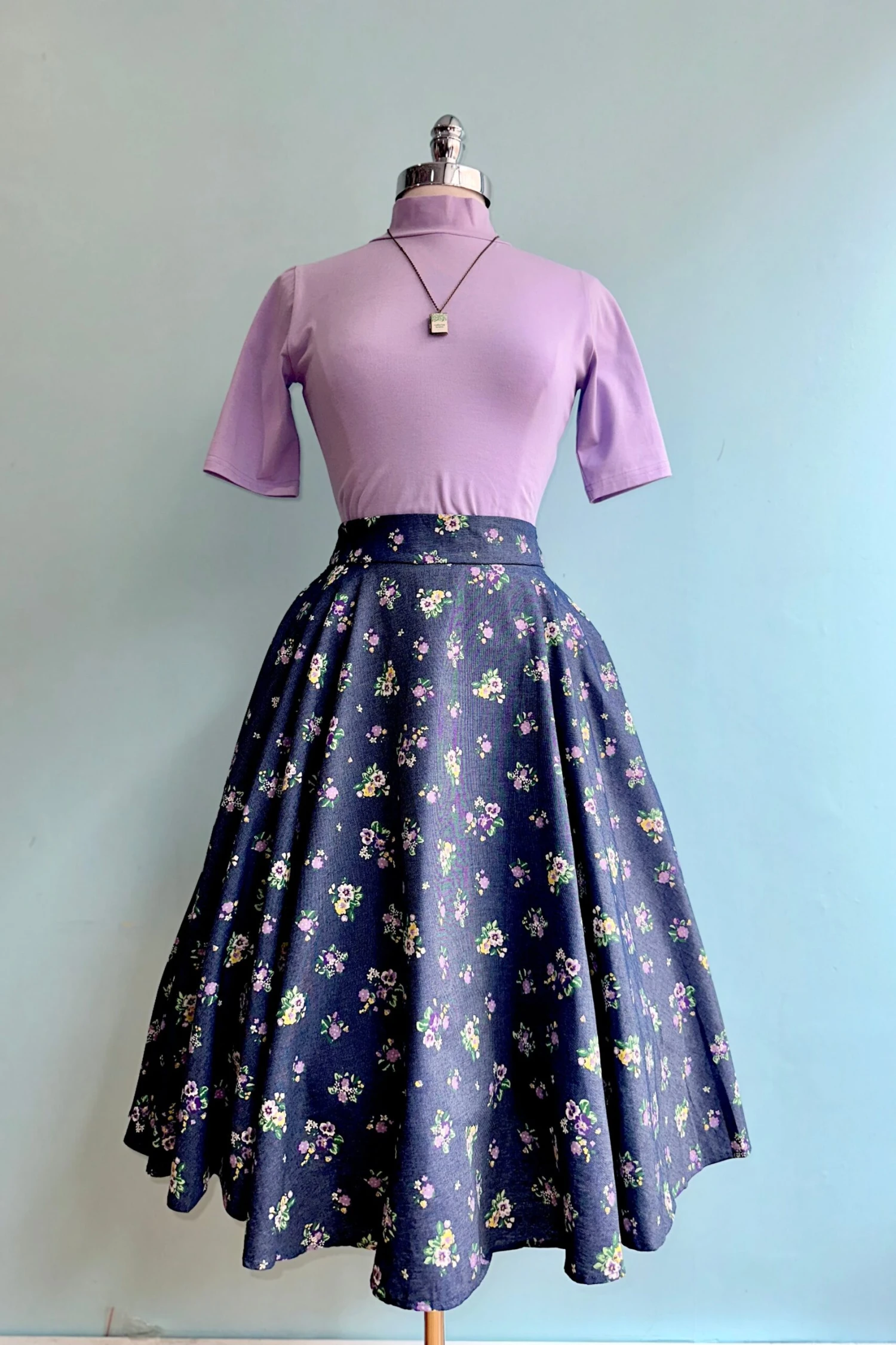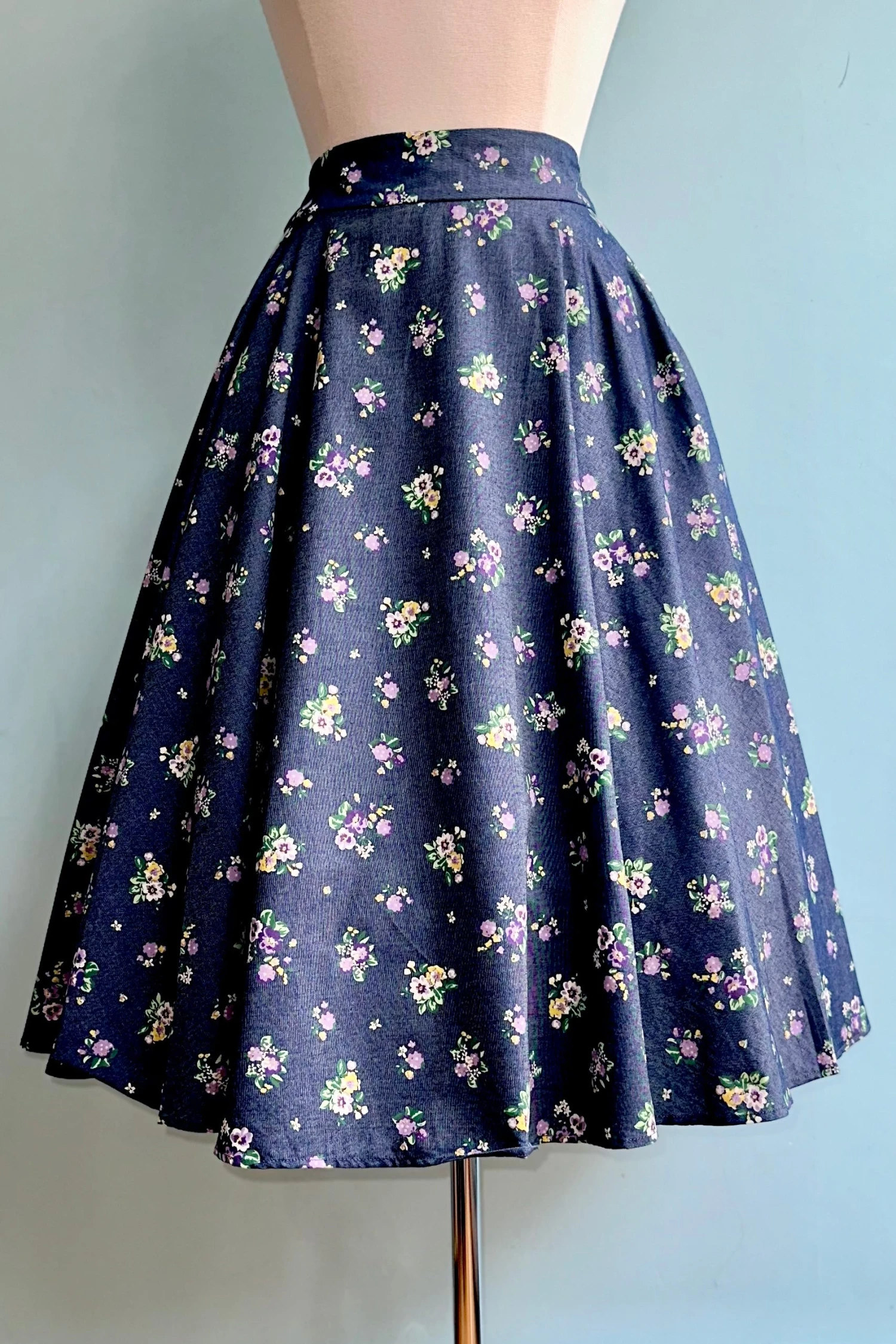 Floral circle skirt in denim blue with yellow, green and purple floral bouquets throughout. Great summer weight! This skirt zips up the back, has hidden side pockets and is not lined.