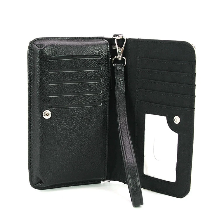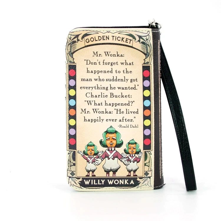 Vinyl wallet made to look like the classic children’s novel Charlie and the Chocolate Factory. There is a snap closure and opens up to a cloth and vinyl lining. There are 10 card slots, a zip coin section and 2 open pockets. The wristlet strap measures 6″ and is removable.