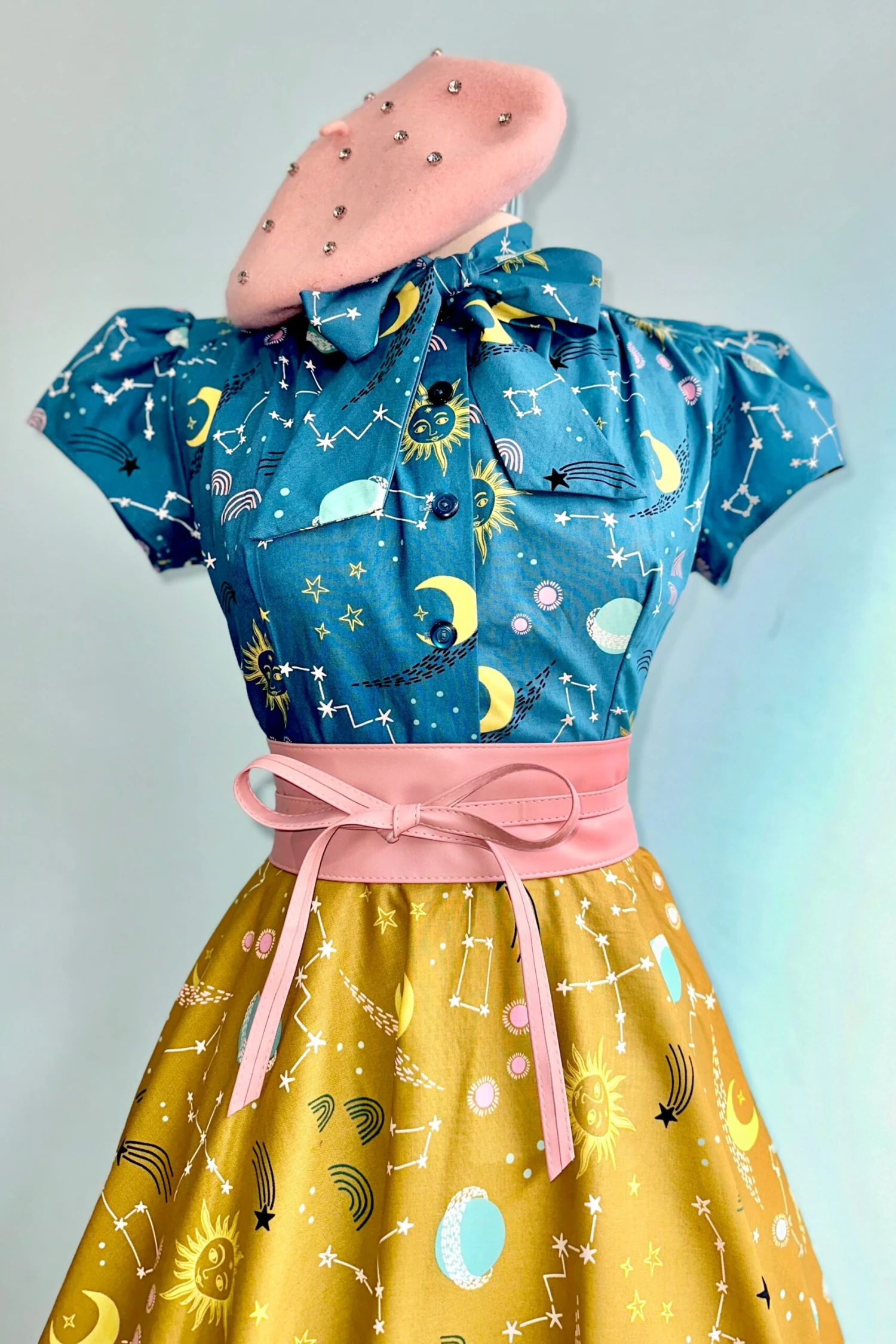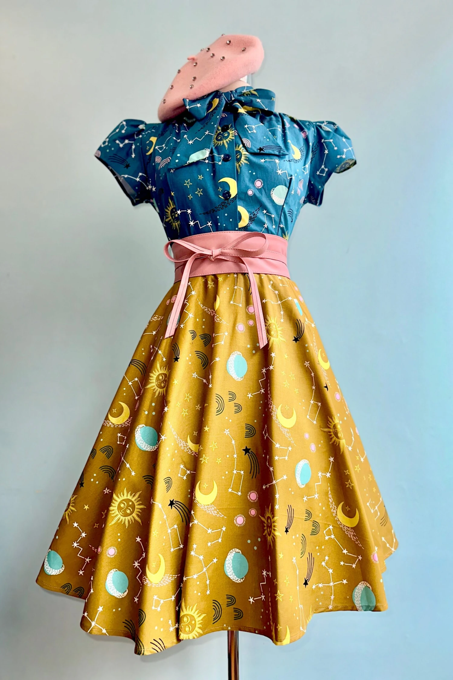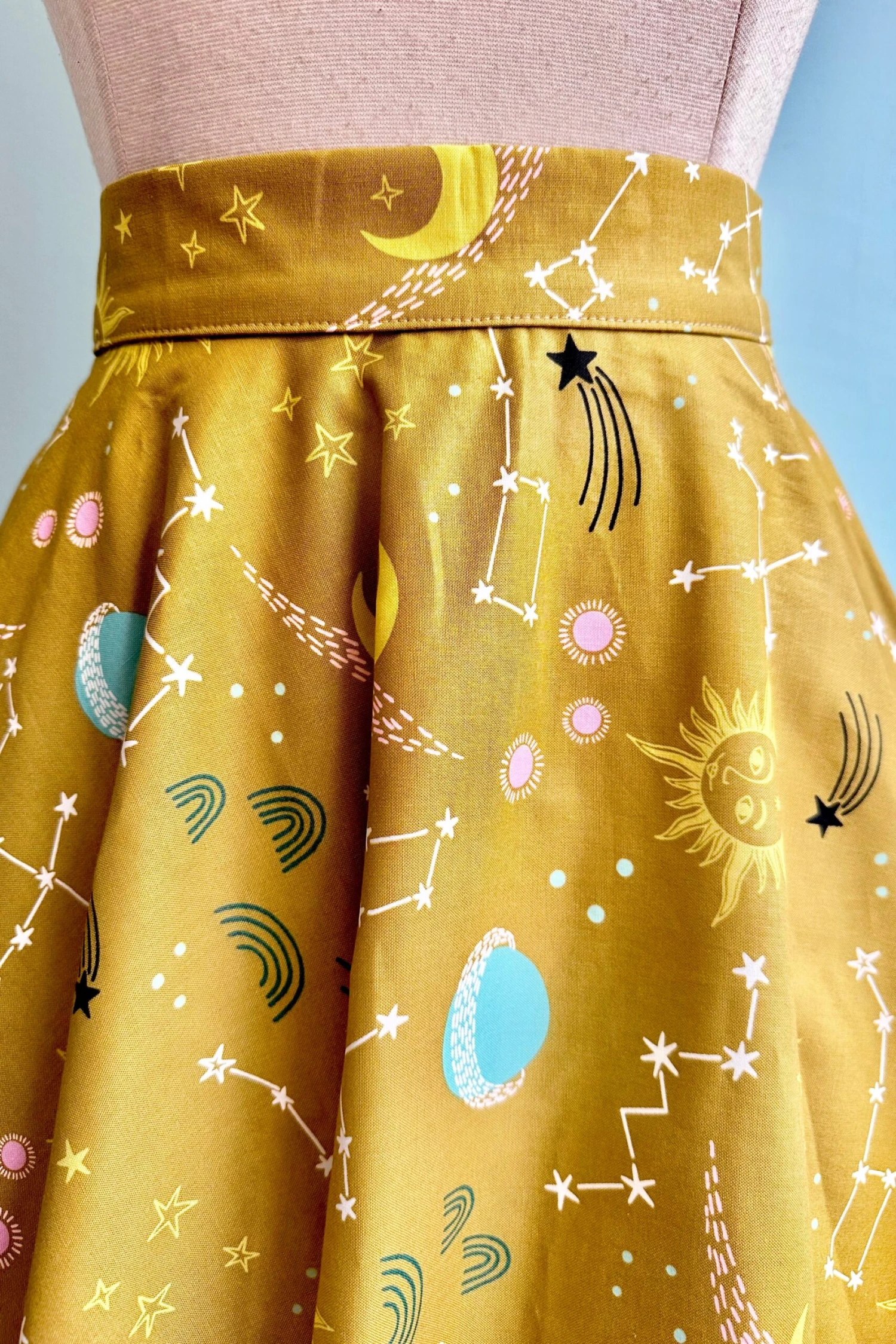 Gorgeous fabric in chartreuse greenish yellow with constellations, moons and rainbows in pink, yellow, black and white throughout. This is 100% cotton, has pockets and zips up the back. Full circle skirt shape. Not lined.