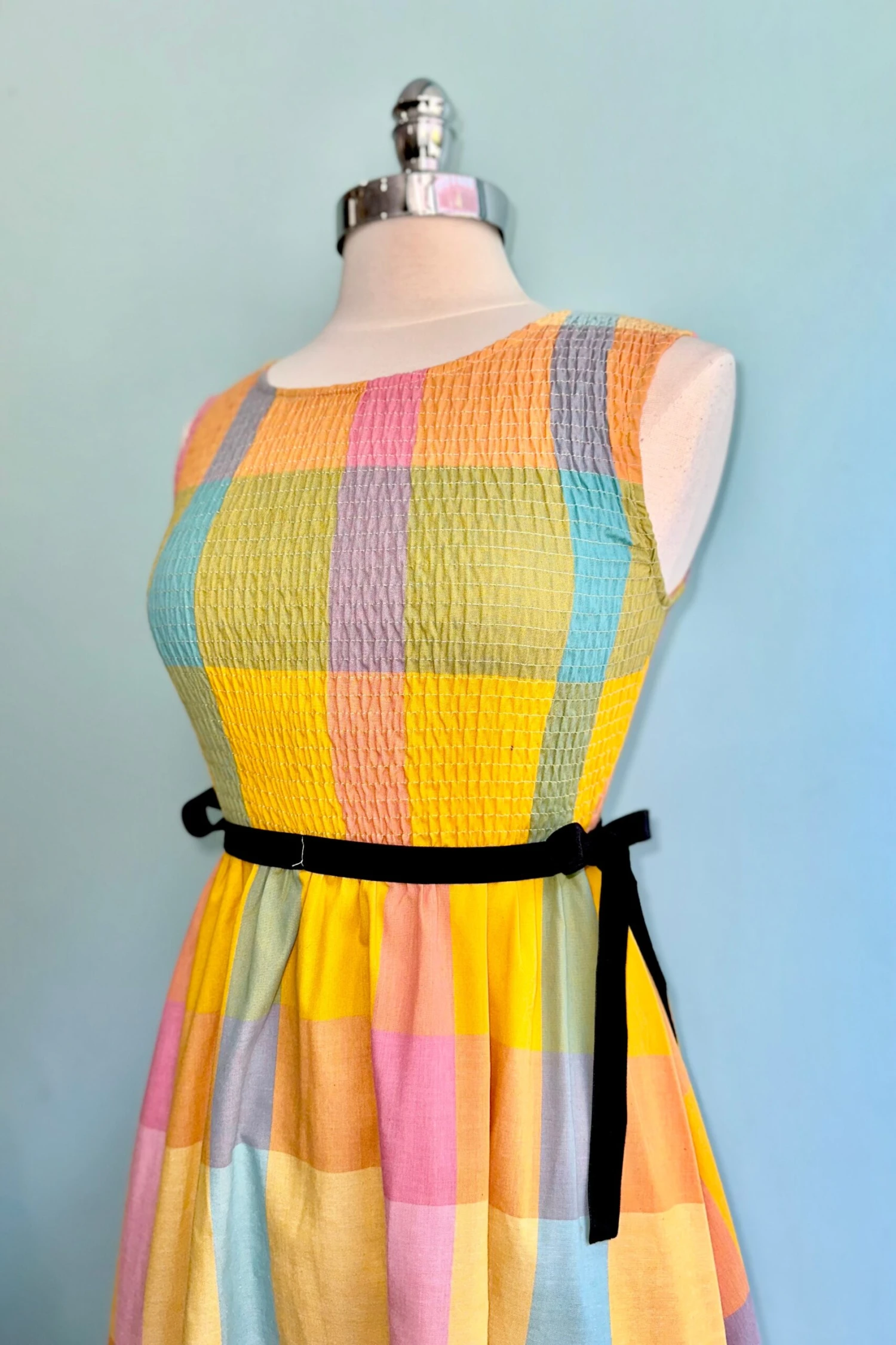 Colorful plaid dress with a smocked tank bodice and a full midi length skirt. This dress has an attached black velvet belt. The skirt is lined and has side pockets.
