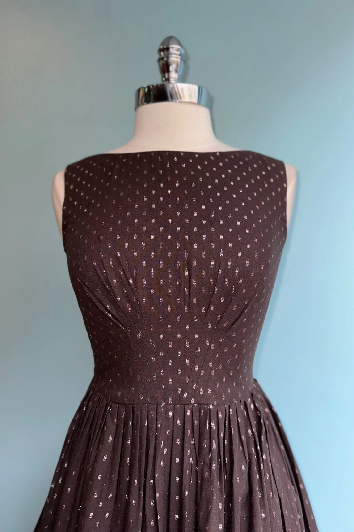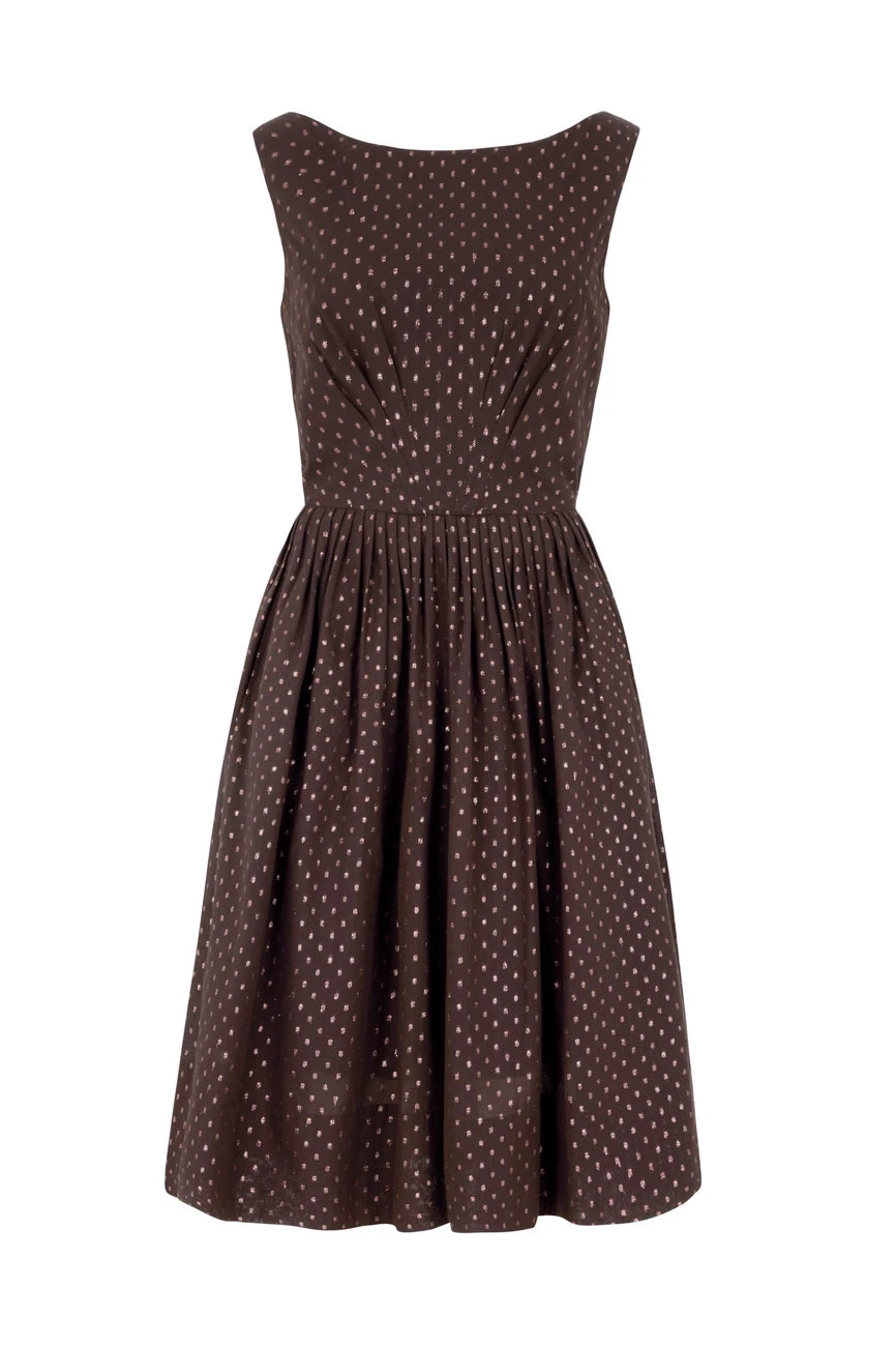 Chocolate brown dress with rose gold metallic dots throughout. This dress has knife pleating at the waist, hidden side pockets and zips up the back. Fully lined.