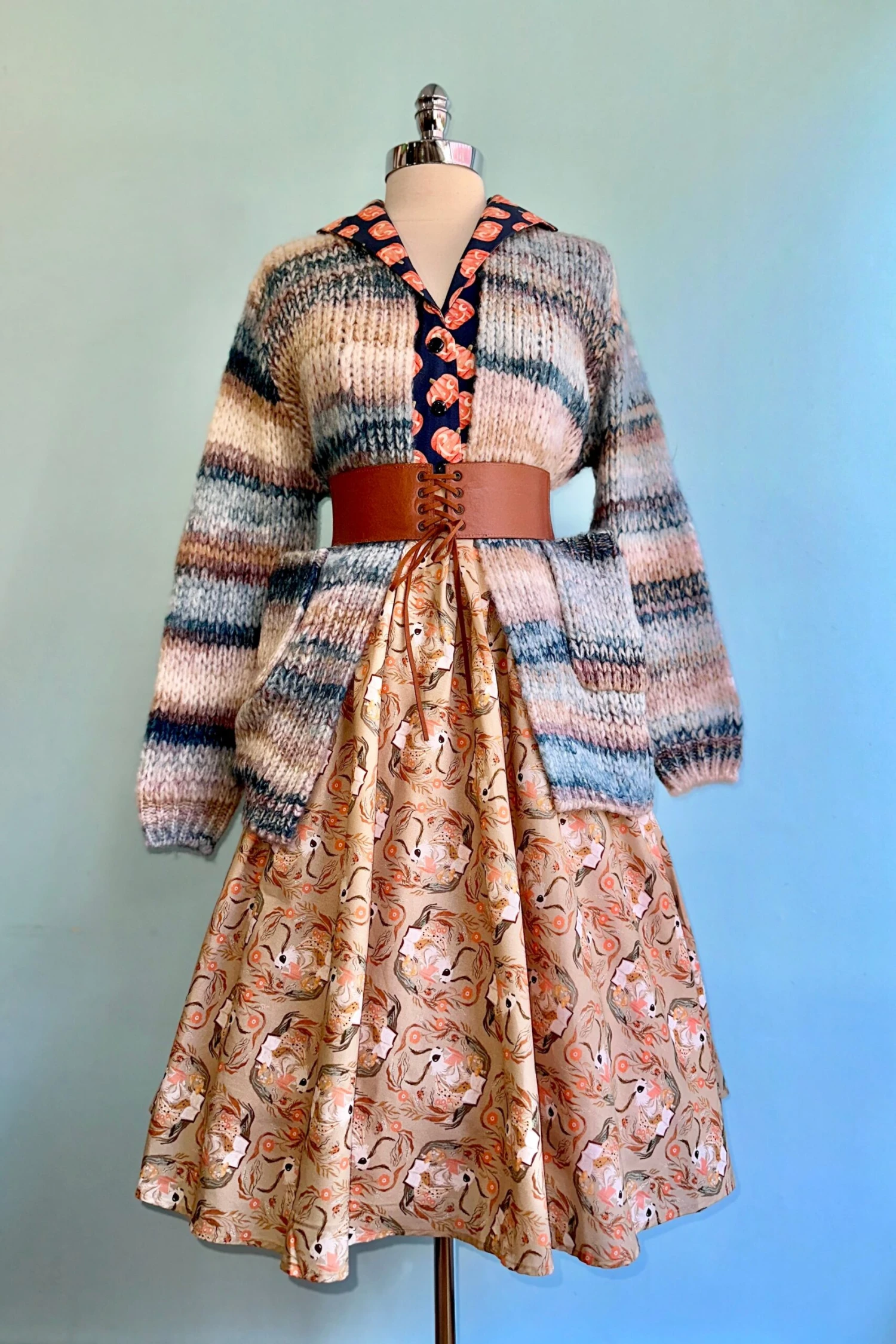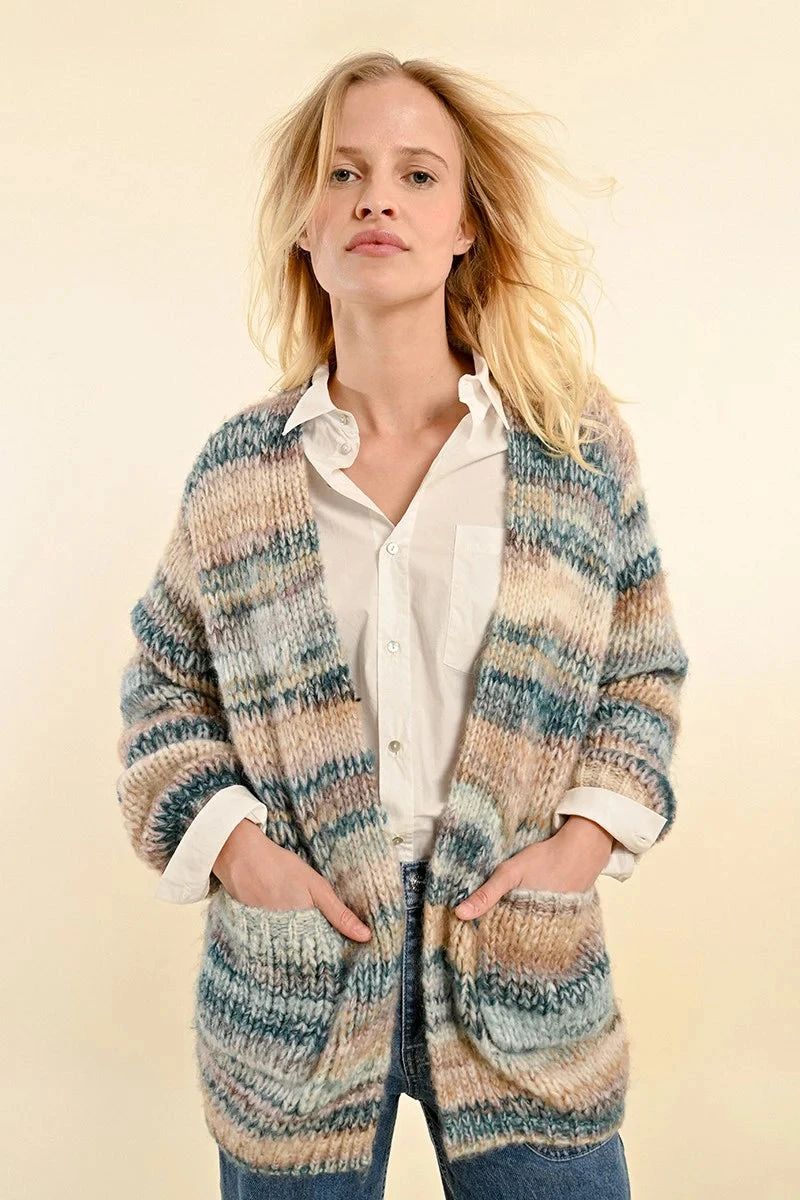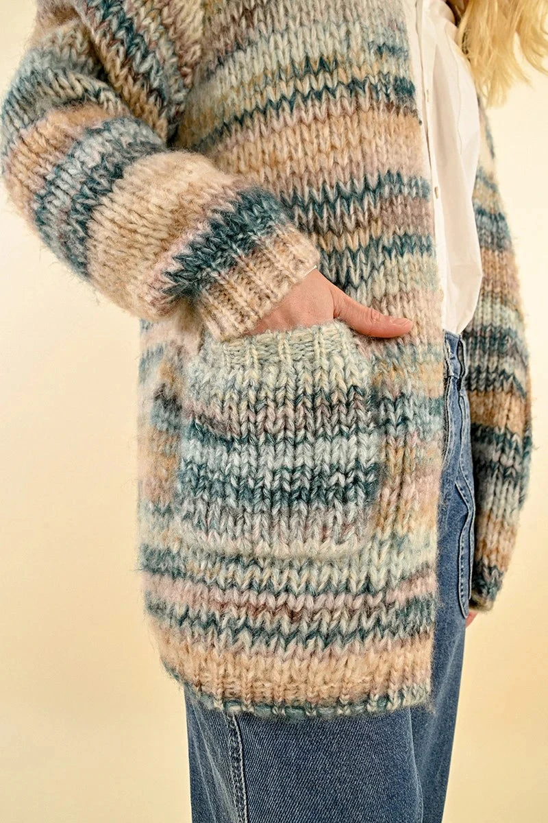 Super soft cardigan in blue and tan. This cardigan is open, is about hip length and has front pockets.