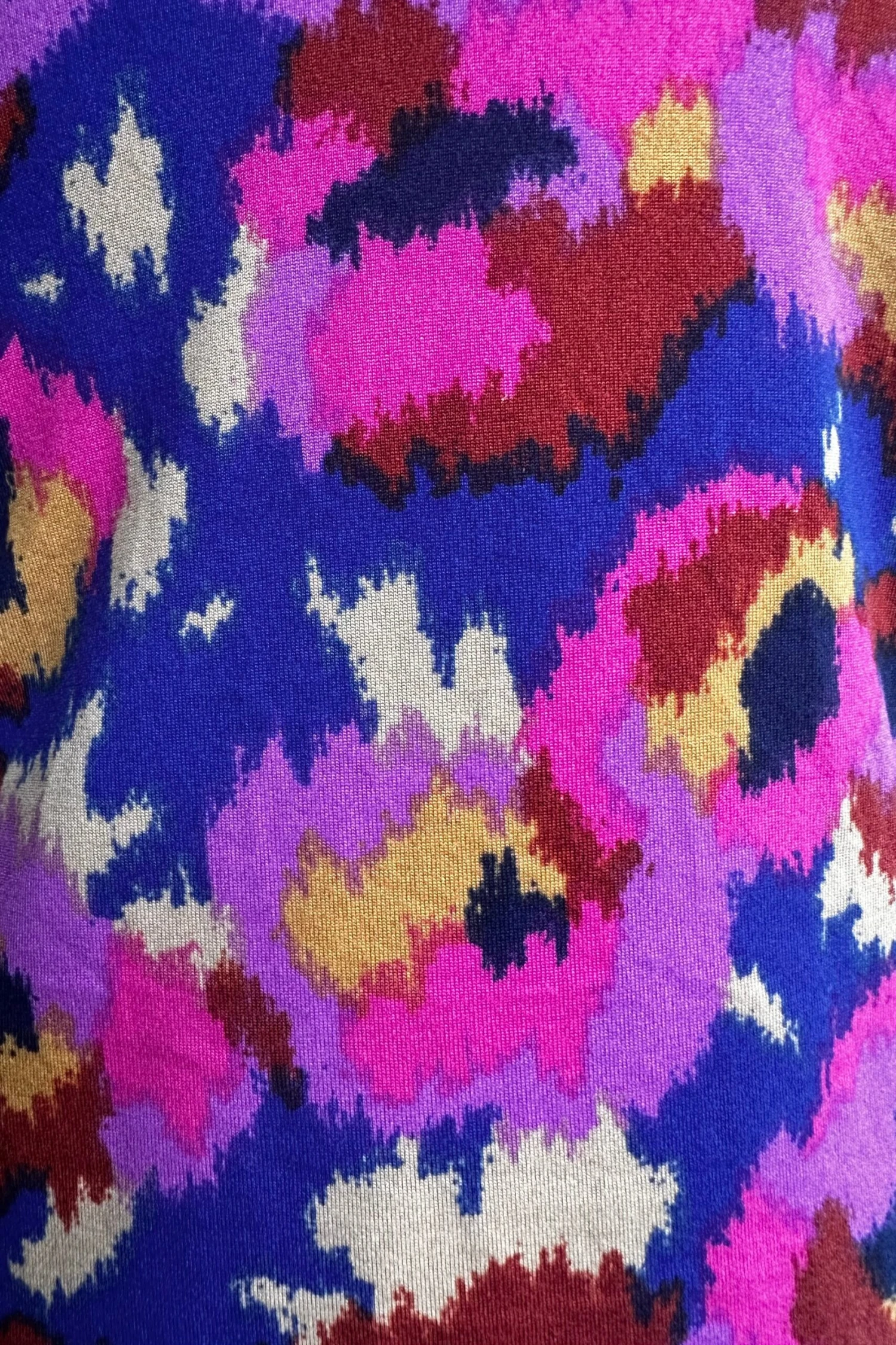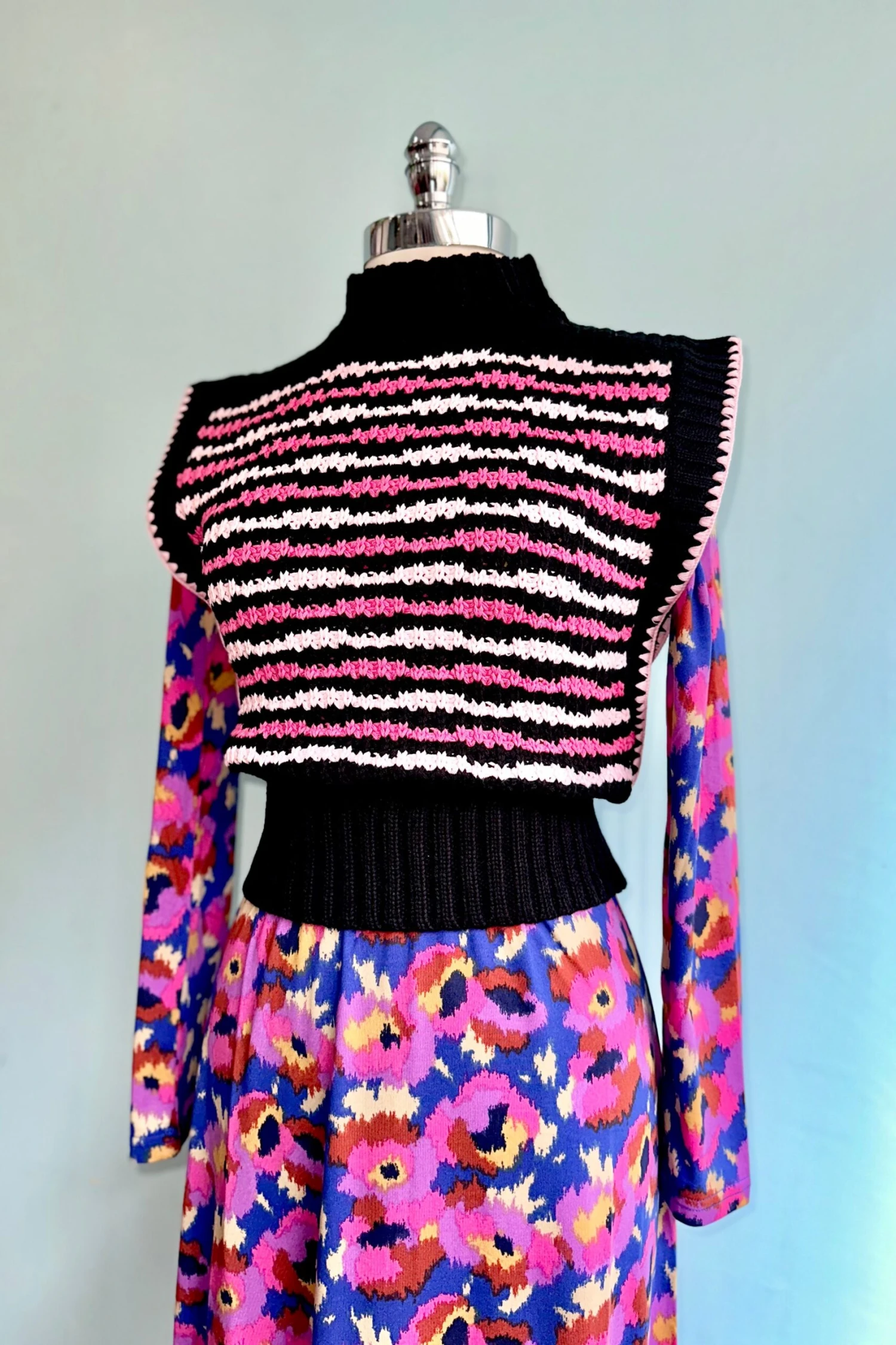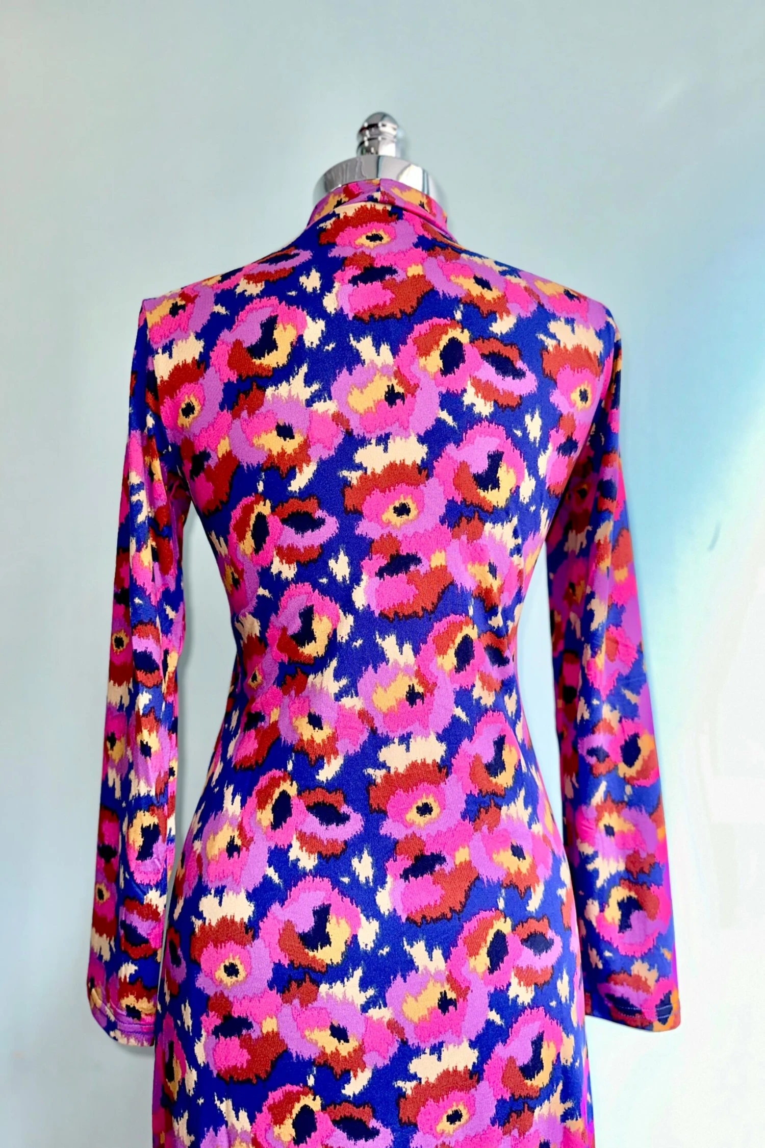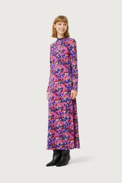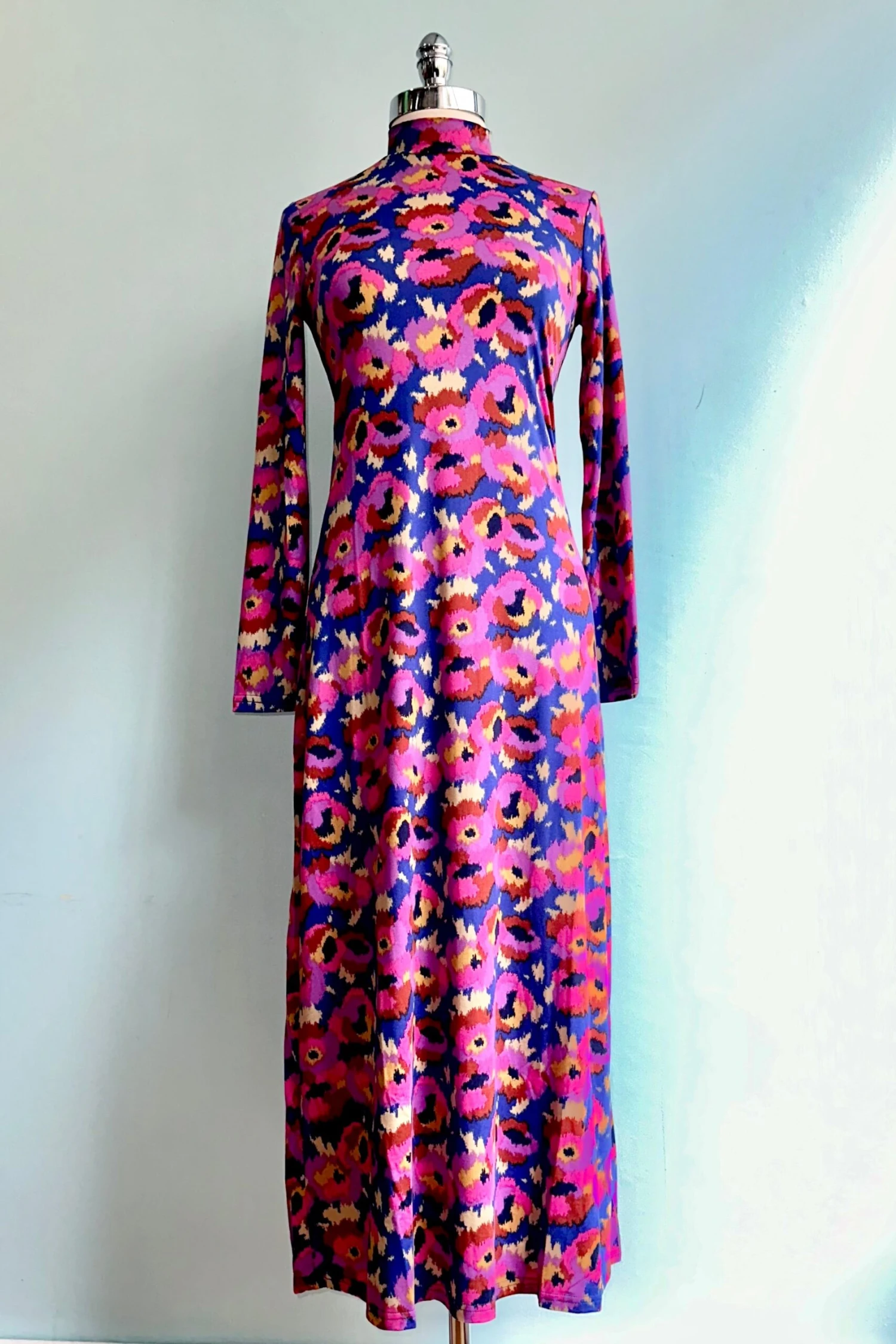 Long knitted dress with vibrant hues of blue, purple, pink, brown, yellow and white flower print. With mock neck and long sleeves.