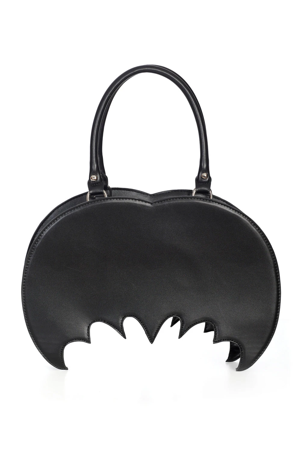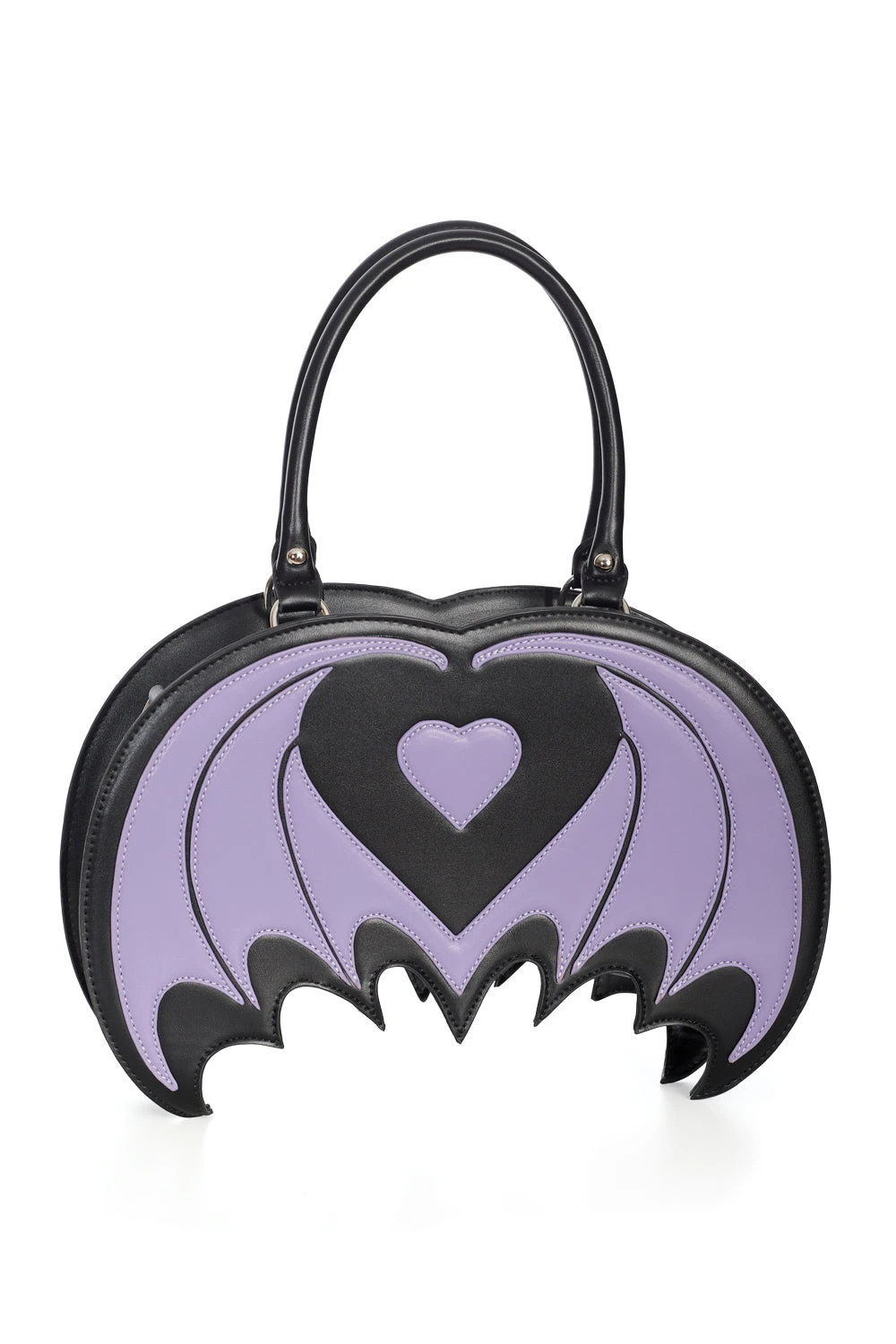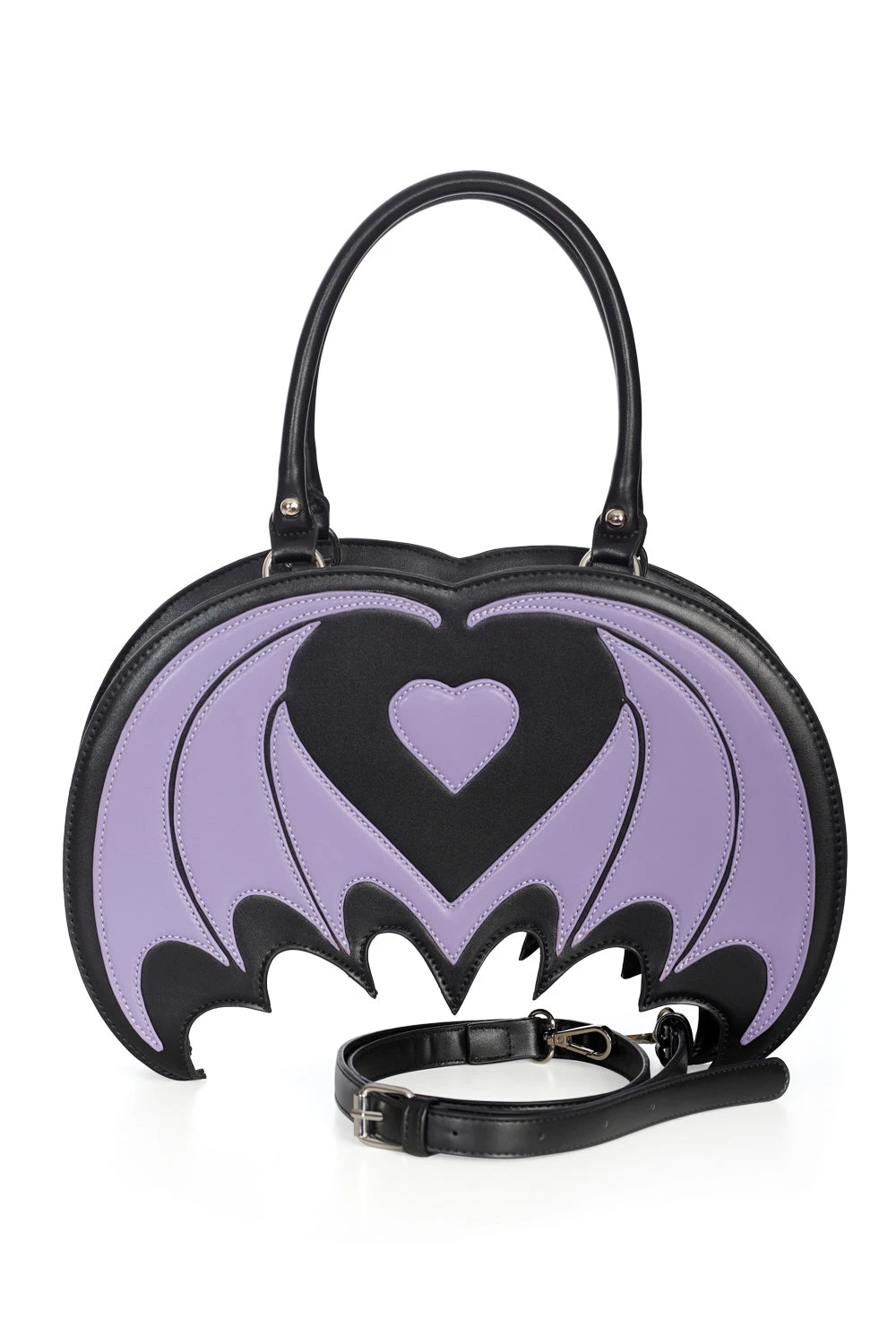 Black bat shaped handbag with purple wings and center heart. This bag has a short satchel handle, a long messenger strap and a zip closure.