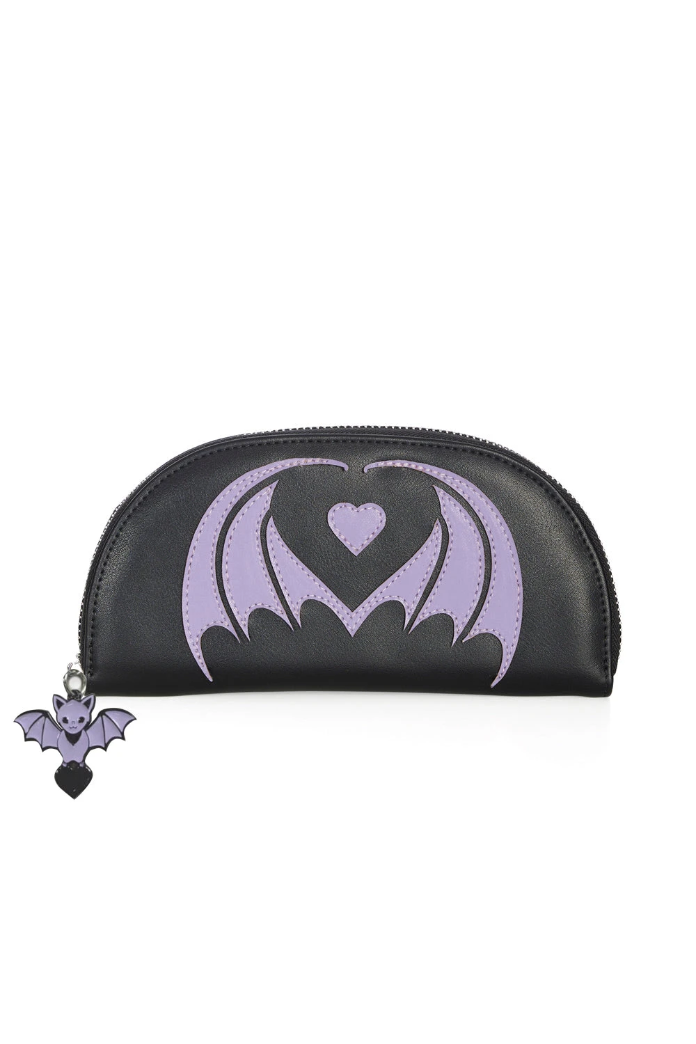 Black and purple bat wallet with a sip top. There is one big zip that opens to card slots and a zipper coin area.