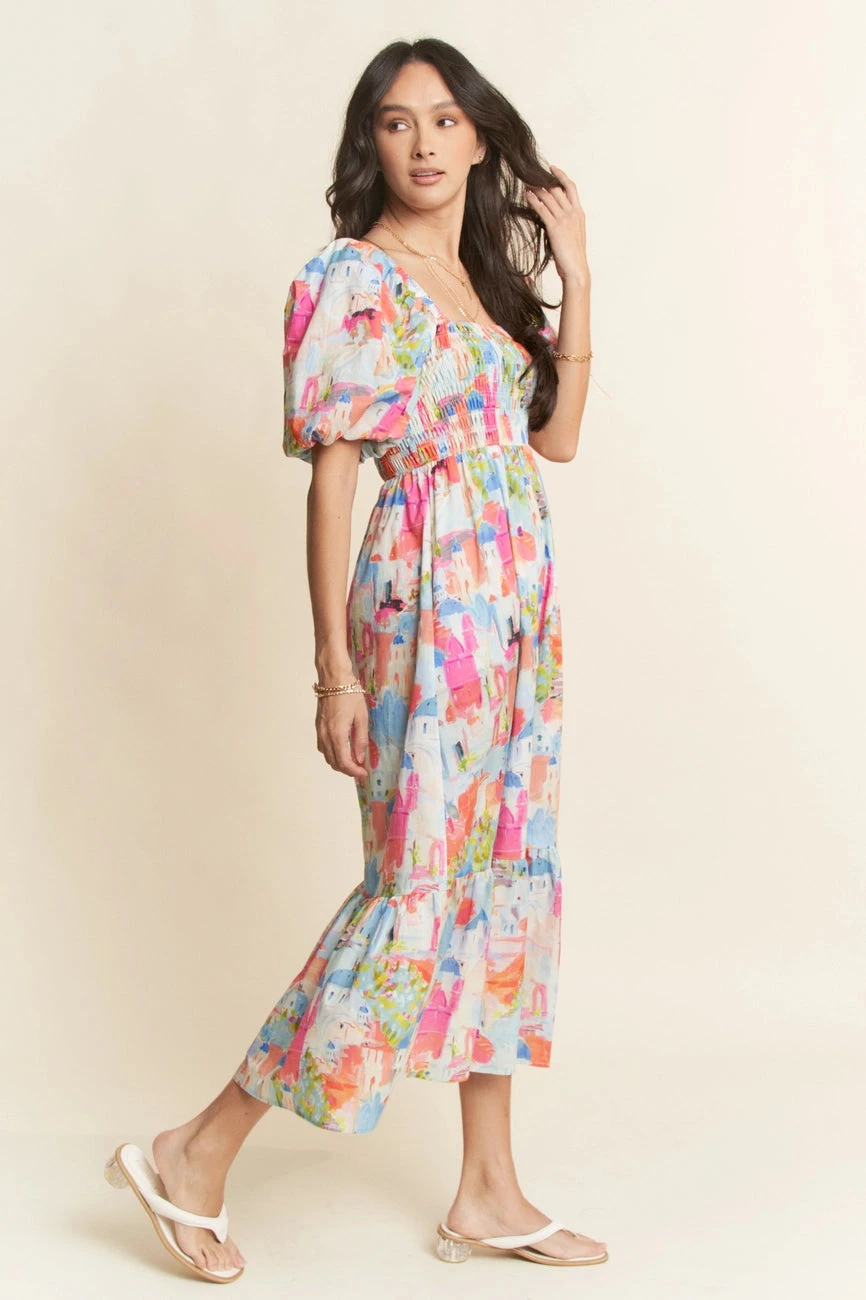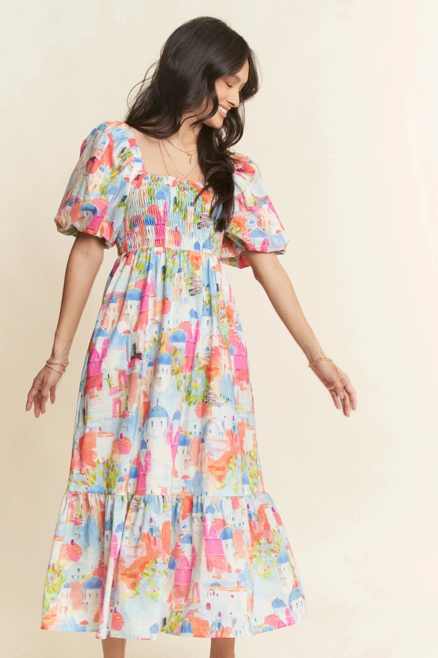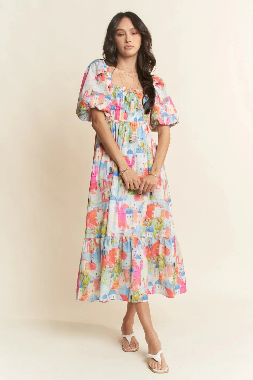 Short balloon sleeve midi dress with a countryside scene in pink, green, and blue. This dress has an elasticized square neckline and a fully smocked bodice. The sleeves are short, elasticized, and puffed. The skirt is midi length with side pockets. This dress is fully lined.