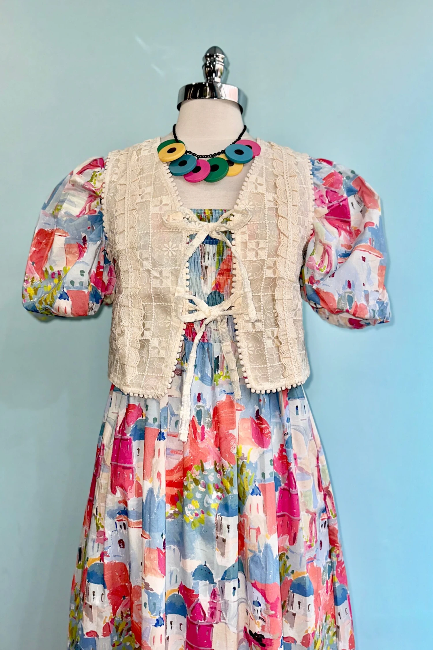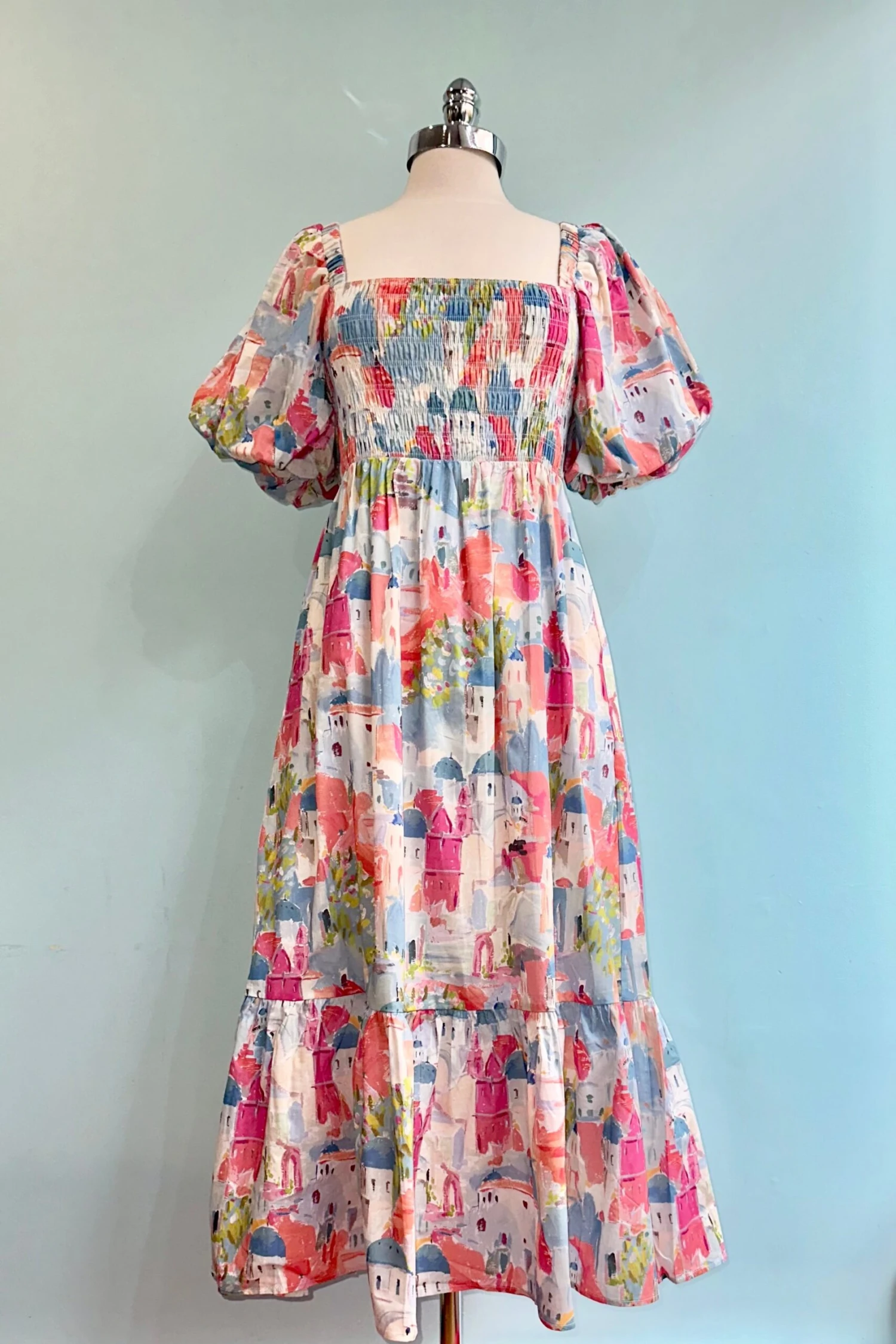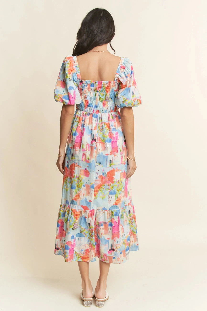 Short balloon sleeve midi dress with a countryside scene in pink, green, and blue. This dress has an elasticized square neckline and a fully smocked bodice. The sleeves are short, elasticized, and puffed. The skirt is midi length with side pockets. This dress is fully lined.