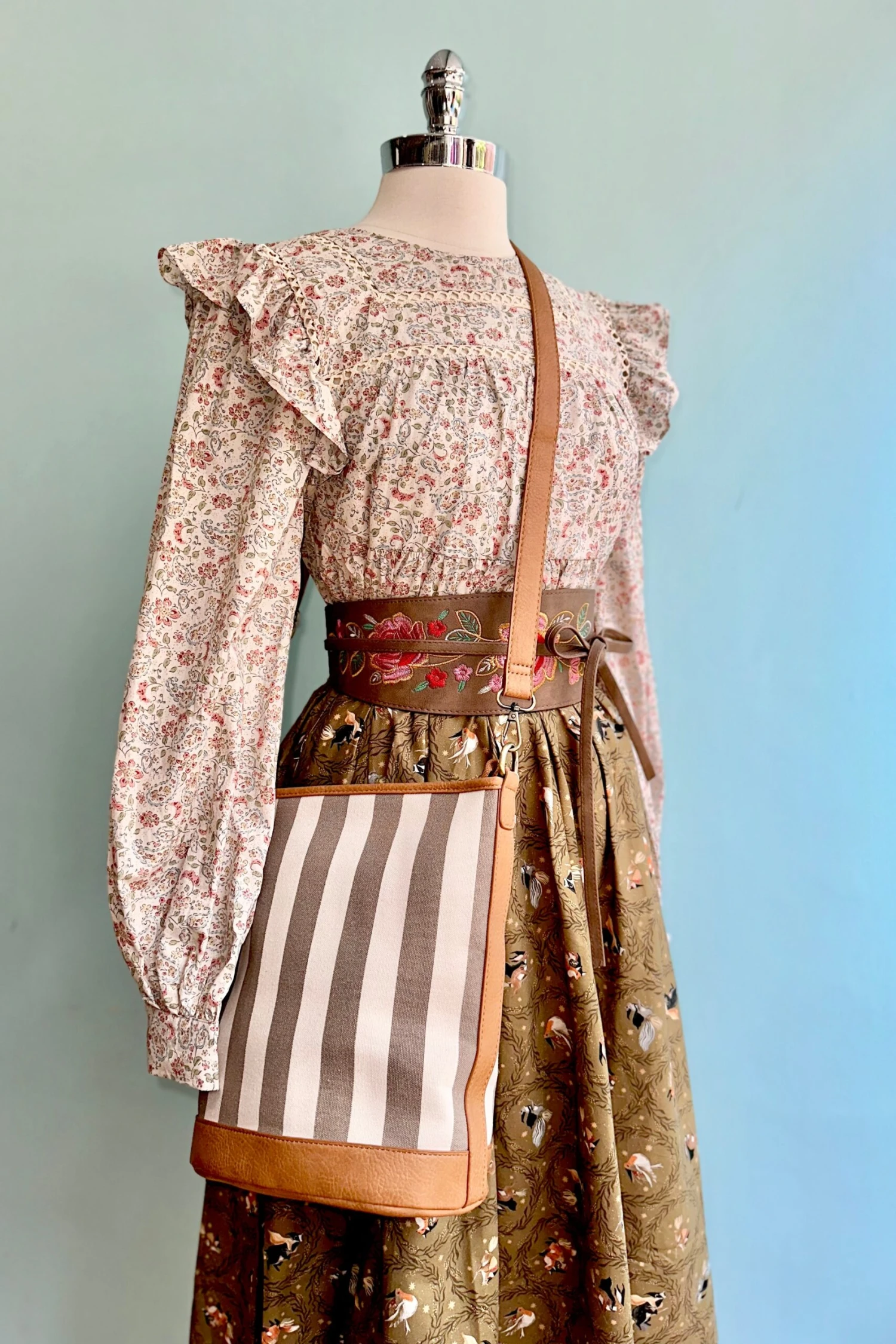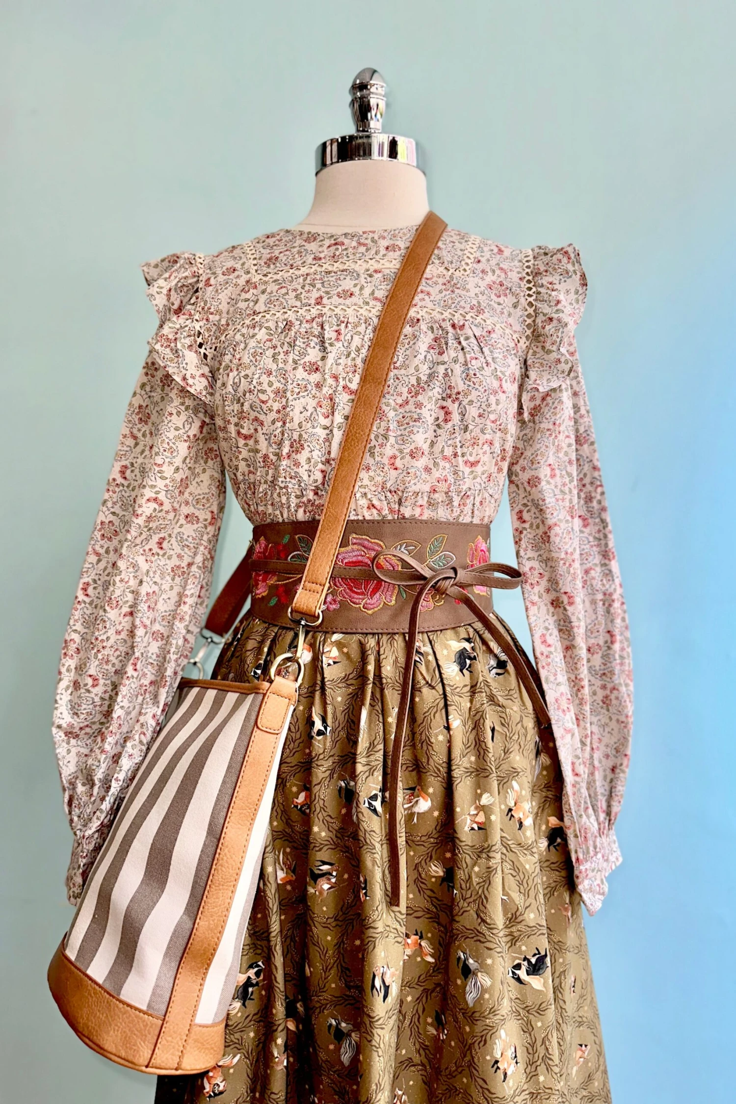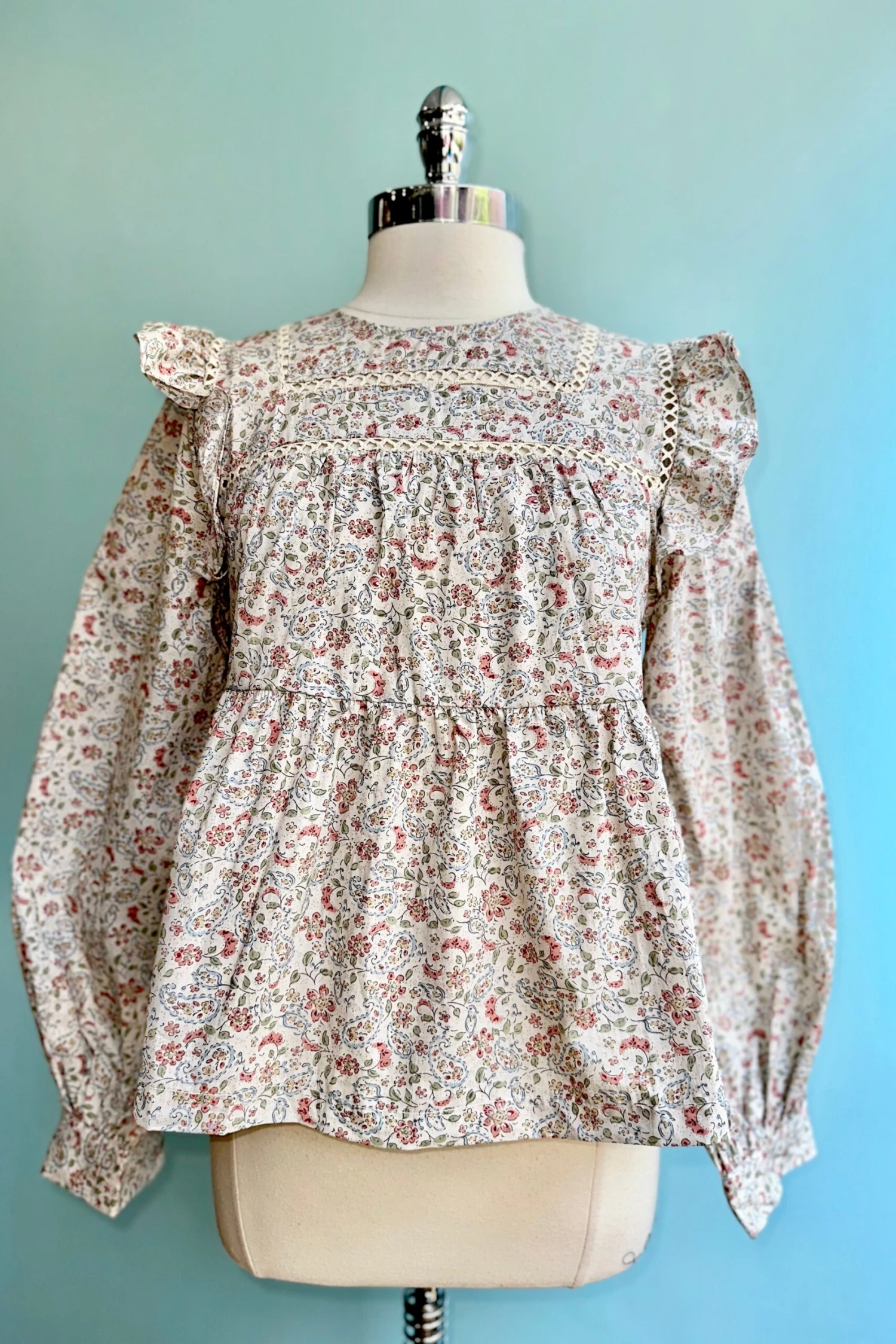 Ruffled puff sleeve lace trim top with a rounded neckline and a lace trim on front and back yoke. The sleeves are long puffs with ruffles at shoulders and a summary cuff. This top has a keyhole back with summary closure. The fabric is cream with little pink, green and blue paisley and floral print.