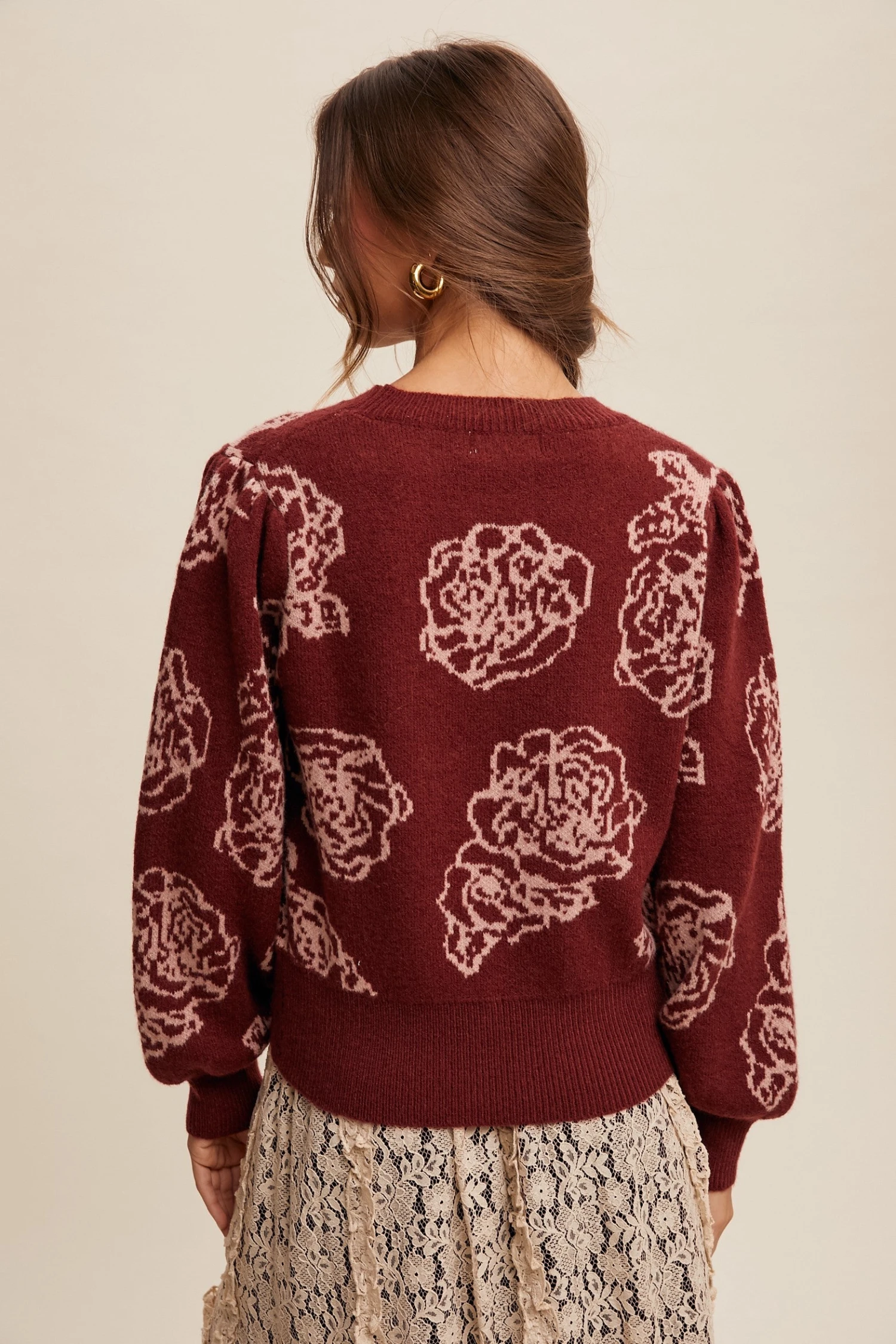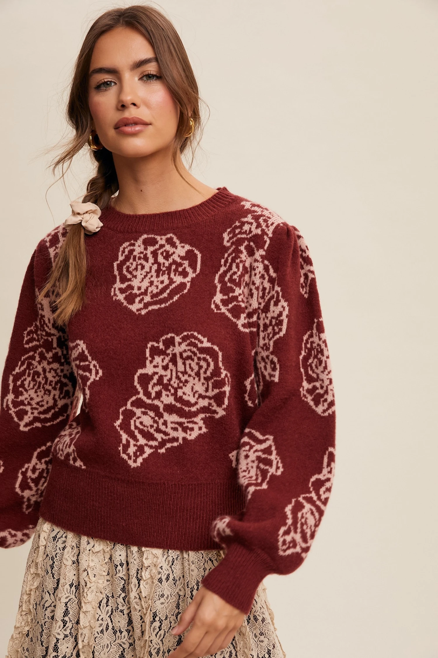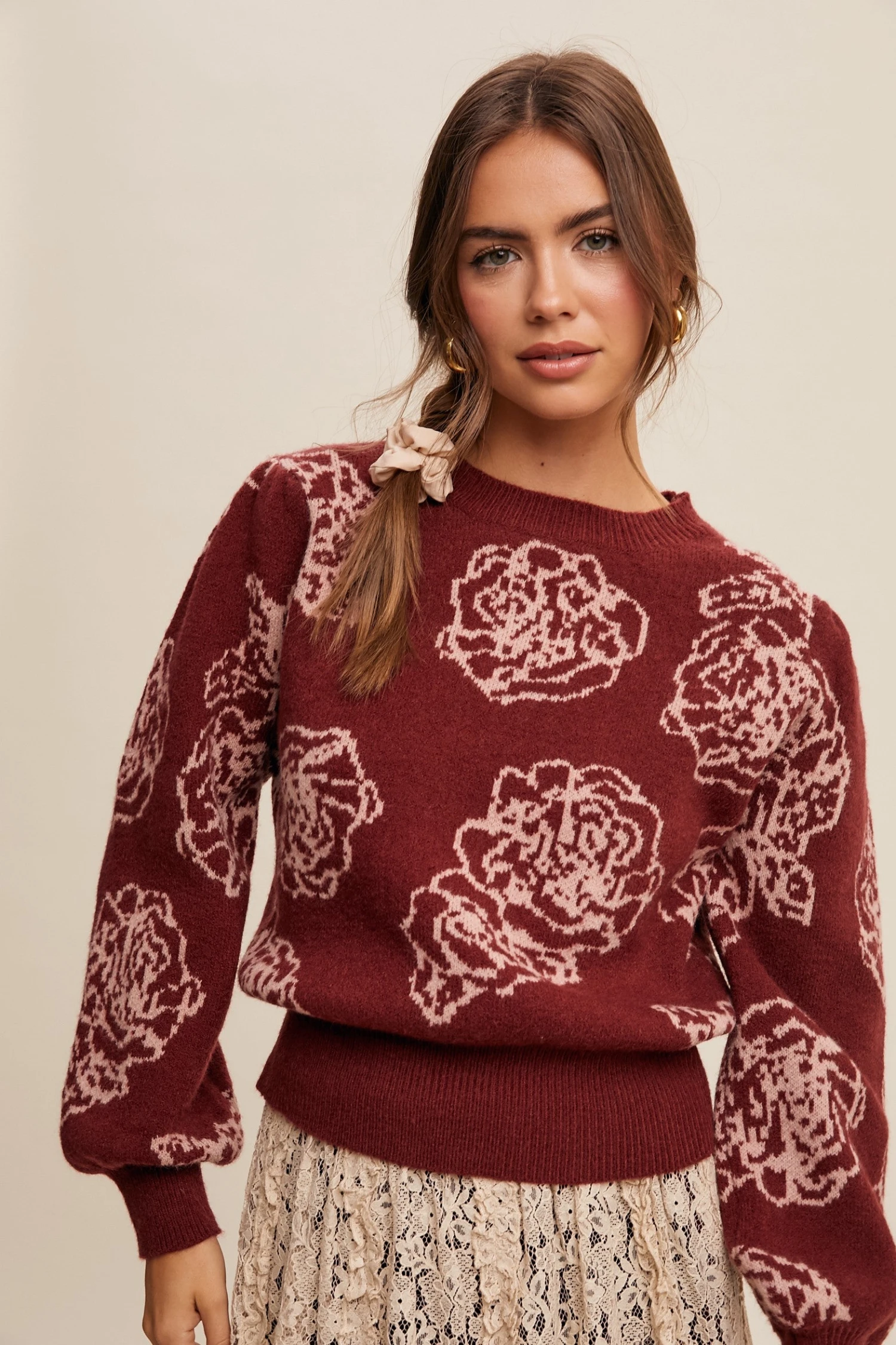 Rounded neck sweater in crimson red with an ivory floral pattern. This is a loose style, hitting below the waist/ above the hips. The sleeves has pleats at the shoulder and are long and full.