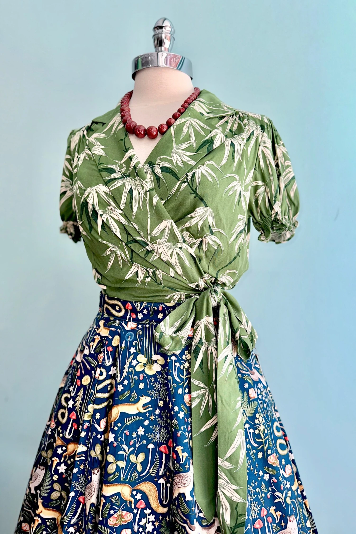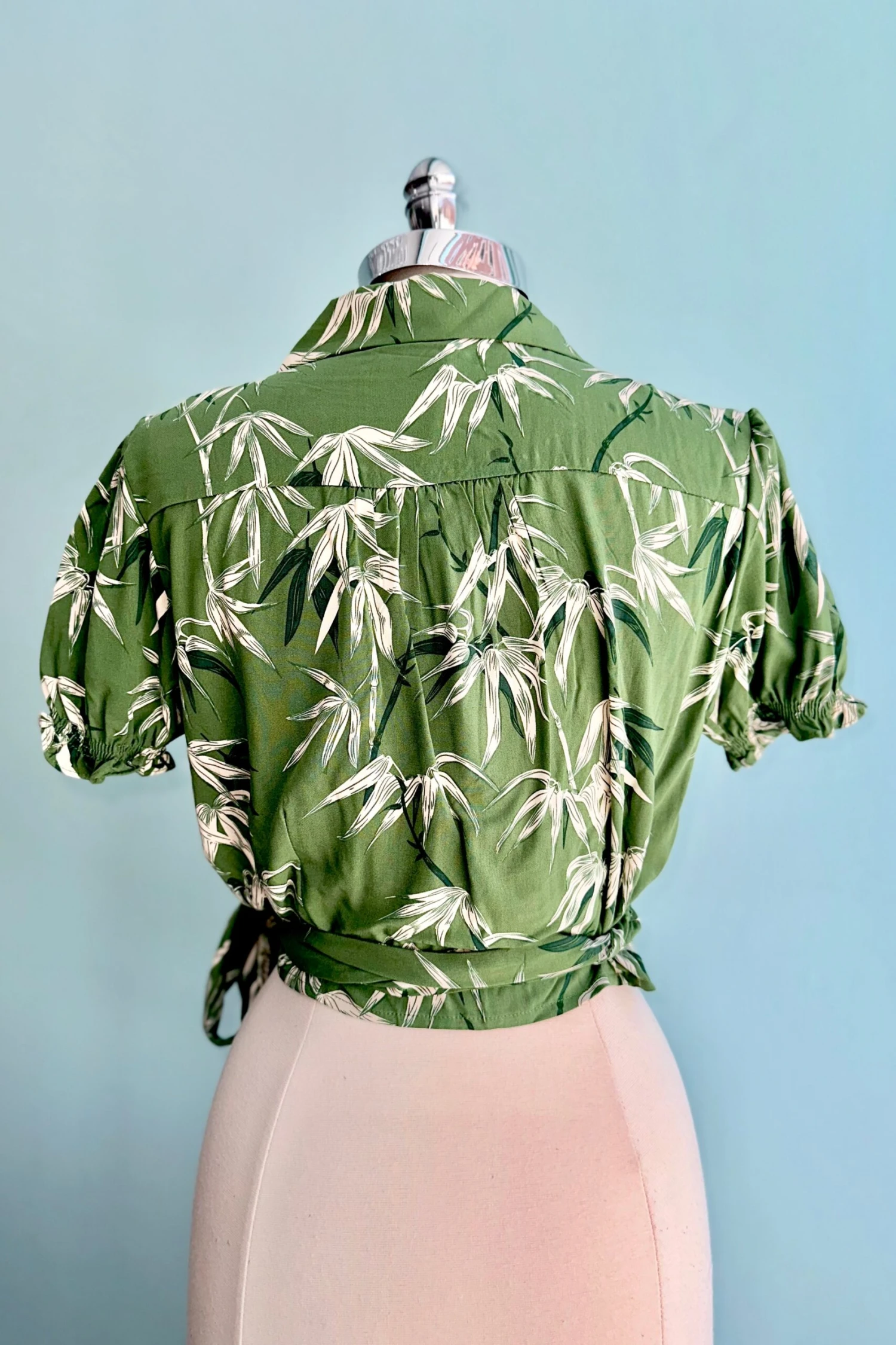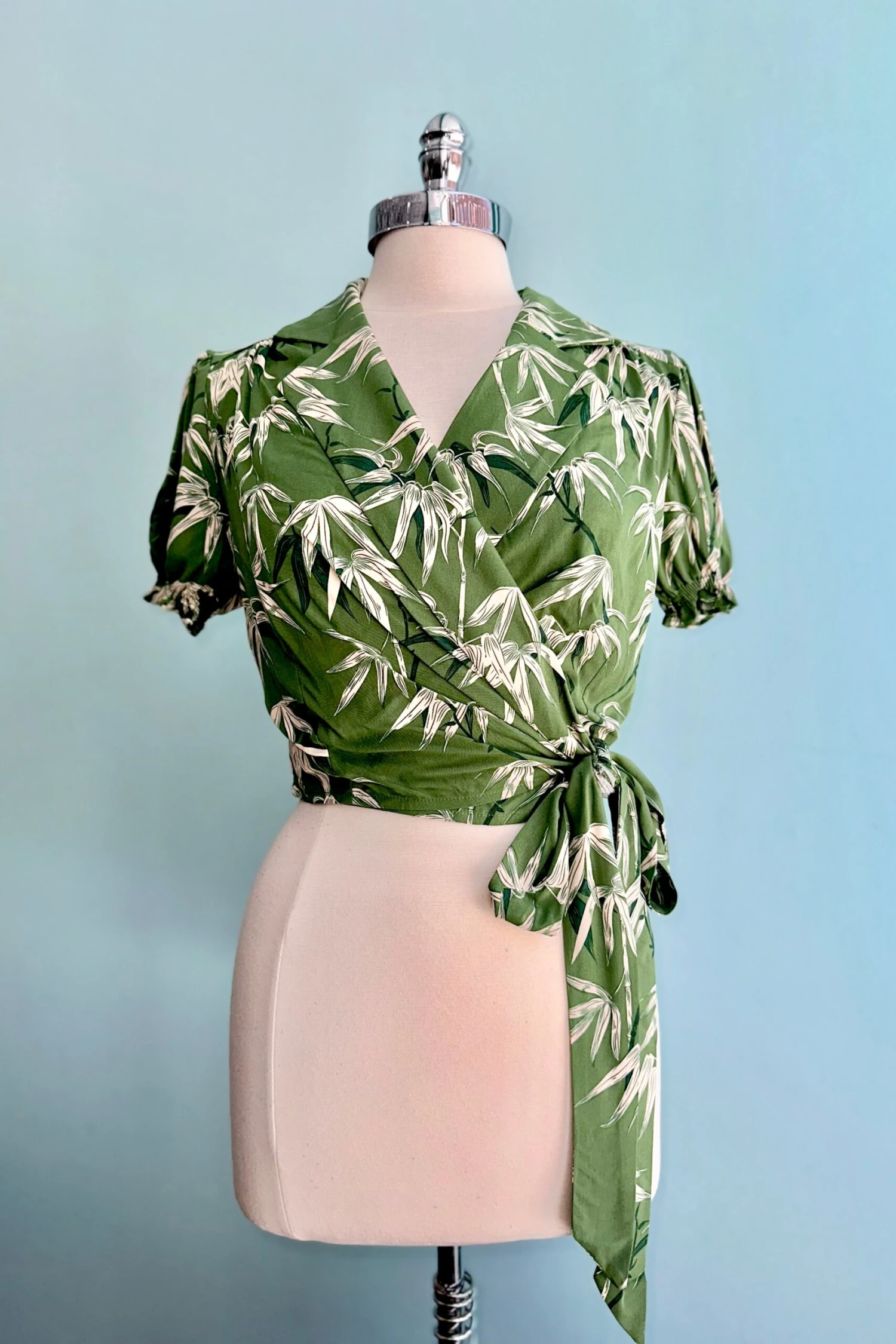 Wrap top in green with an off white bamboo print throughout. This top is a true wrap with ties that fasten at the waist. The neckline has a fold over collar. The sleeves are short and puffed with an elastic hem.
