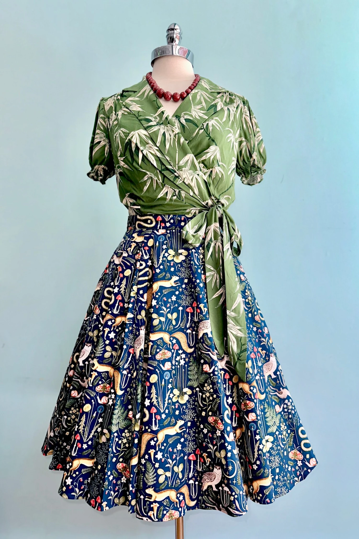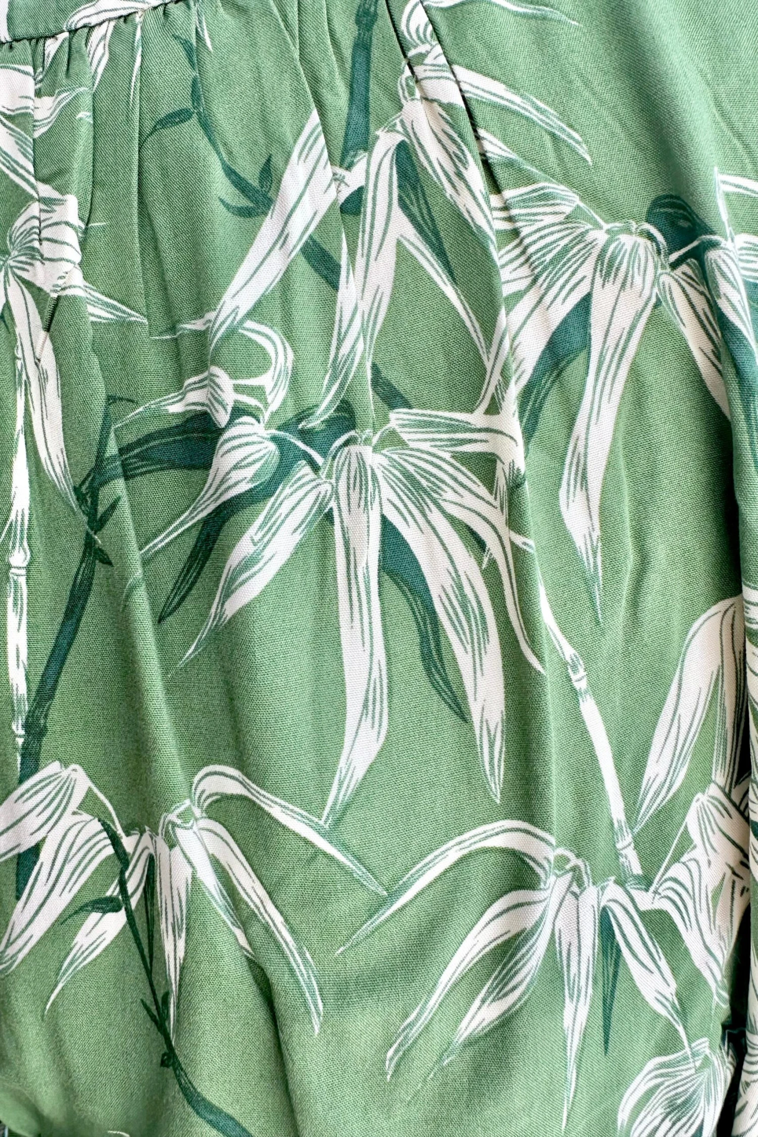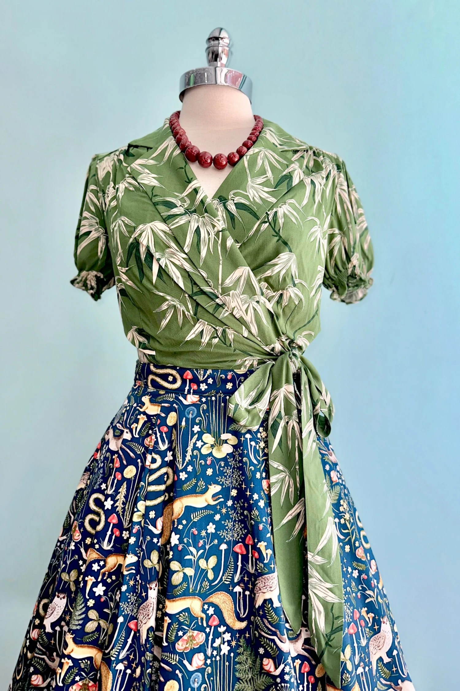 Wrap top in green with an off white bamboo print throughout. This top is a true wrap with ties that fasten at the waist. The neckline has a fold over collar. The sleeves are short and puffed with an elastic hem.