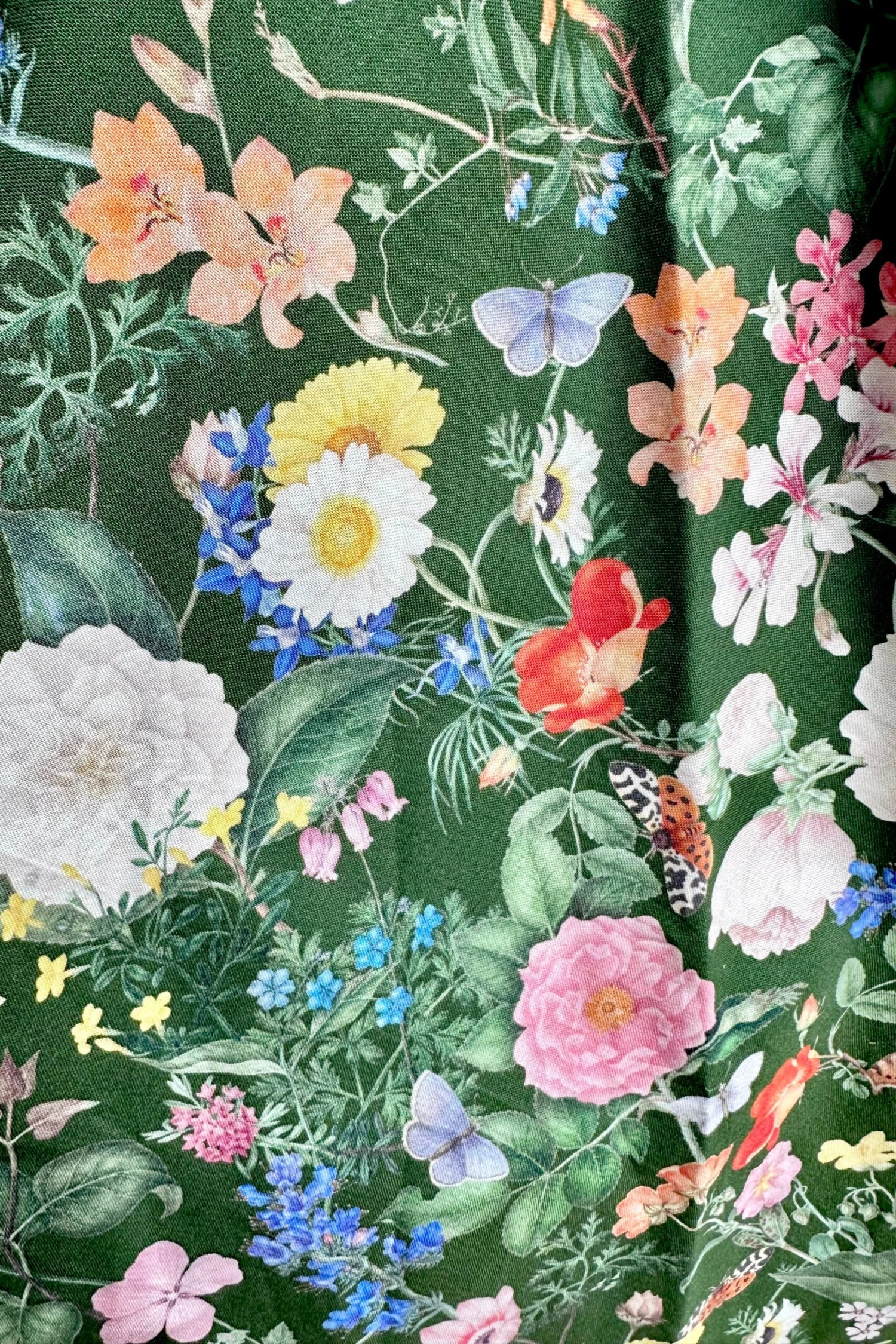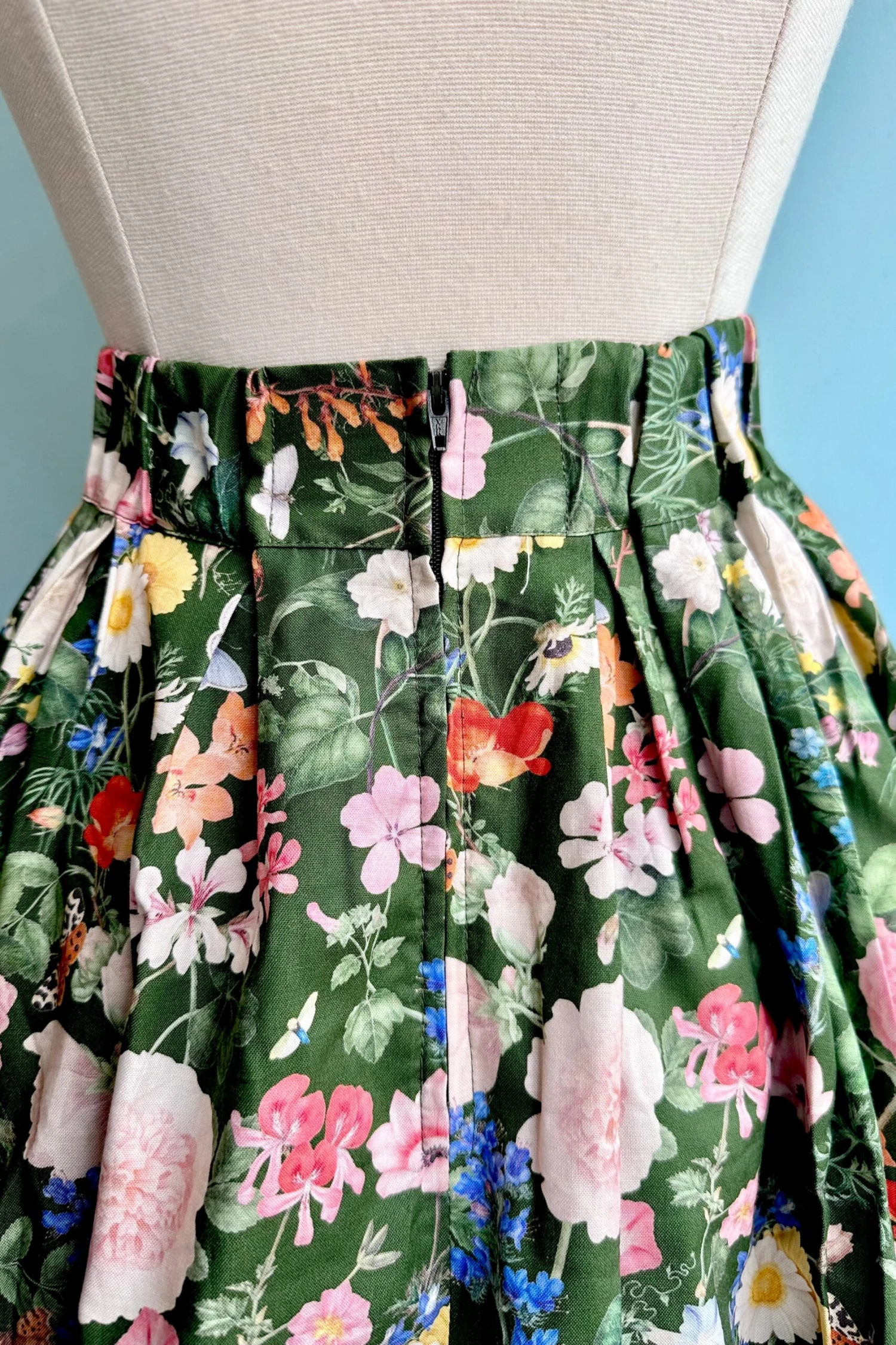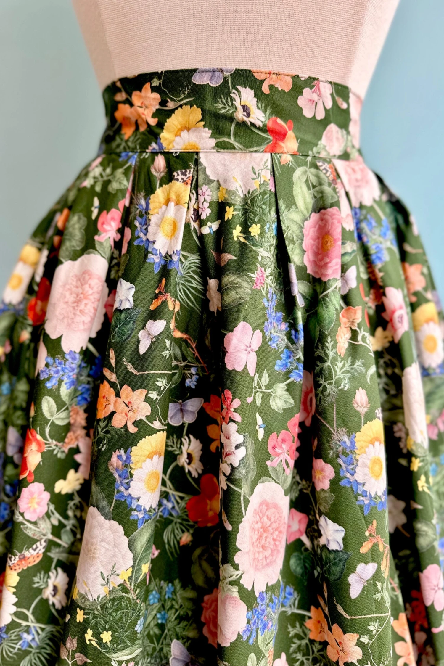 Full skirt in a stunning fabric of peach, blue and red flowers on a forest green background. This skirt is 100% cotton and has an elasticized back waistband for ease of wear! Doris has a full pleated skirt with hidden side pockets, and a back zippered closure. Doris is made in a longer length so she can accentuate all your vintage-inspired outfits!
